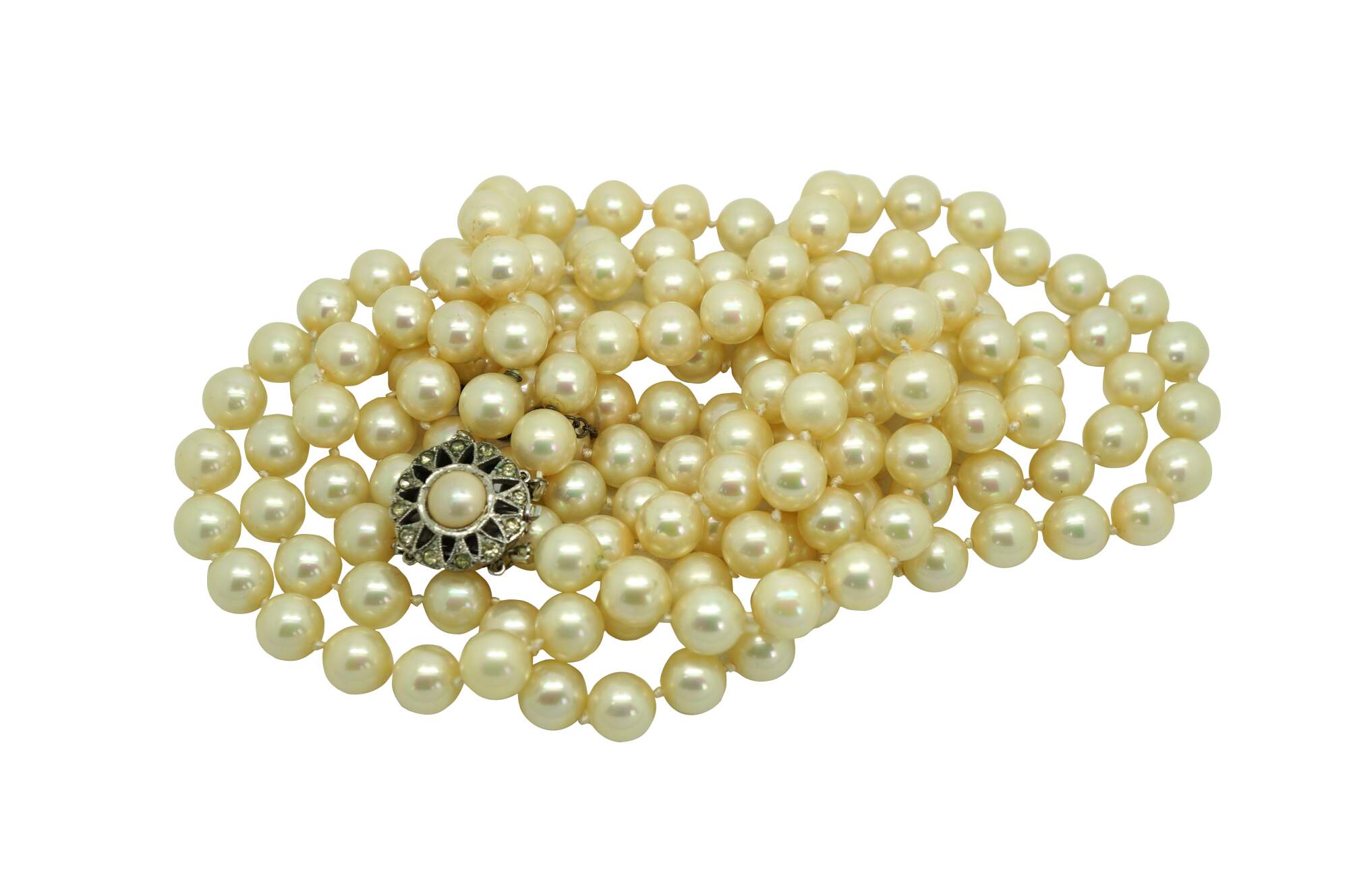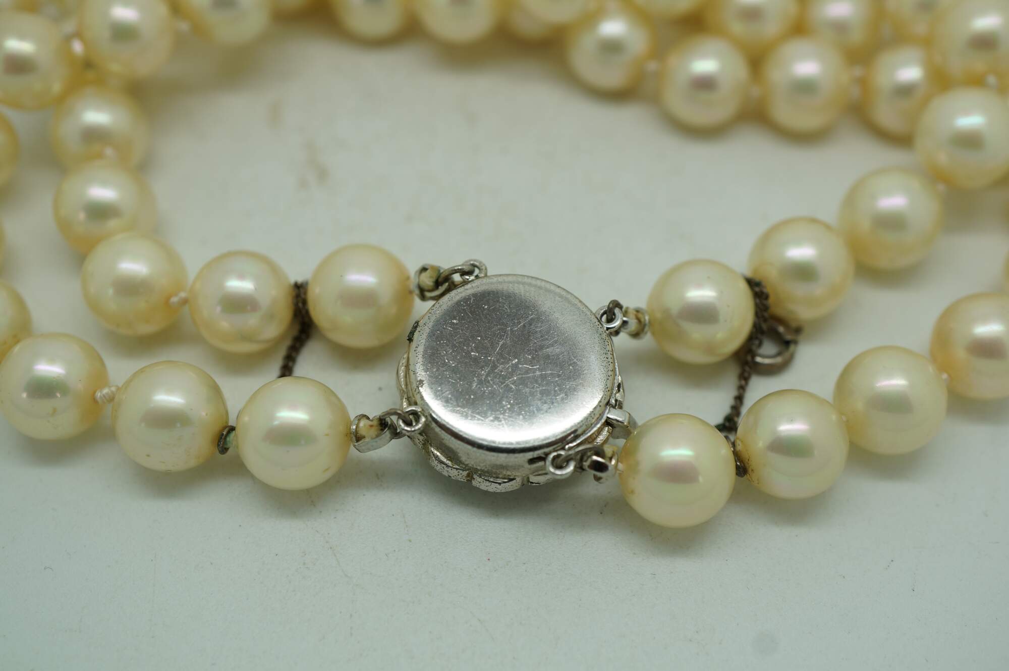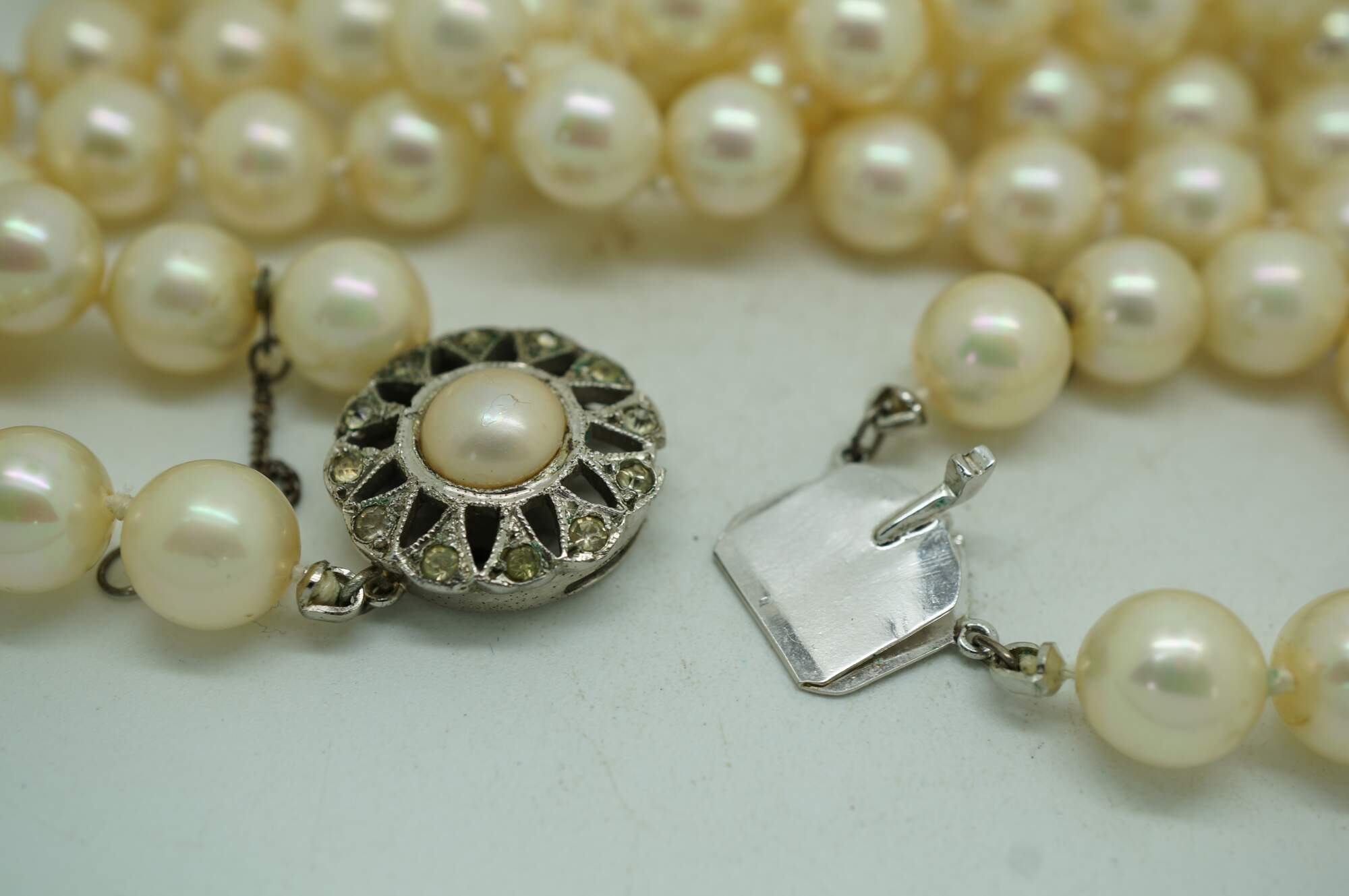 Vintage double strand necklace crafted of heavy cream-colored faux pearls, knotted between each bead and secured with a sunburst-shaped clasp studded with white rhinestones.