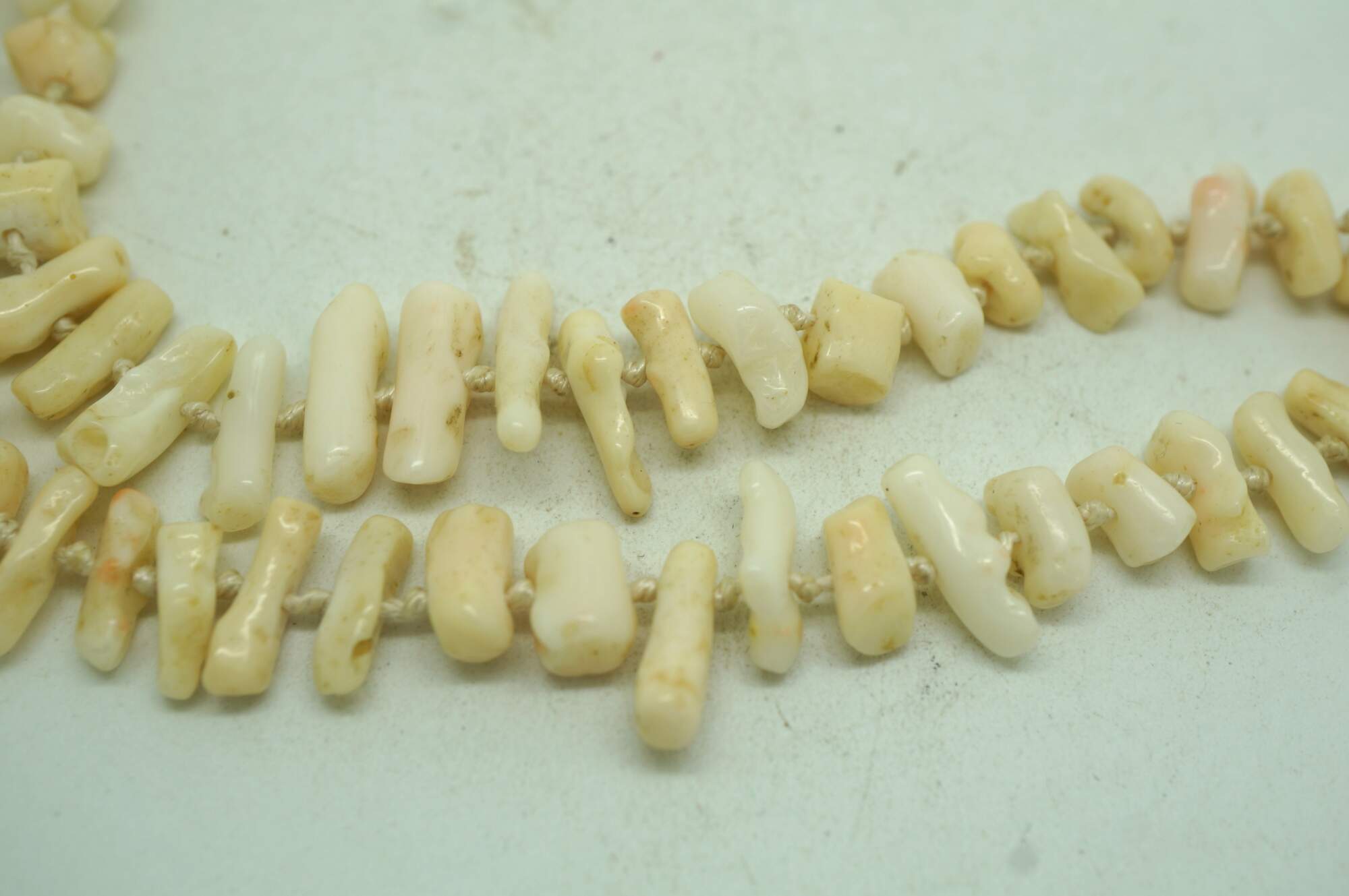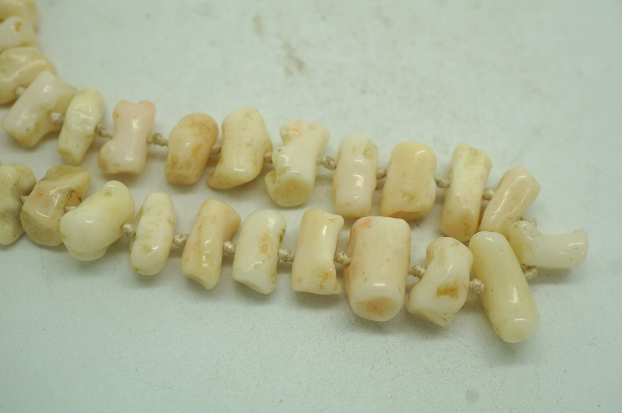 Vintage necklace crafted of graduated beads of white blush / angel skin branch coral - off white coloration with hints of peachy pink - knotted between each bead. Single strand, no clasp.