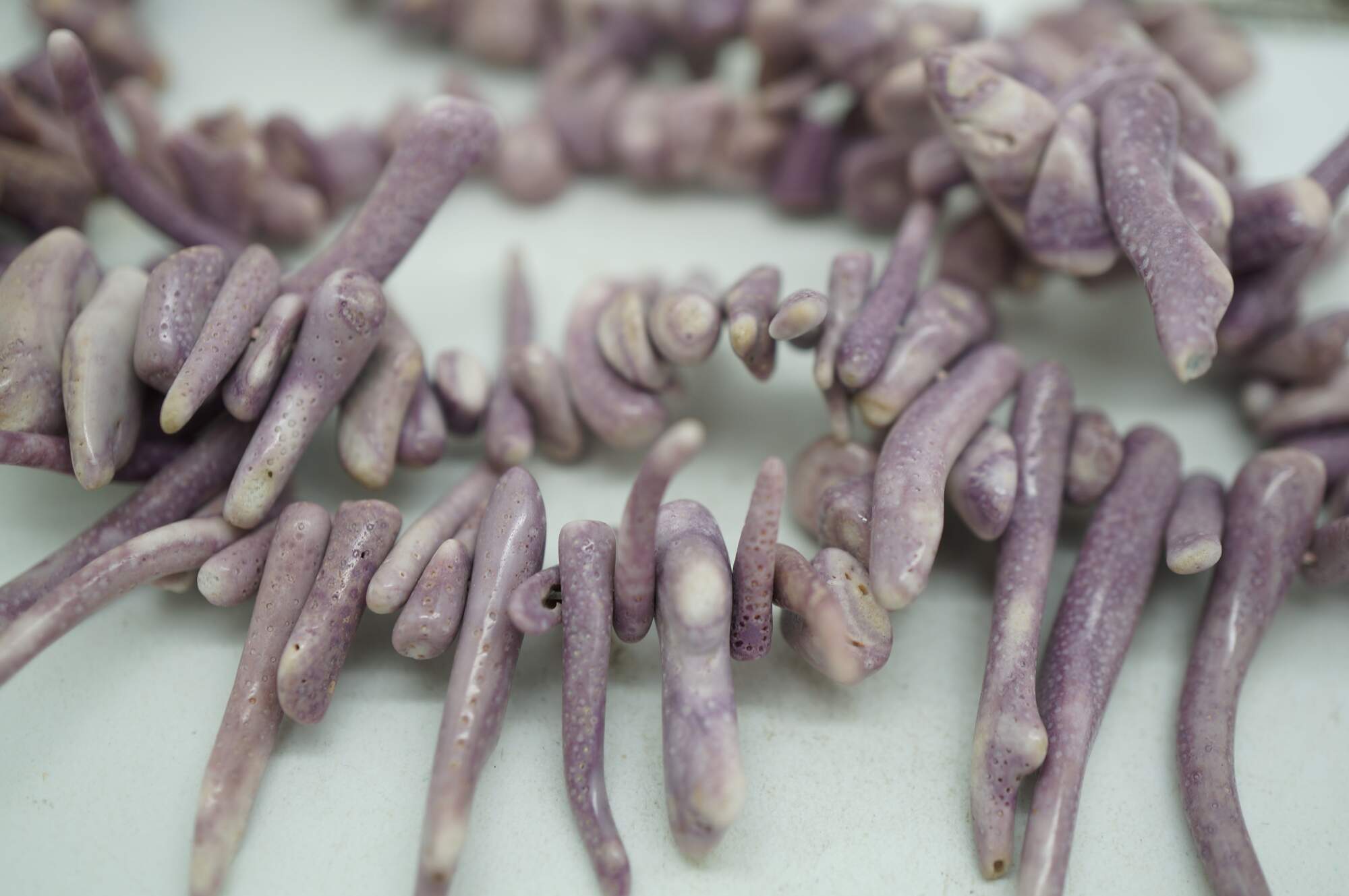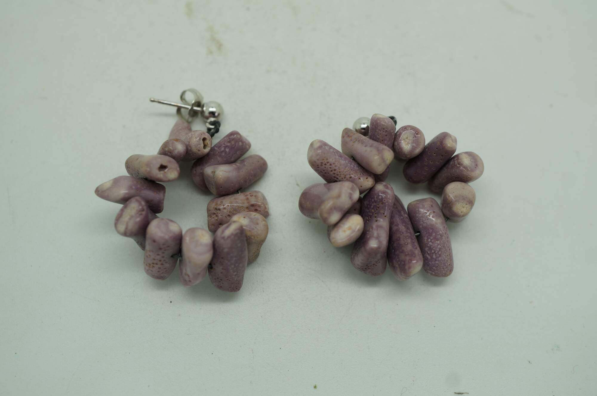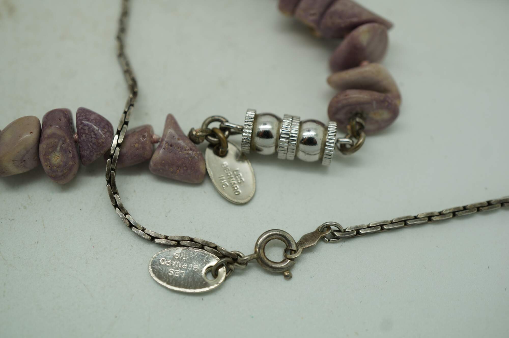 Vintage 20th century set of Les Bernard jewelry including two necklaces of graduated purple / lavender branch coral beads and a pair of matching post-back dangle earrings. Sterling silver clasps.