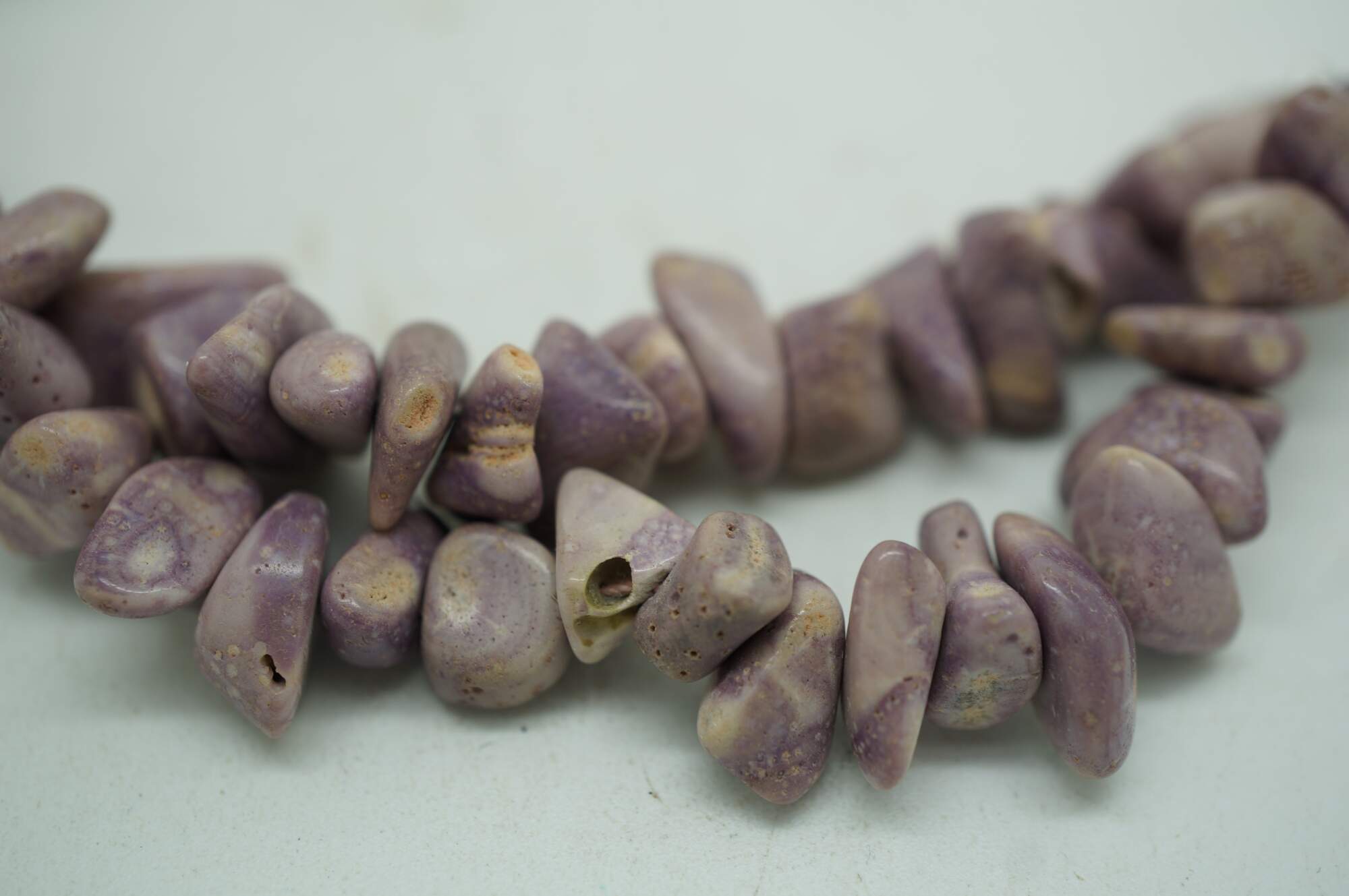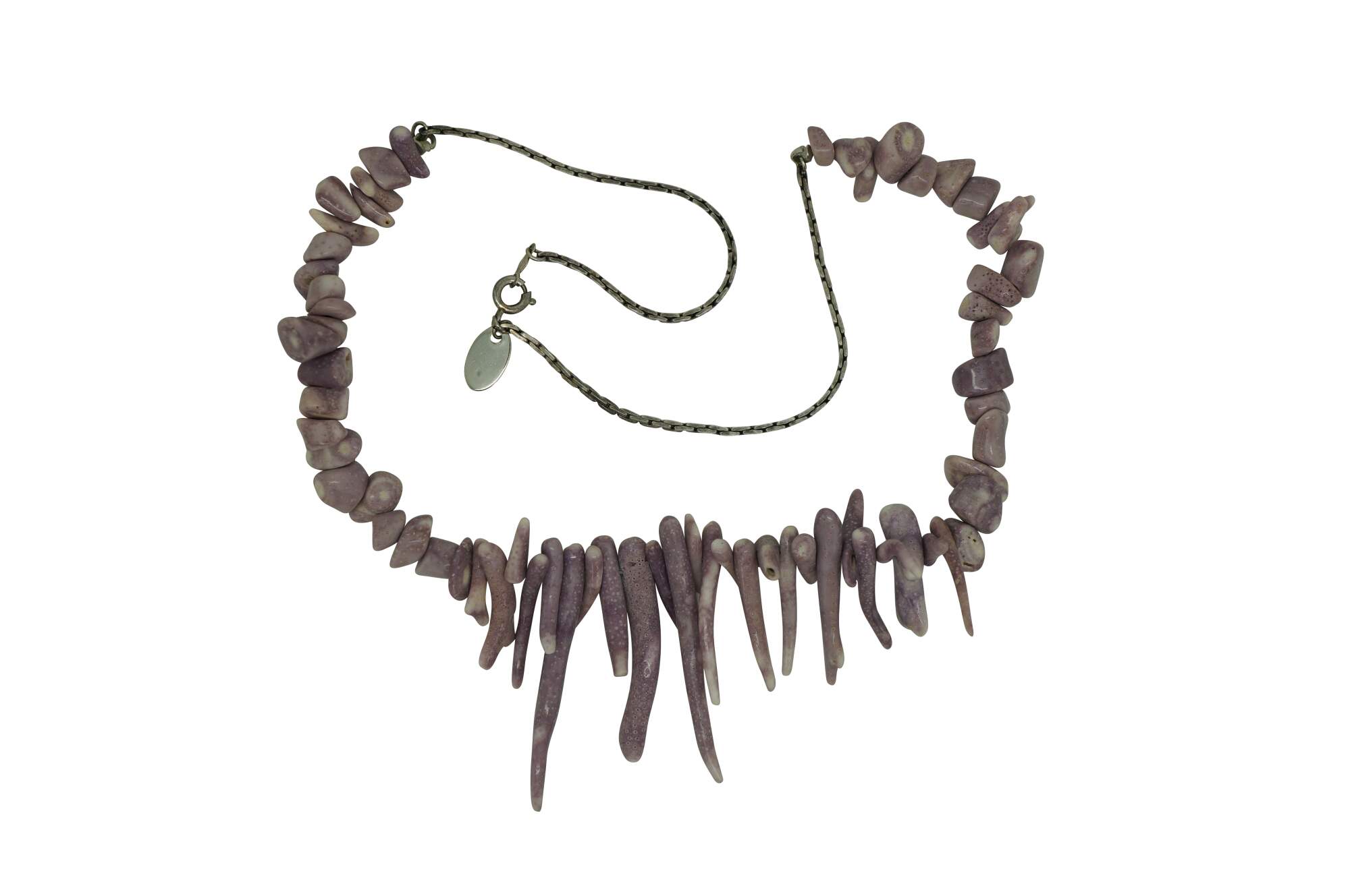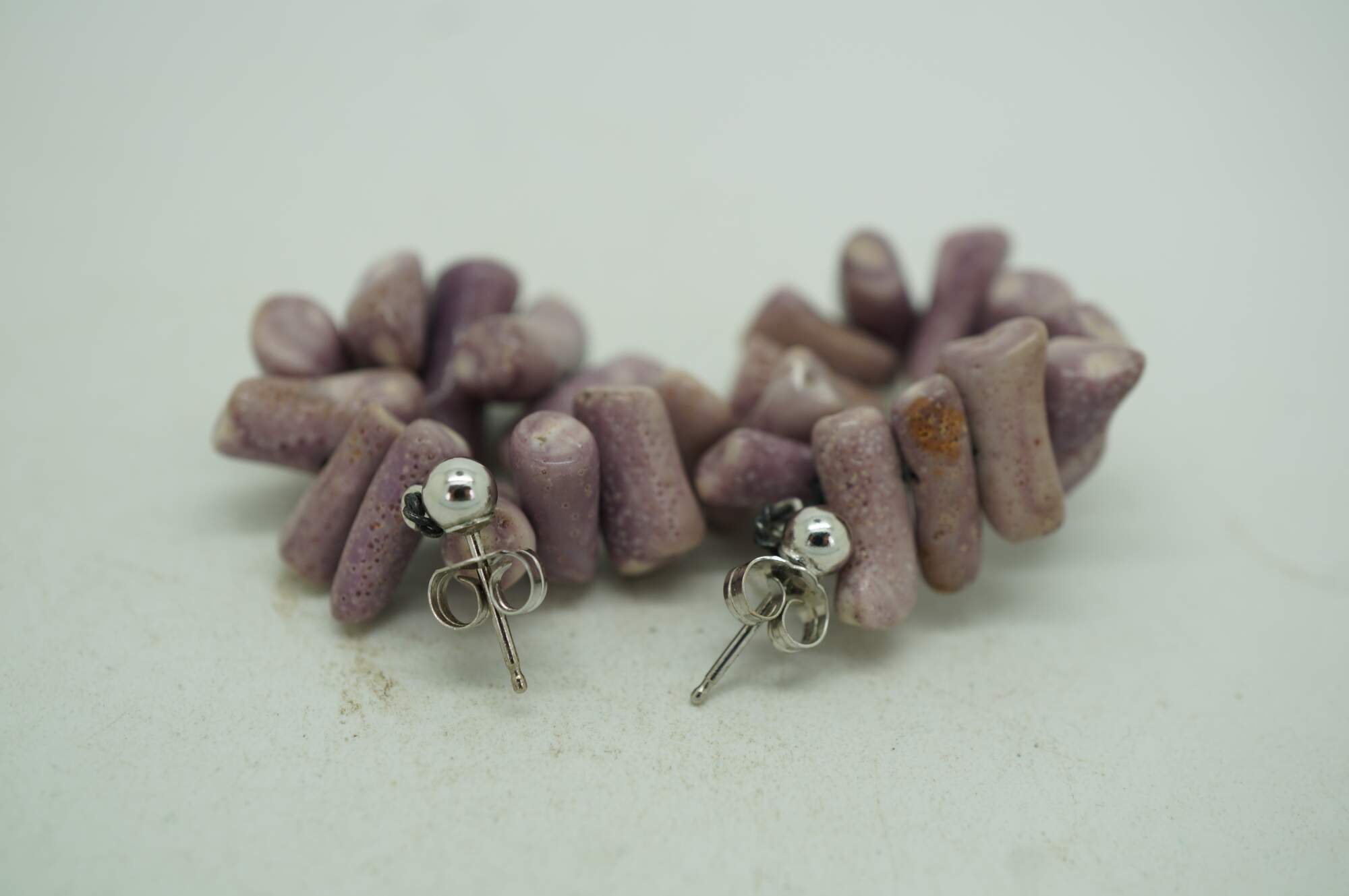 Vintage 20th century set of Les Bernard jewelry including two necklaces of graduated purple / lavender branch coral beads and a pair of matching post-back dangle earrings. Sterling silver clasps.