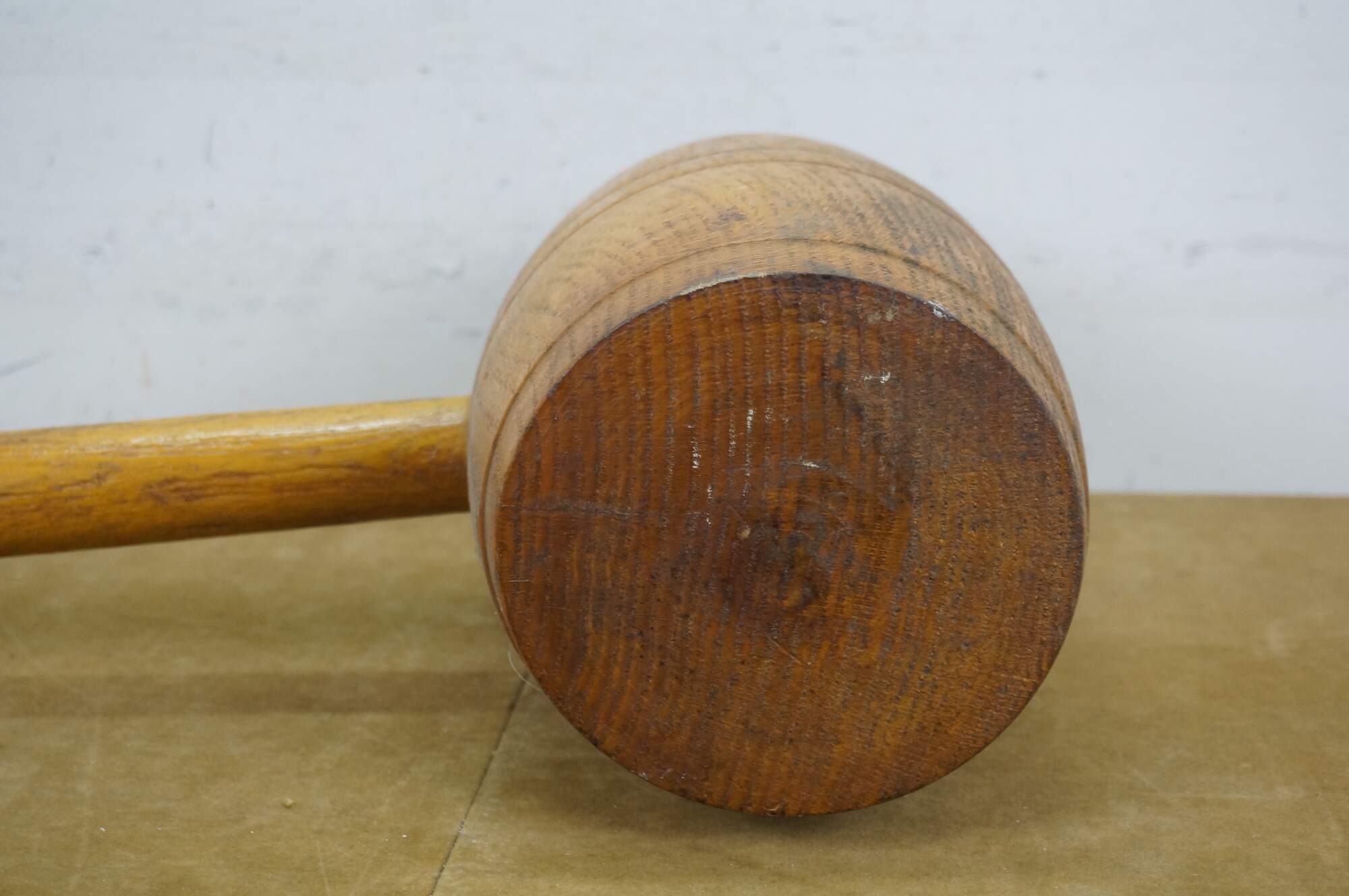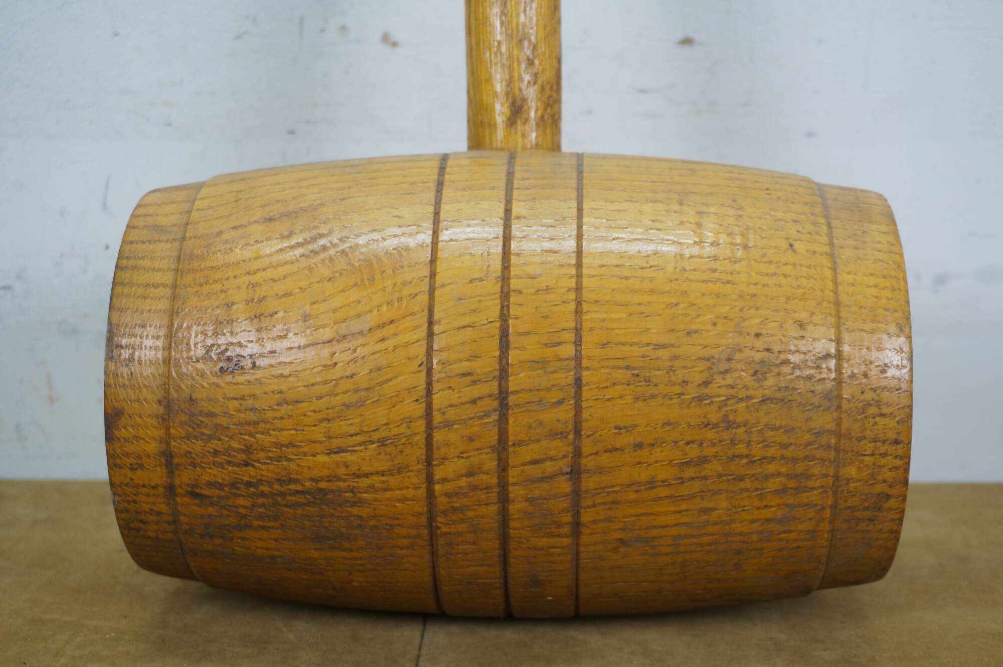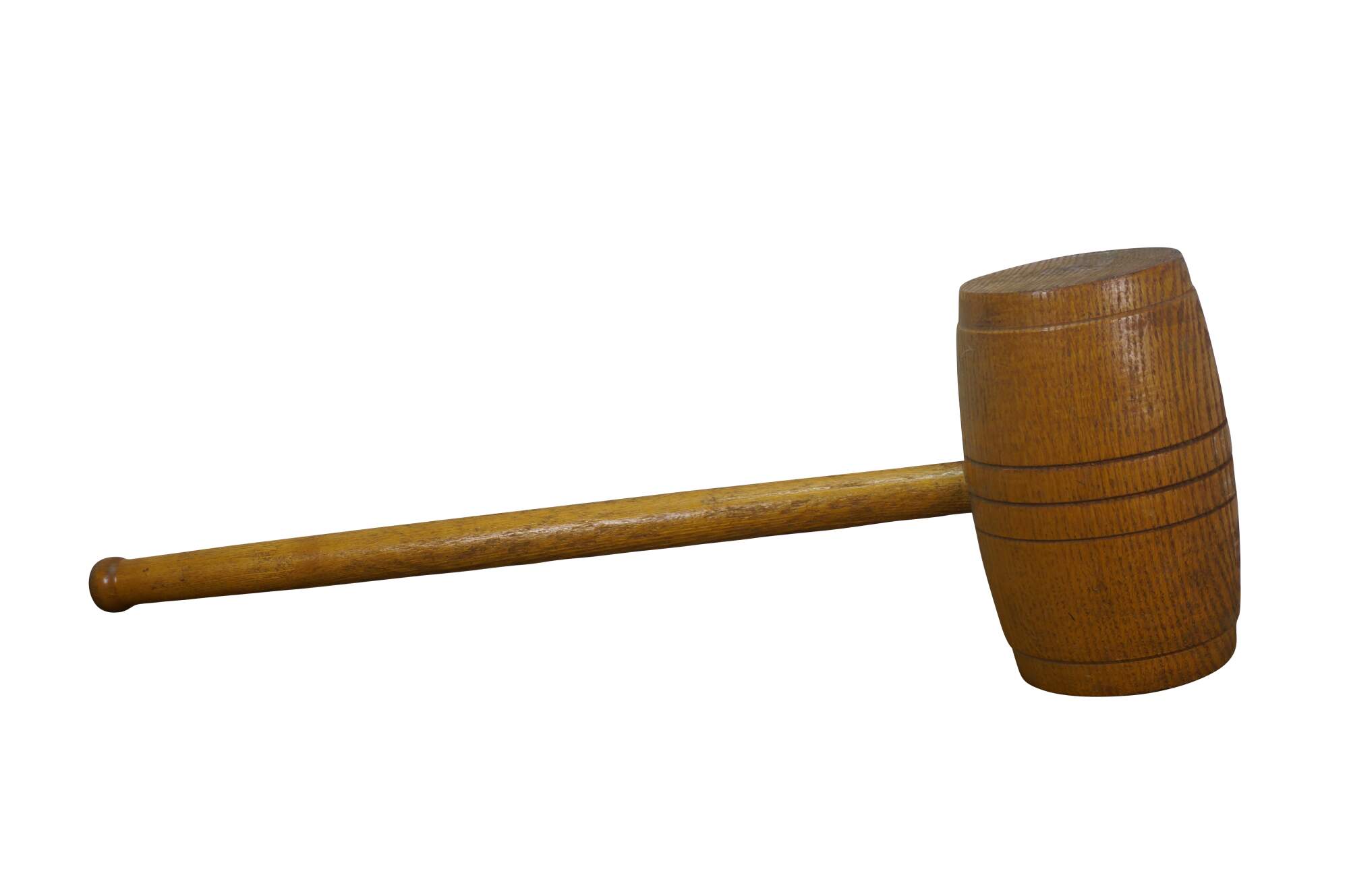 Vintage 20th-century oversized wooden mallet / hammer / sledge of the type used in strongman acts or attractions at a carnival / circus / or a novelty judges’ gavel for law and justice. Grooved head slightly resembles a barrel.