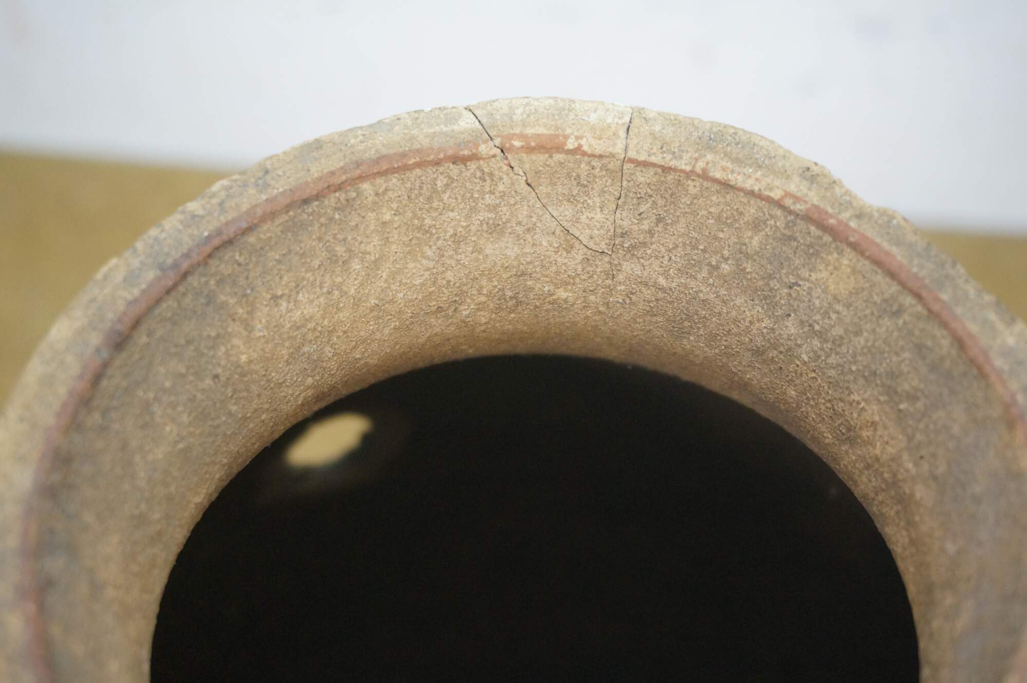 Antique un-glazed earthenware pitcher / jug , decorated around the neck with a trio of dark lines.