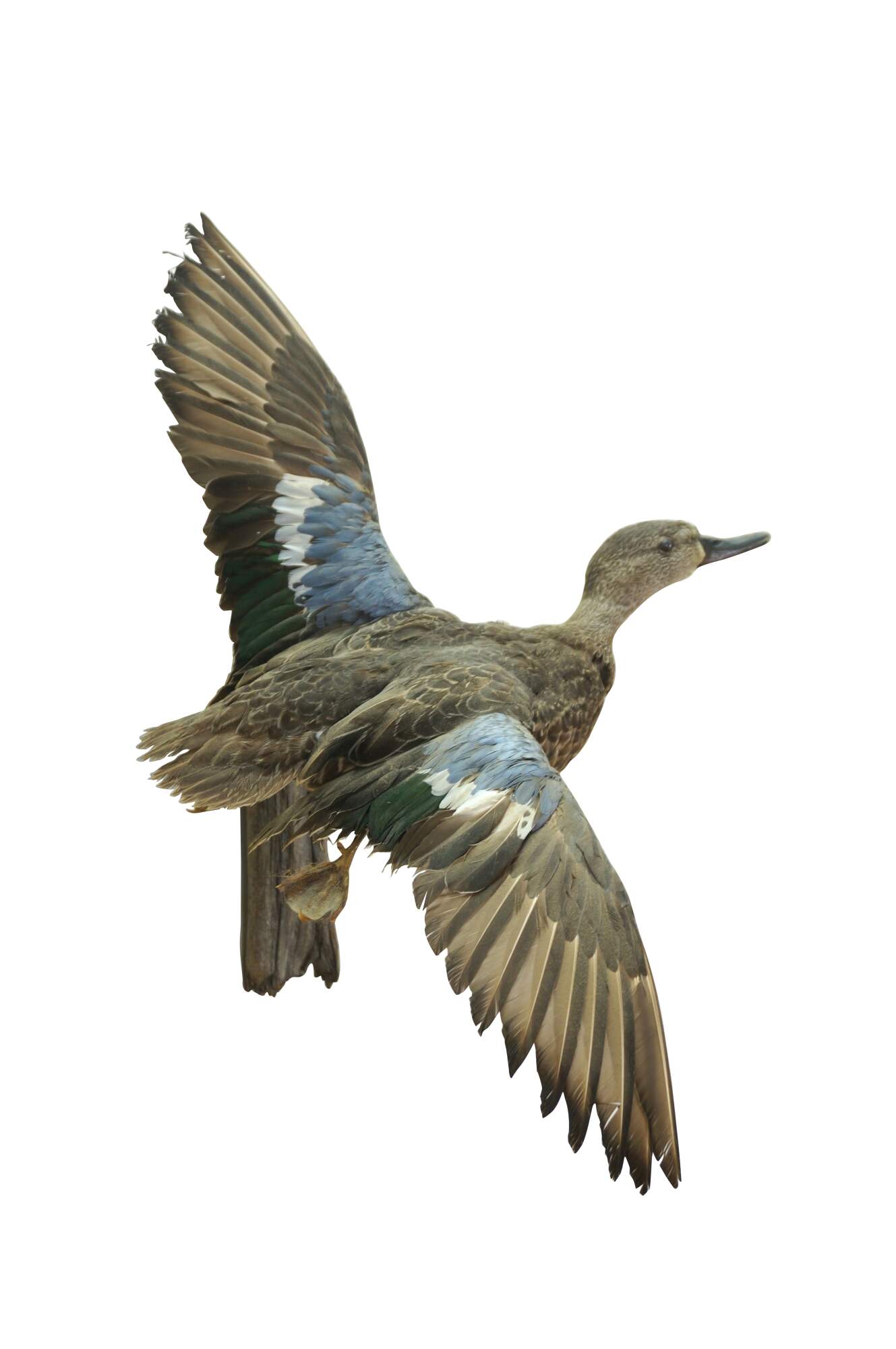 Vintage Blue Wing Teal Drake Duck waterfowl game bird taxidermy mount featuring the duck in flight on driftwood plaque.