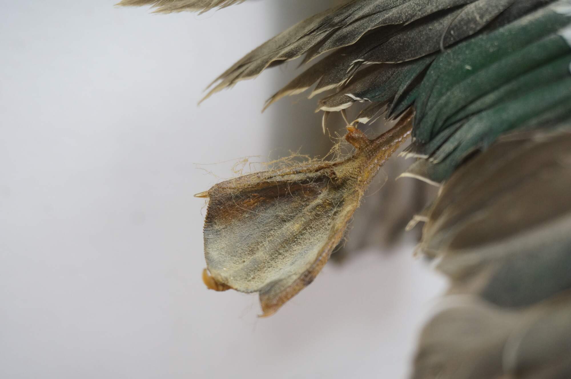Fair condition, wear and distressing from age, some damage to feathers, embedded dirt, separation