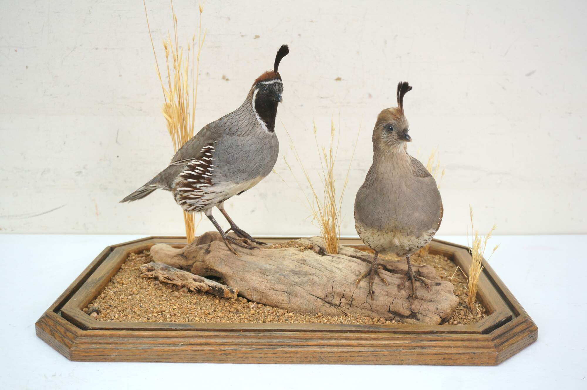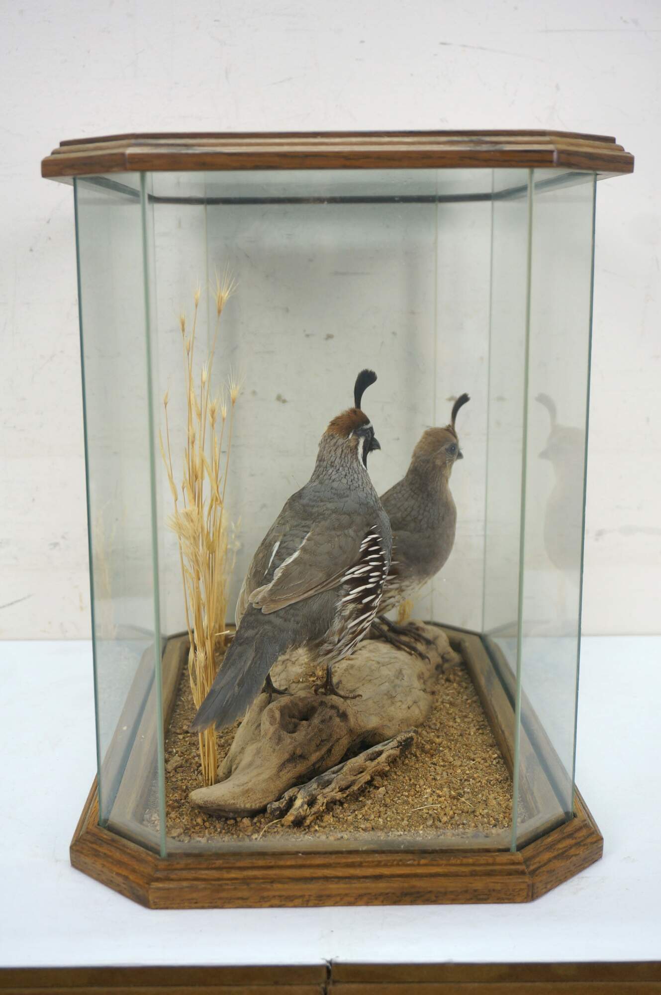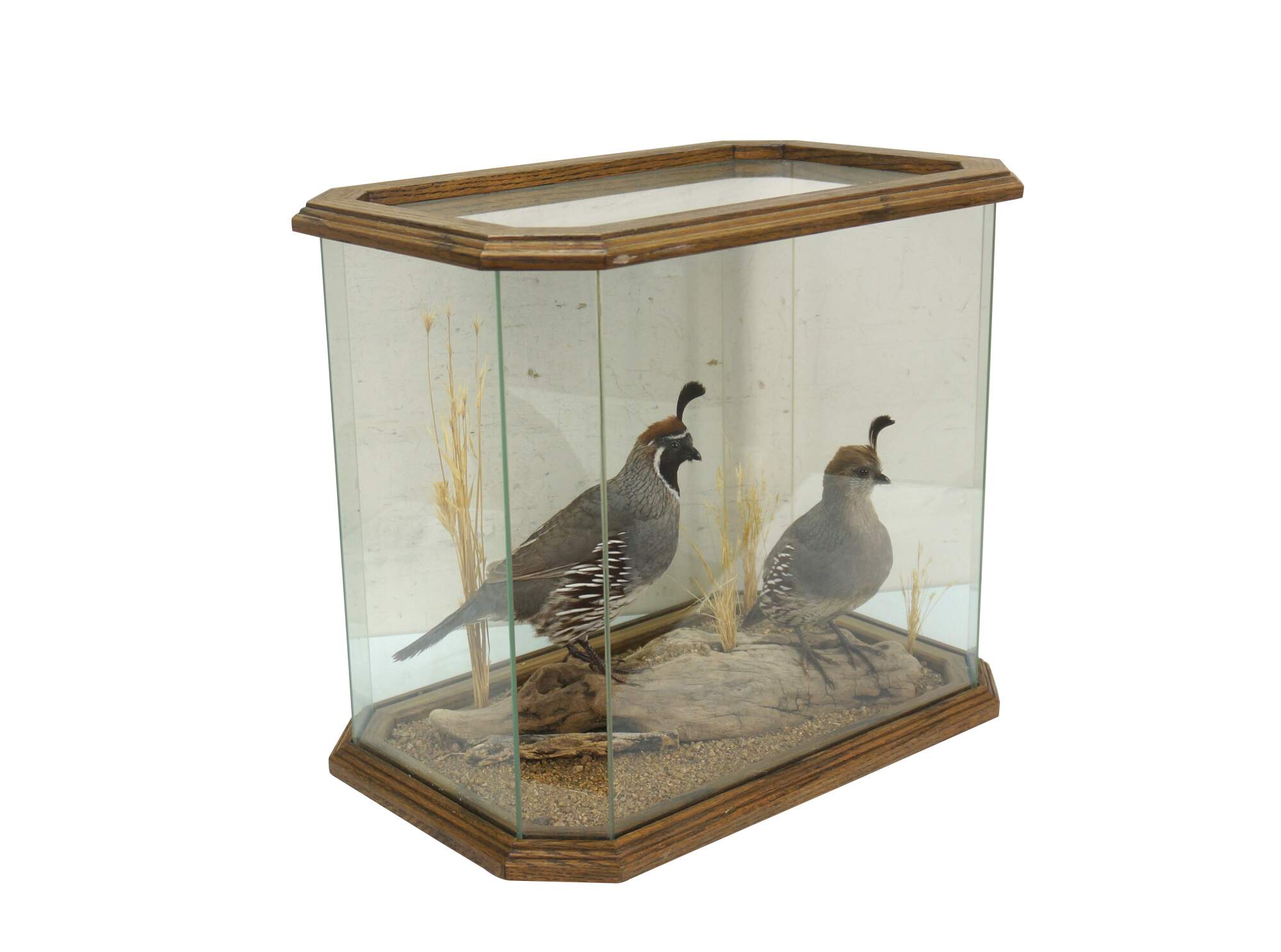 Vintage male and female cased Gambles Quail game bird taxidermy mount in octagonal oak and glass showcase with driftwood and foliage.