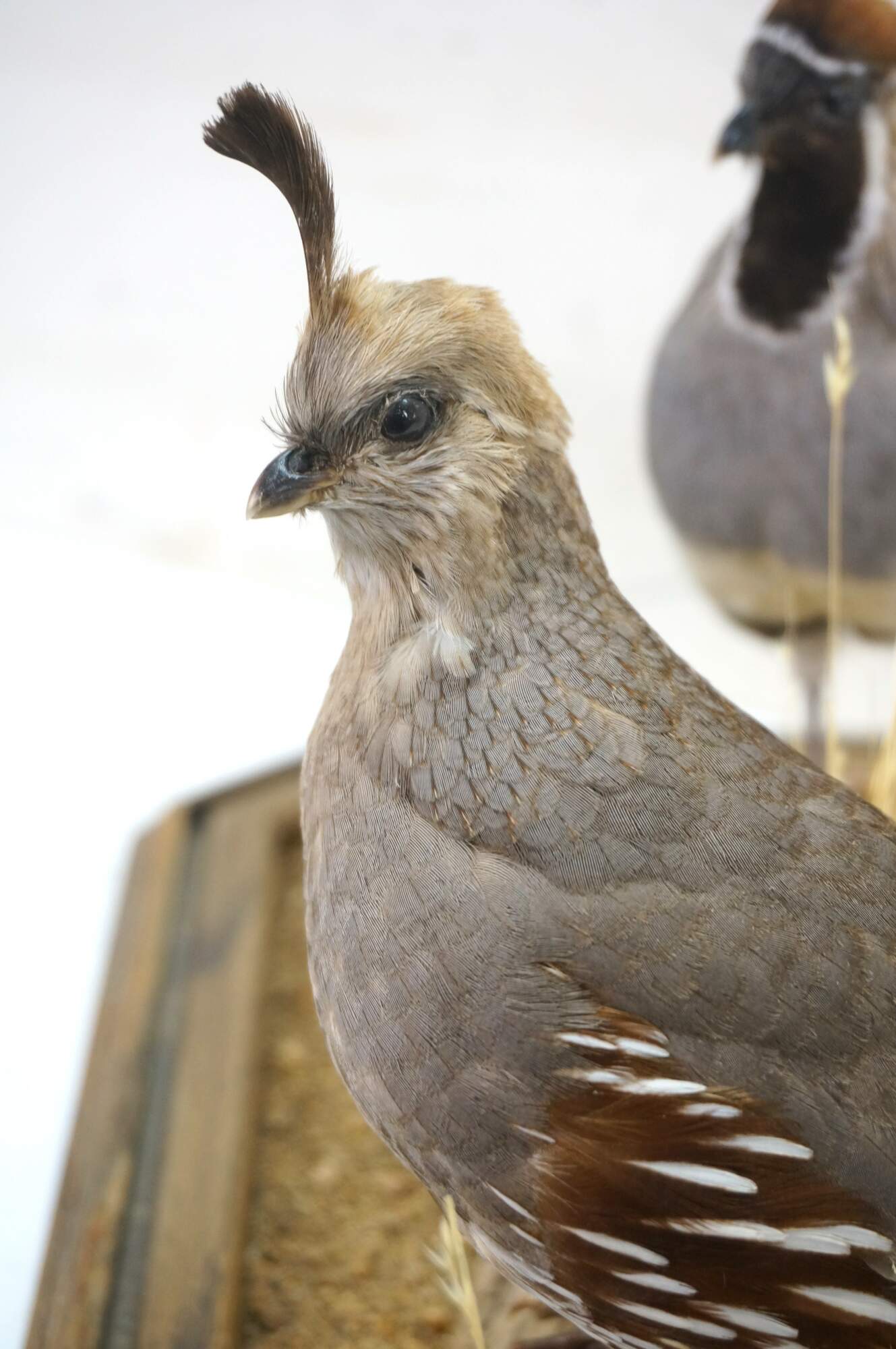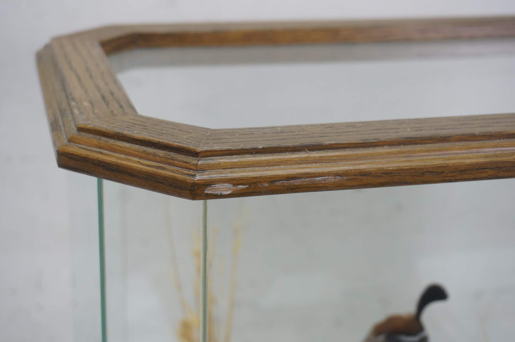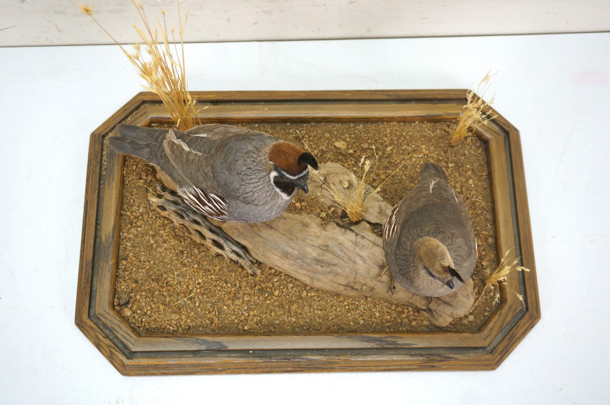 Vintage male and female cased Gambles Quail game bird taxidermy mount in octagonal oak and glass showcase with driftwood and foliage.