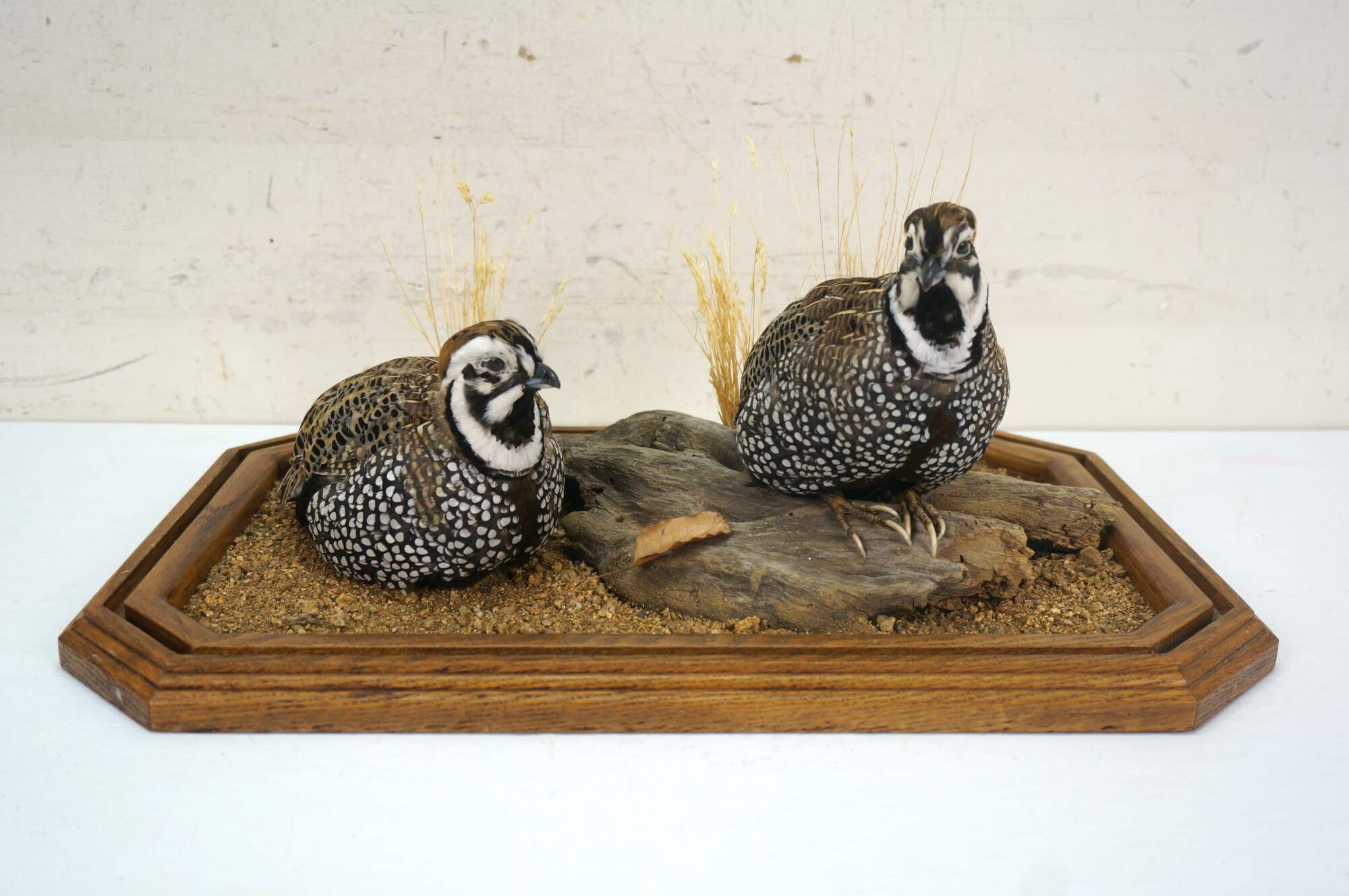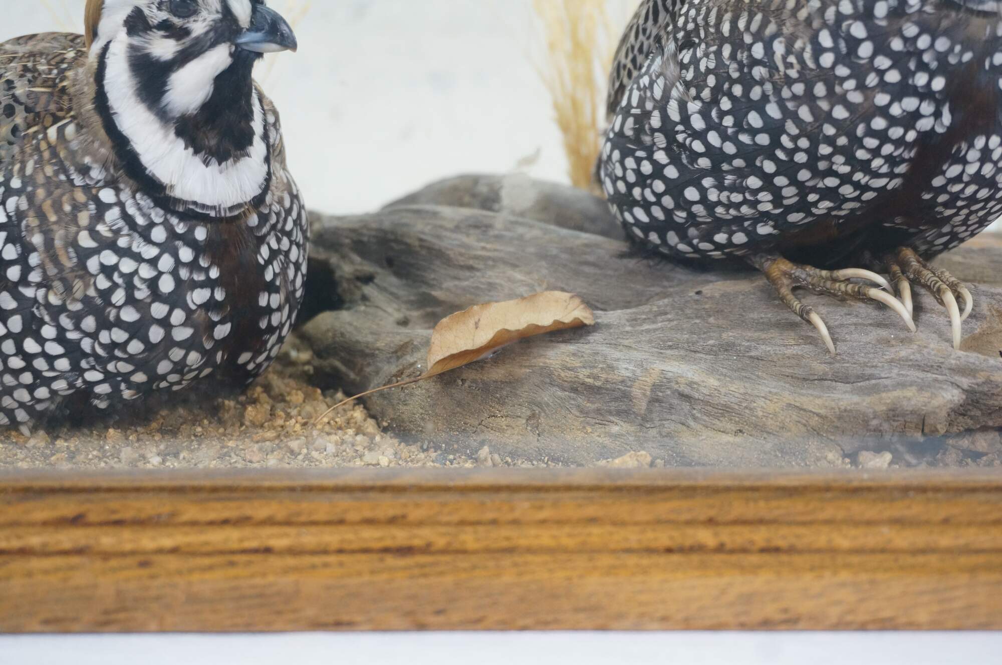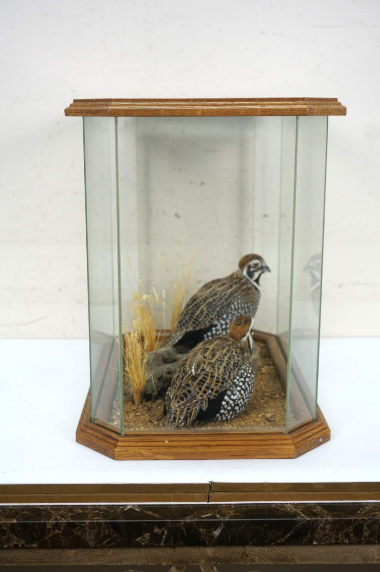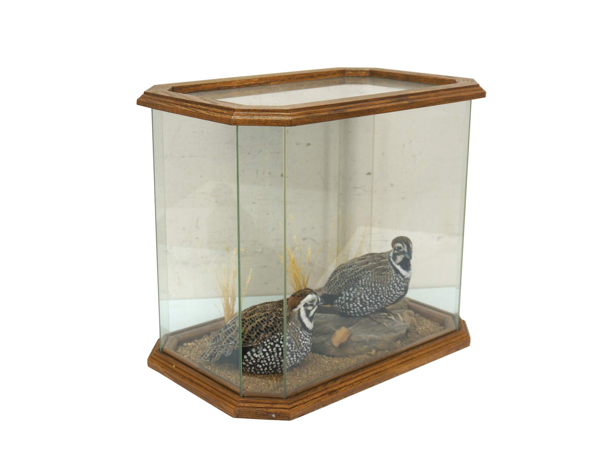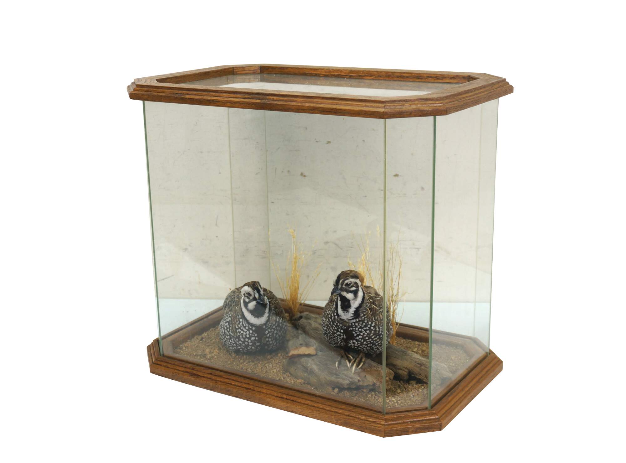 Vintage male and female cased Merns Quail game bird taxidermy mount in octagonal oak and glass showcase with driftwood and foliage.