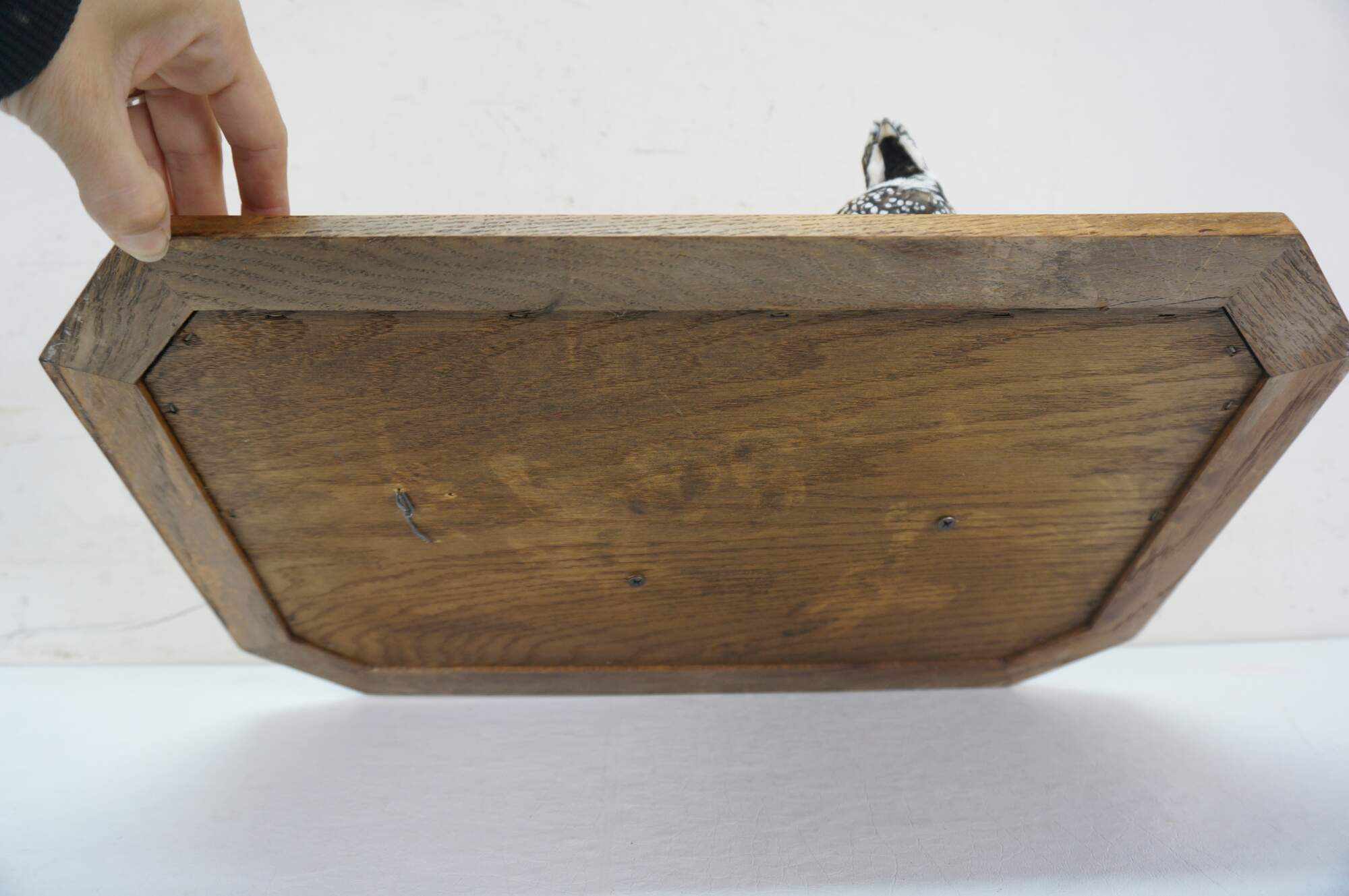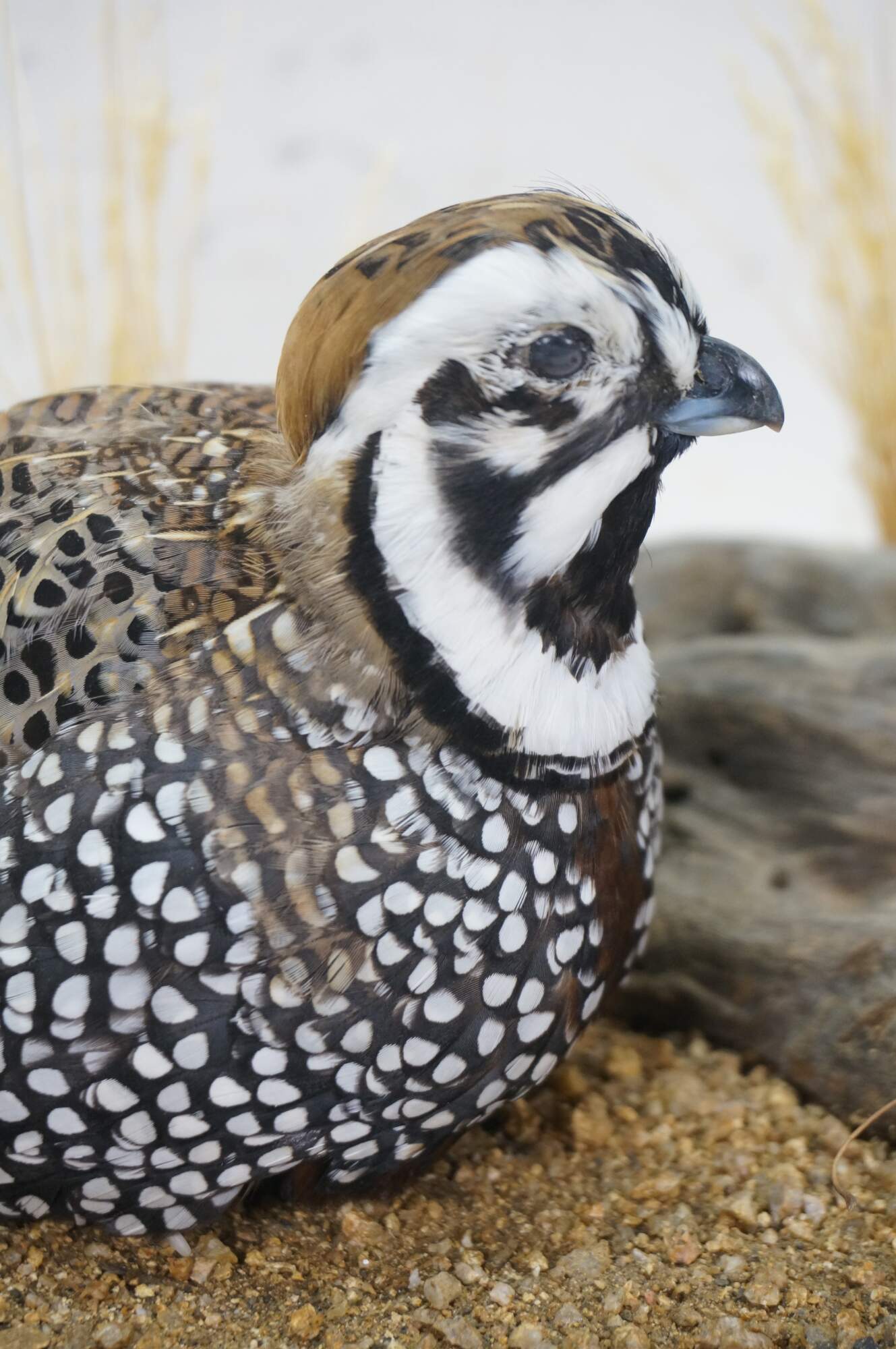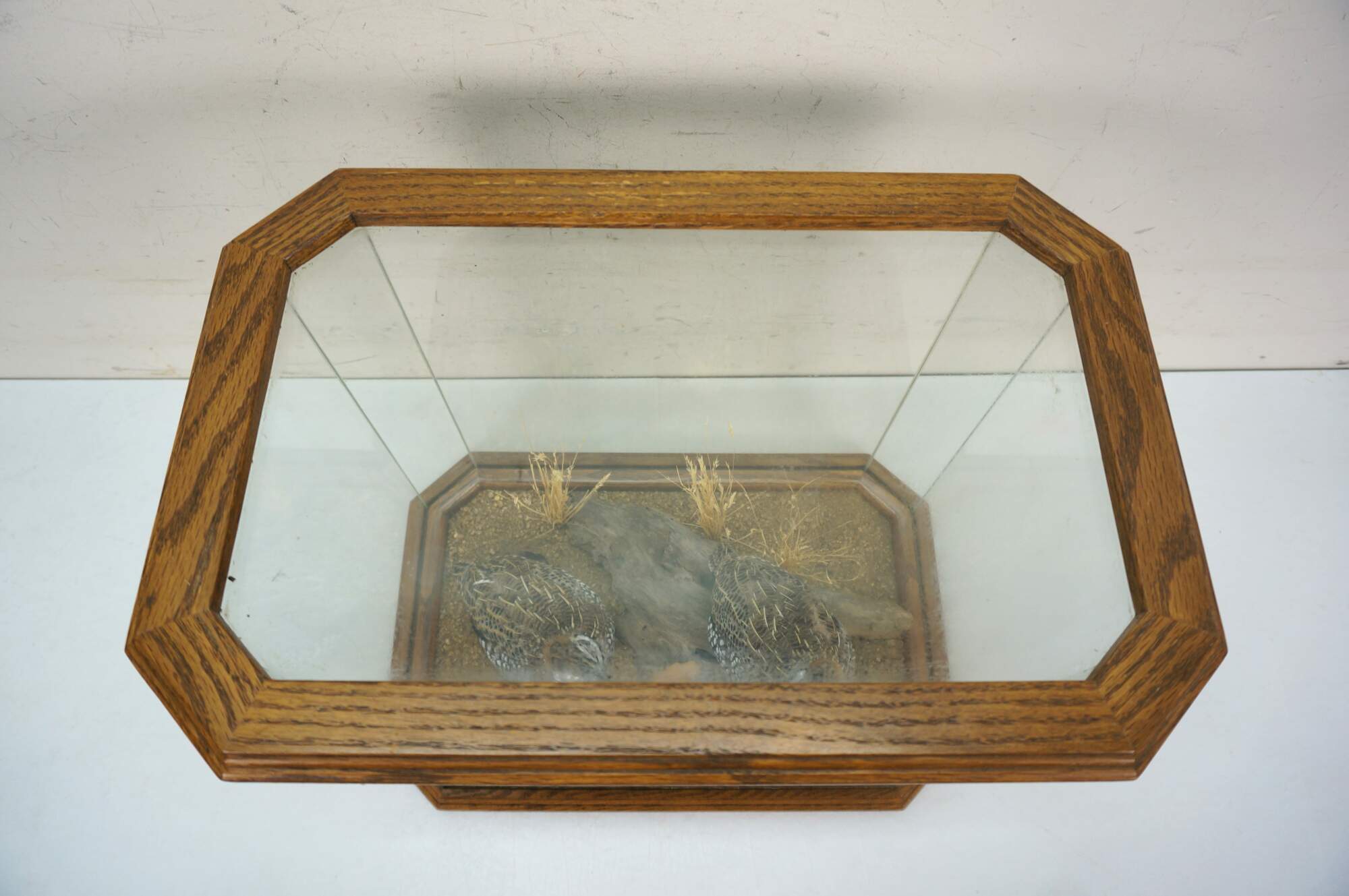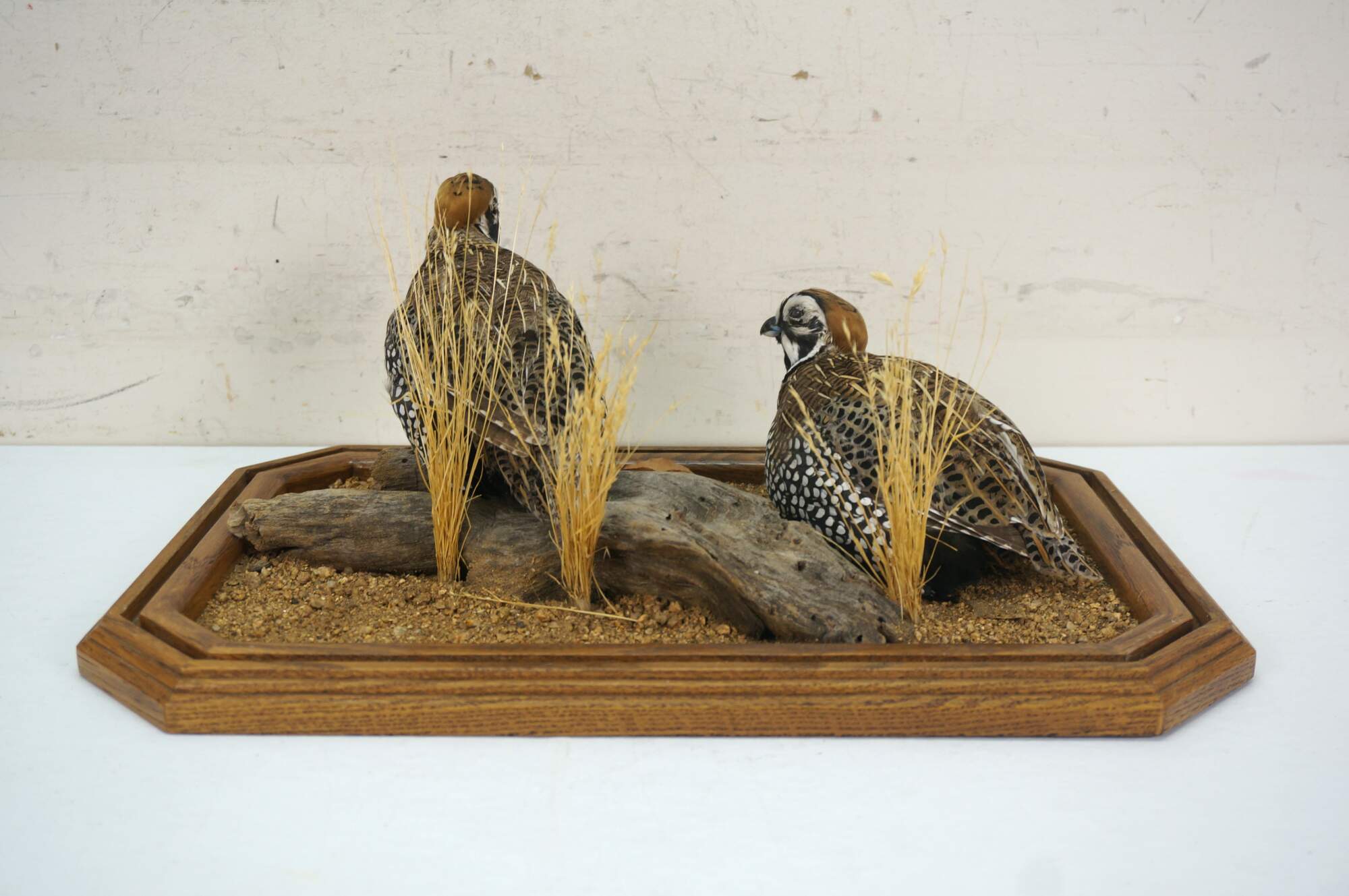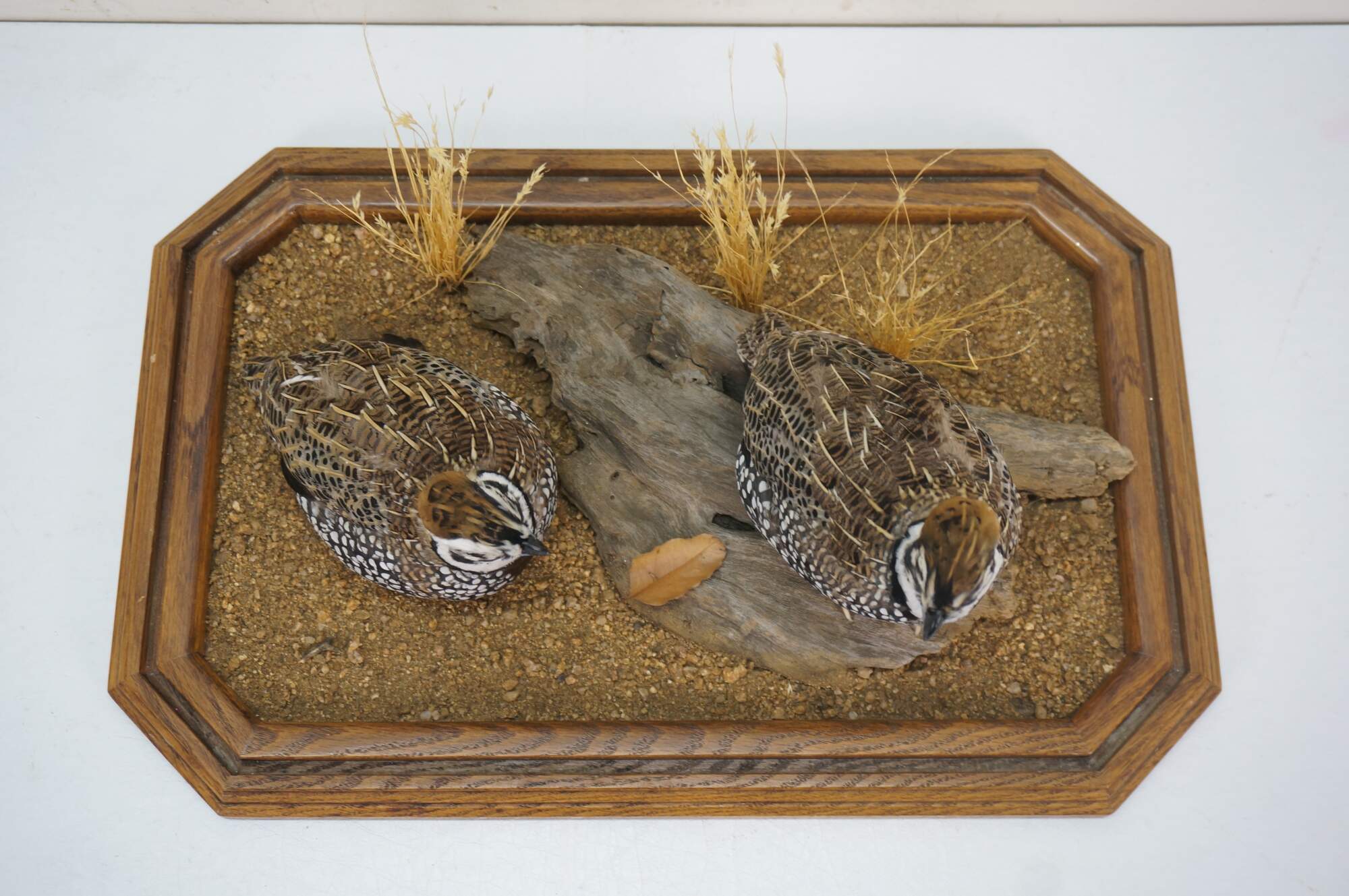 Vintage male and female cased Merns Quail game bird taxidermy mount in octagonal oak and glass showcase with driftwood and foliage.