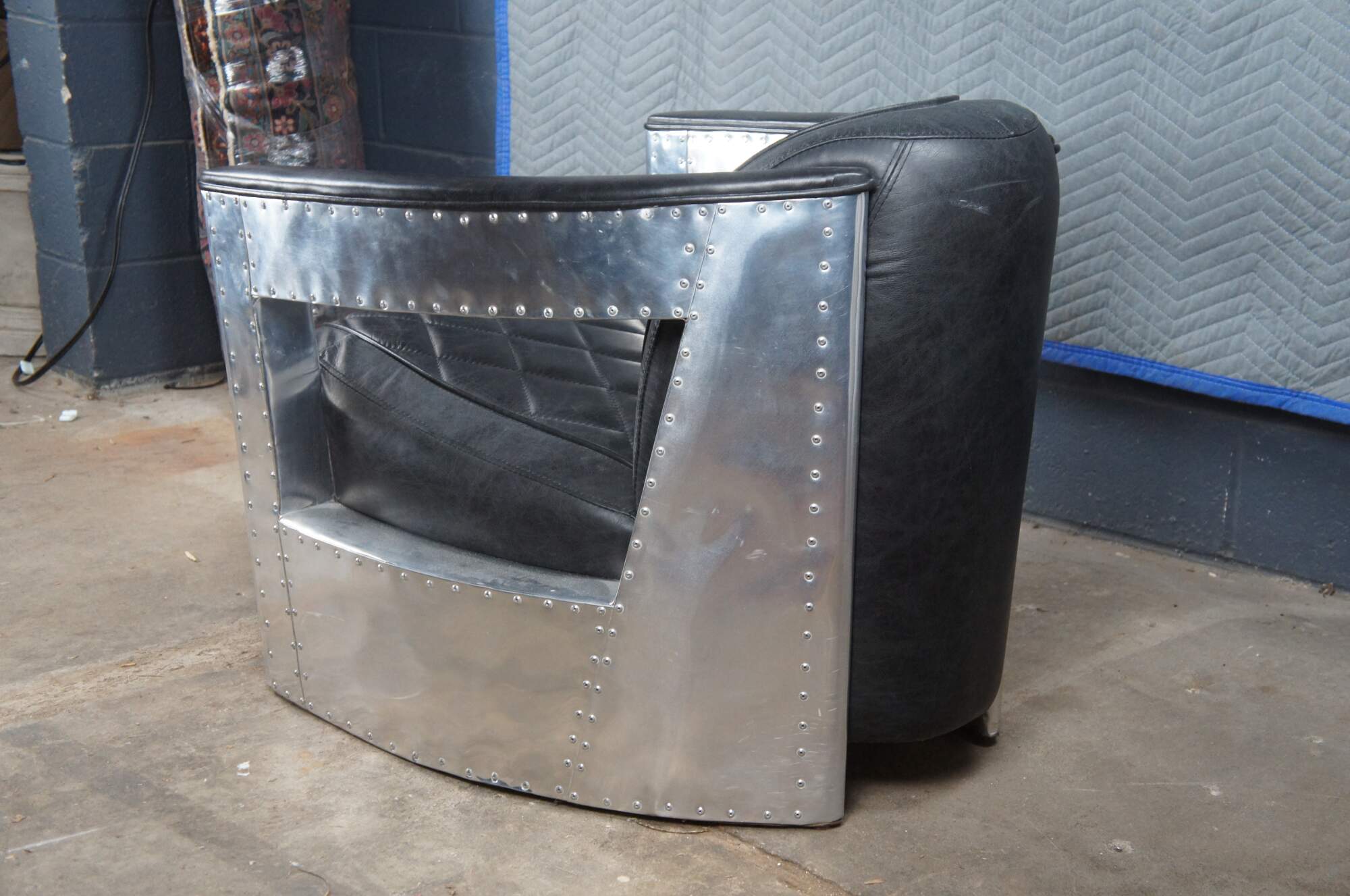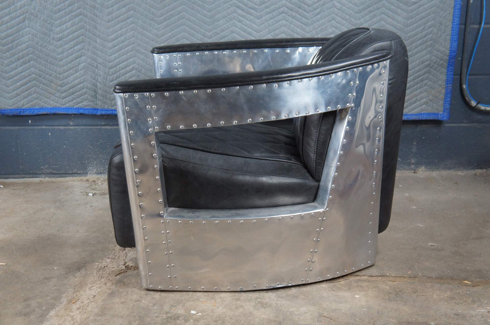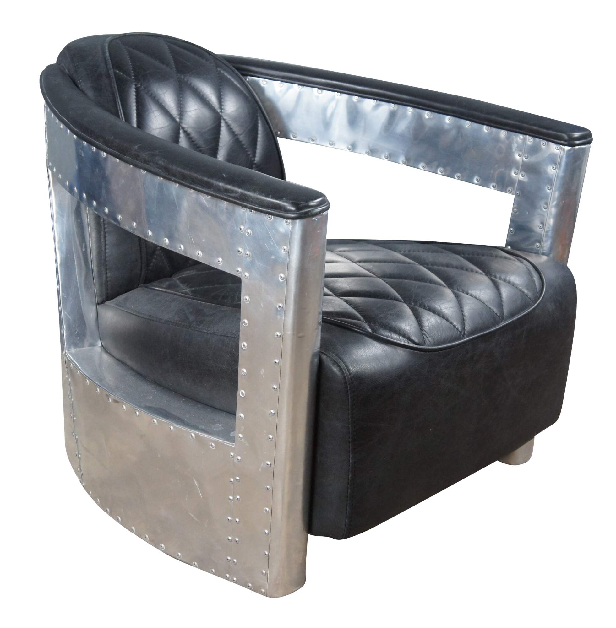 Vintage aviator pilot office / lounge chair featuring black leather diamond stitch upholstery with padded sloped arms and aluminum / chrome body with nailhead trim. Made by Home Meridian International a division of Hooker Furniture.