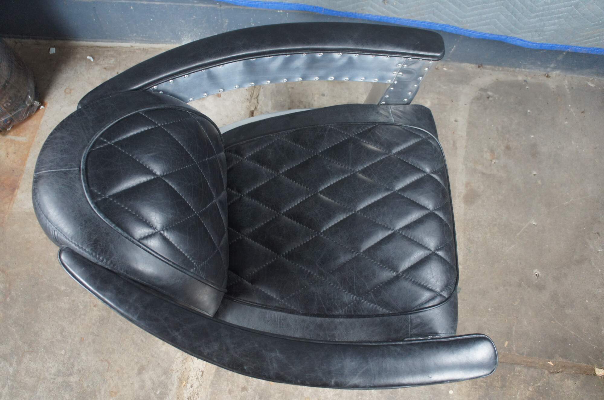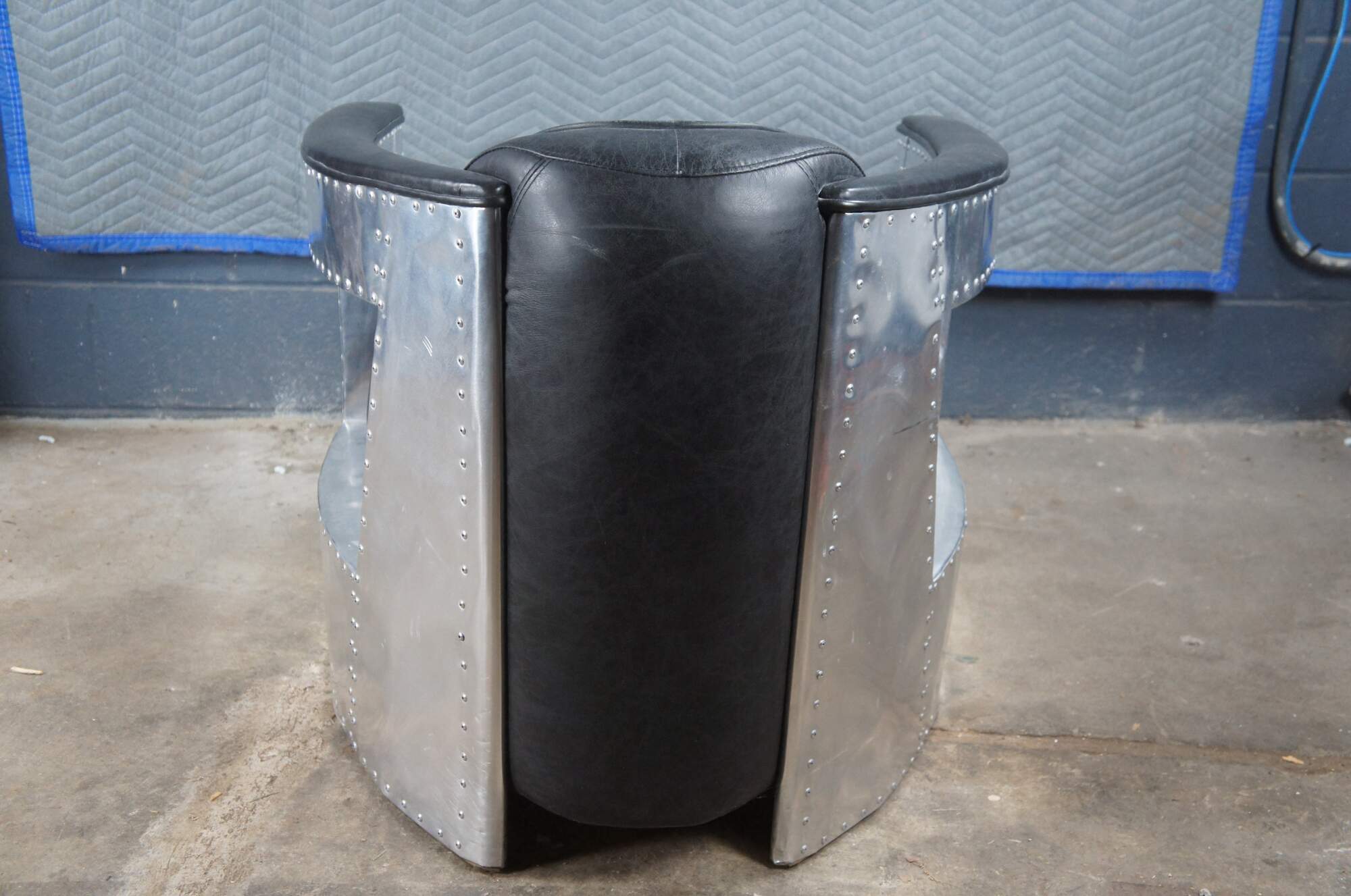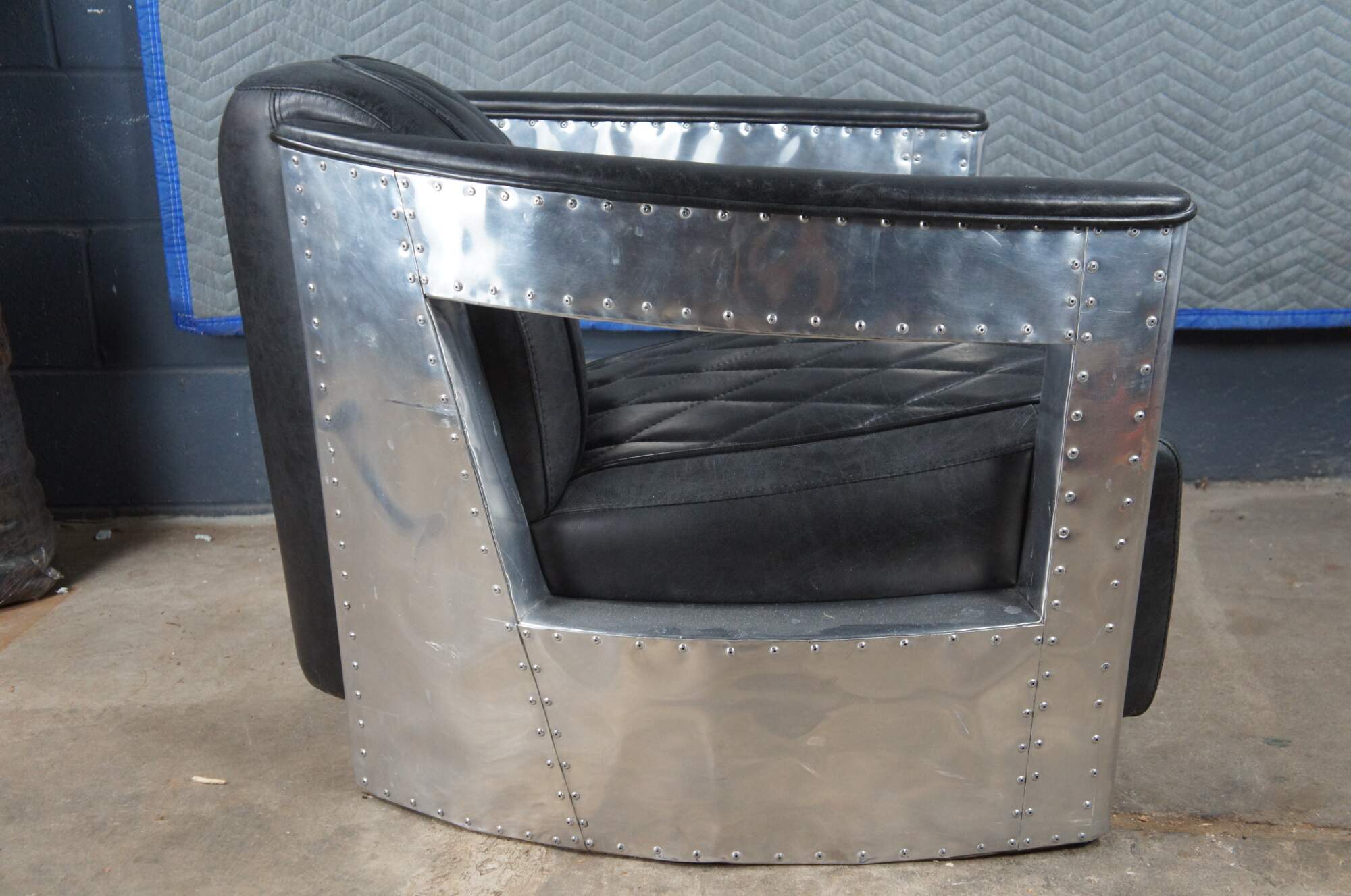 Vintage aviator pilot office / lounge chair featuring black leather diamond stitch upholstery with padded sloped arms and aluminum / chrome body with nailhead trim. Made by Home Meridian International a division of Hooker Furniture.
