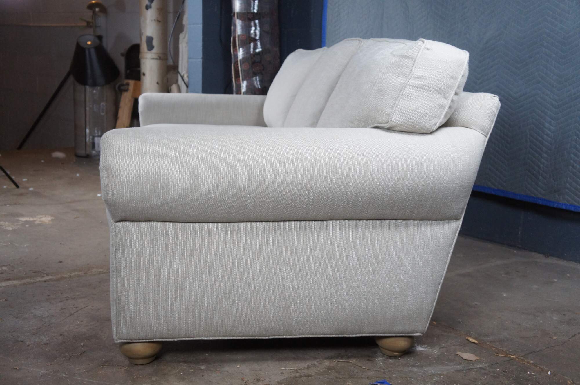 Vintage RH Restoration Hardware Lancaster three seat sofa featuring rolled arms and turned feet.
