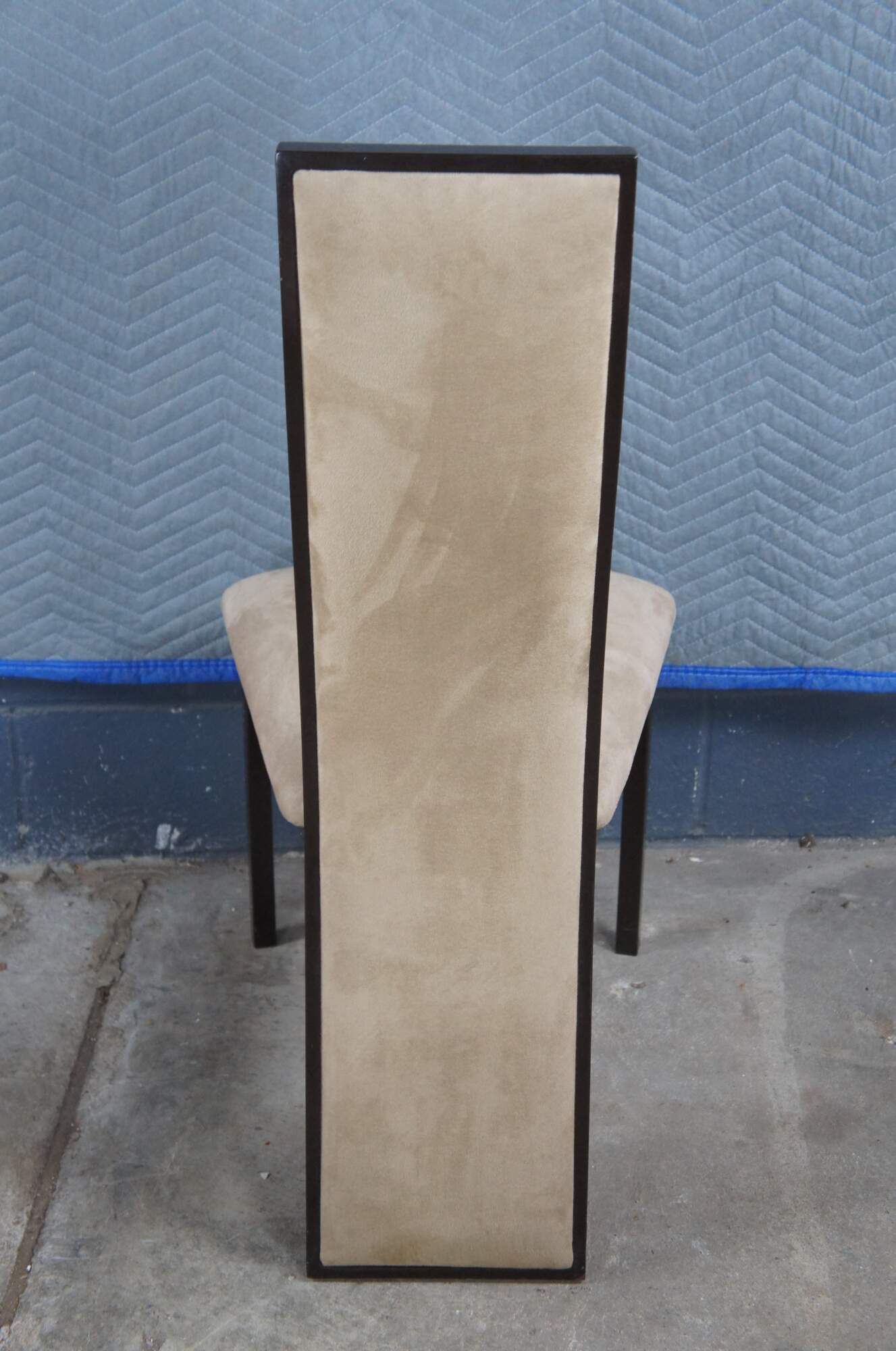 Vintage set of six Italian postmodern dining chairs featuring an abstract metal frame with microsuede upholstery and tubular armchairs.