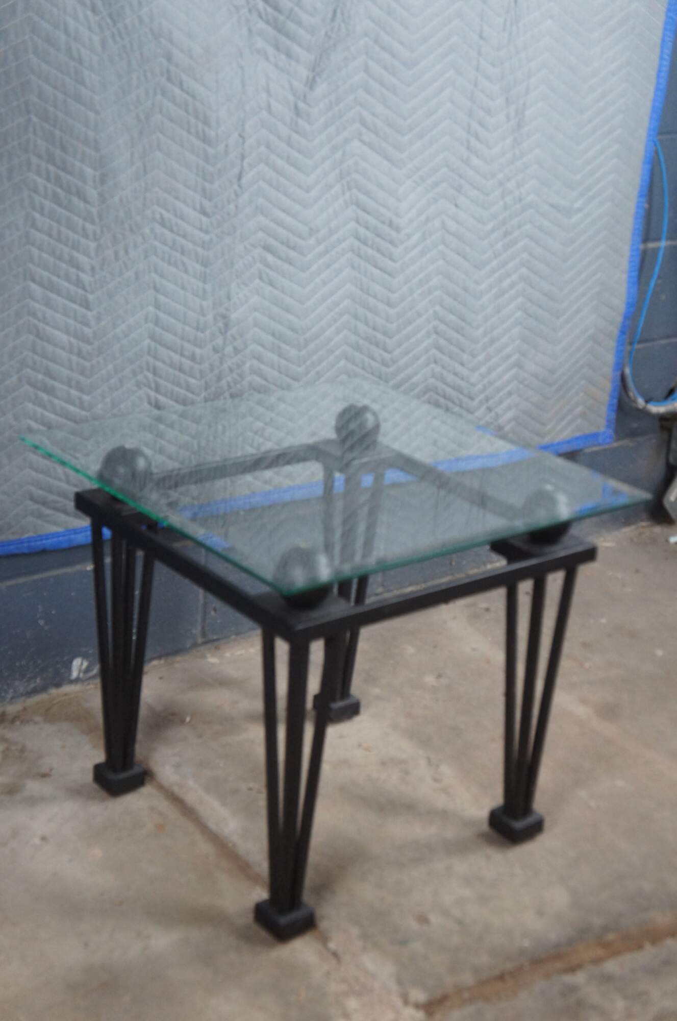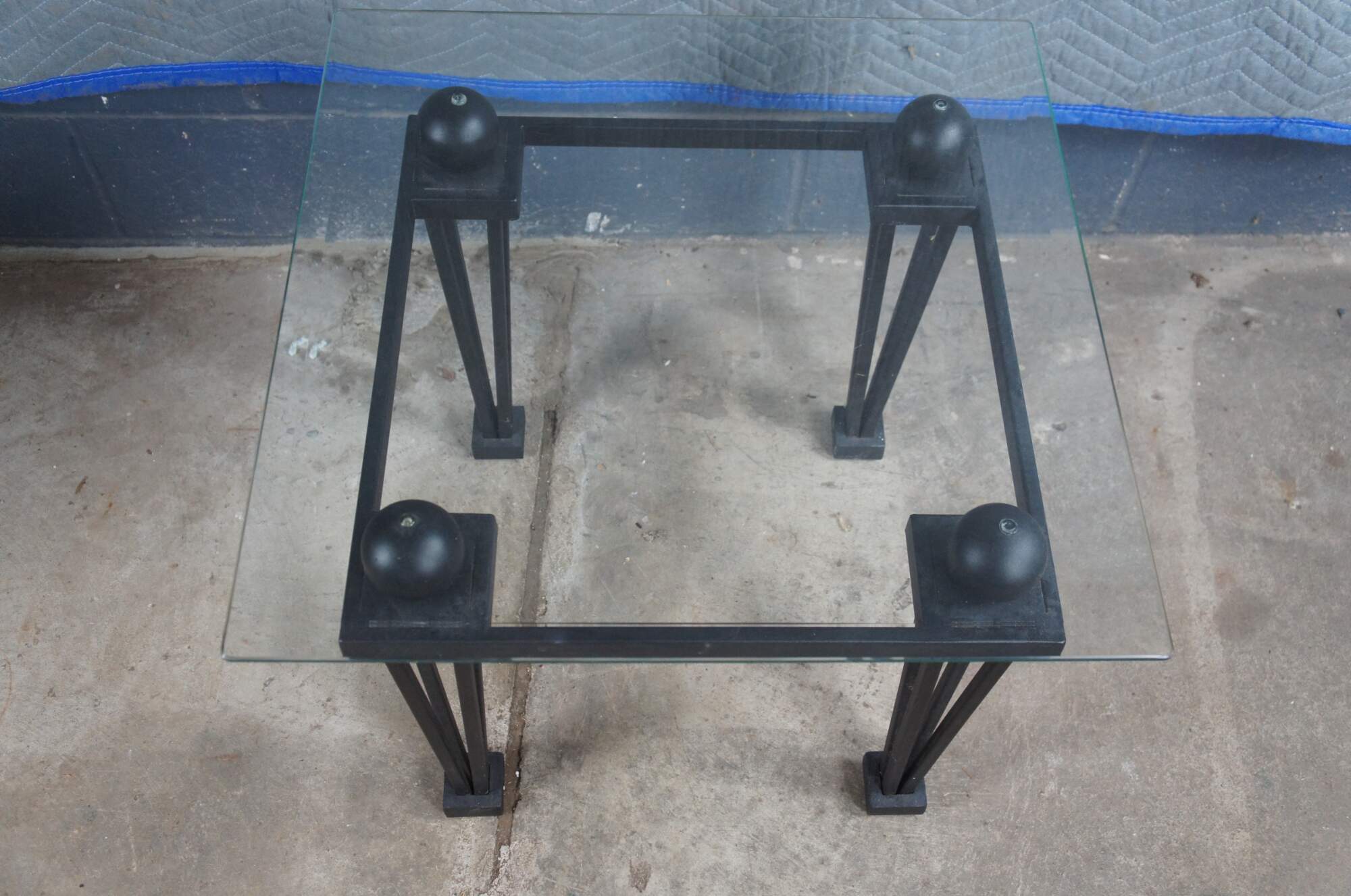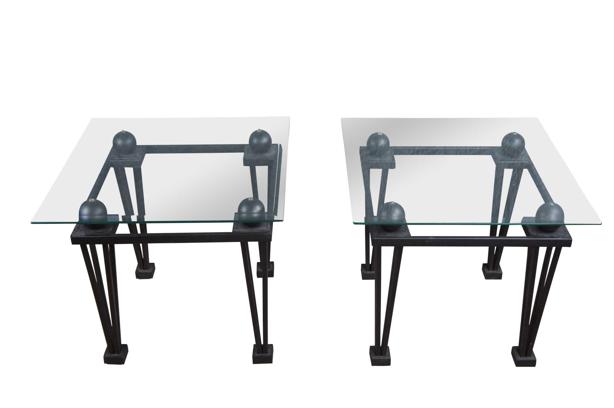 Vintage pair of two post modern side accent tables with metal bases and square beveled glass tops.