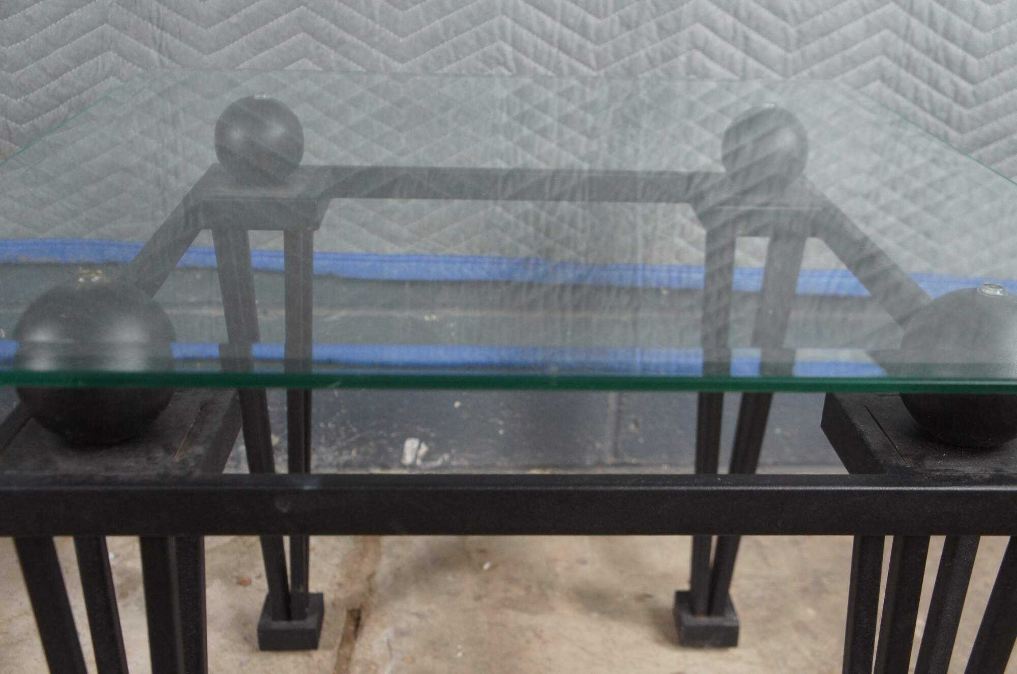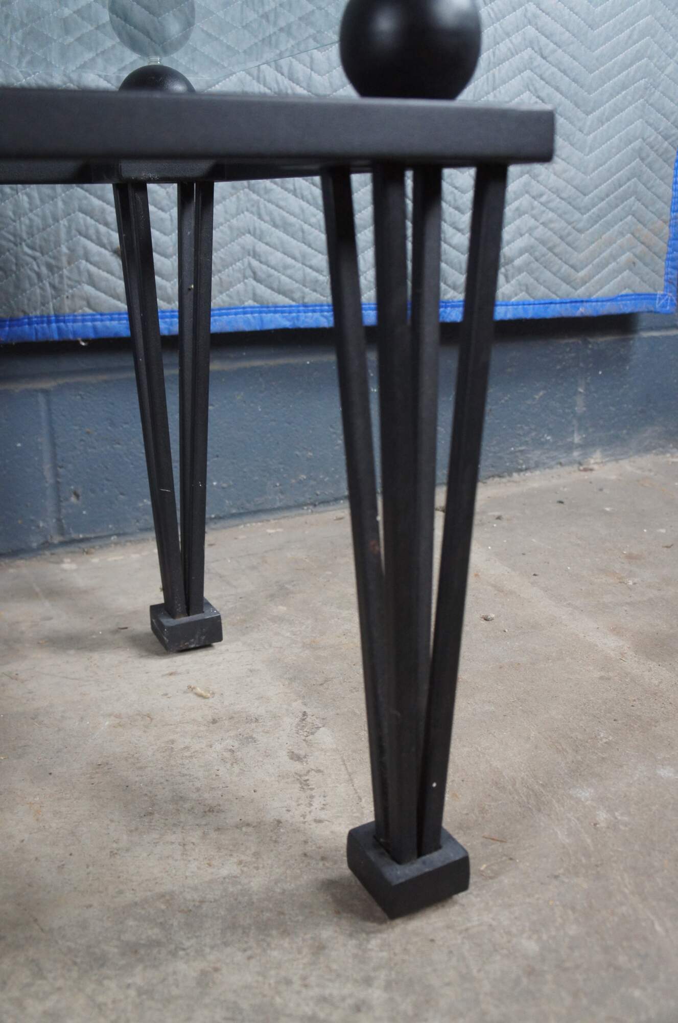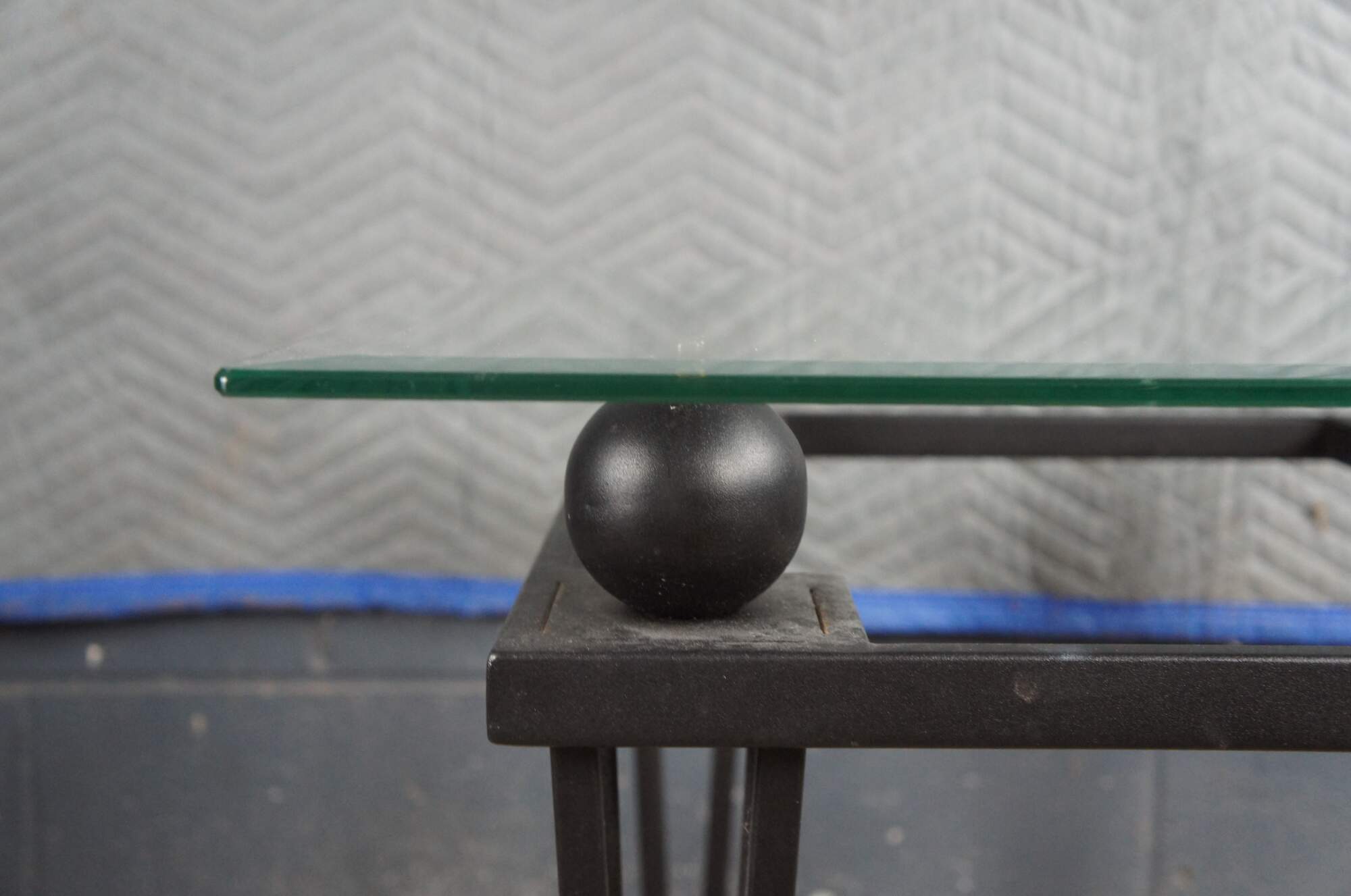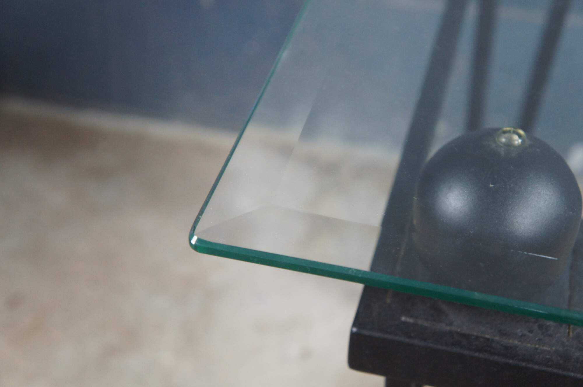 Vintage pair of two post modern side accent tables with metal bases and square beveled glass tops.