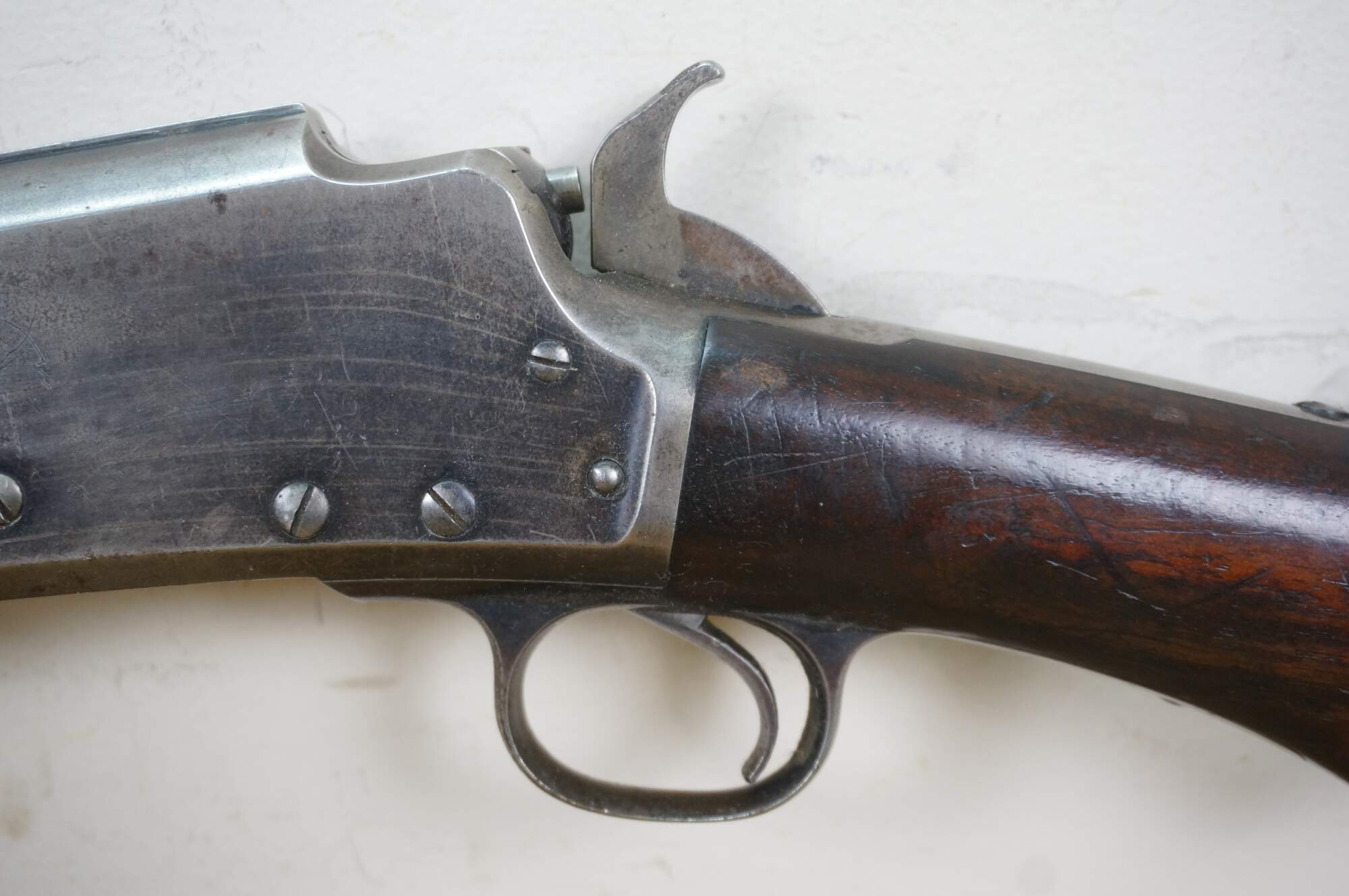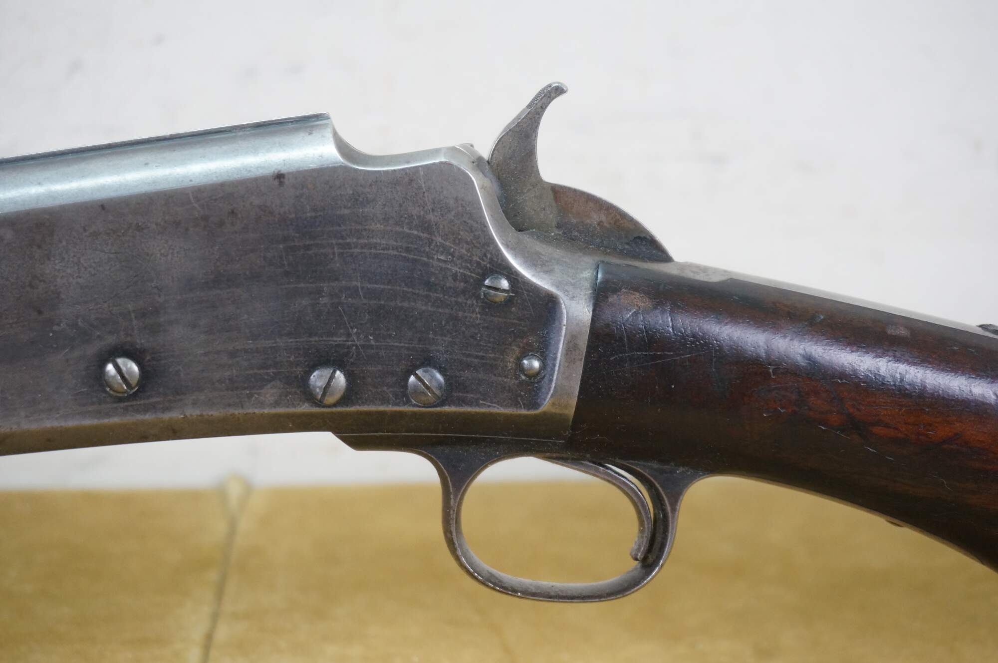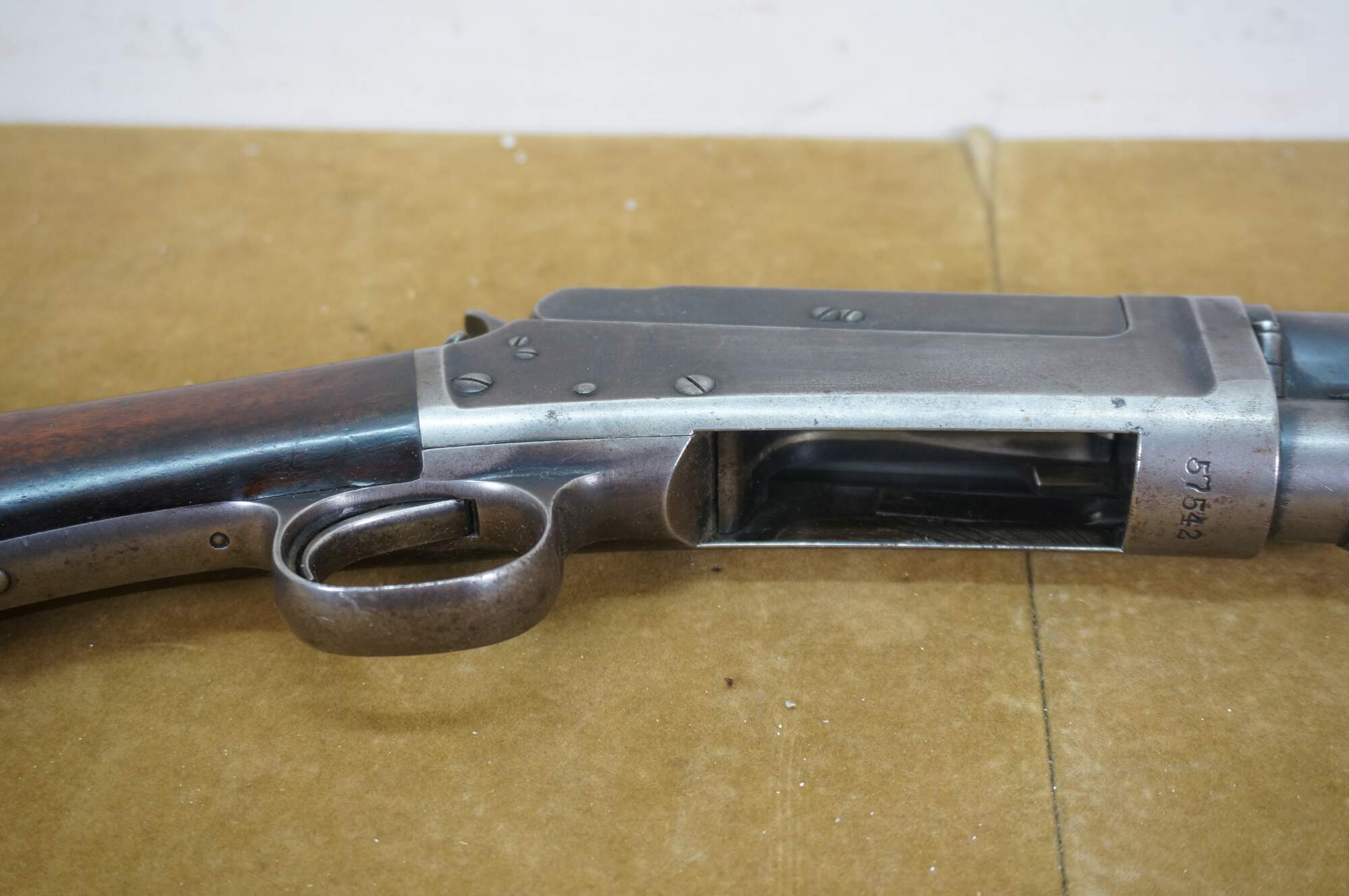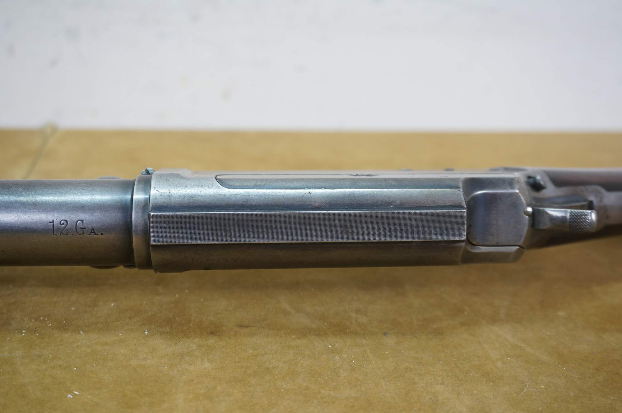 Late 19th century Marlin Firearms 12 gauge pump action single barrel shotgun. Plain oak wood stock and pump grip. Exposed hammer. Serial Number 57542. Marked Marlin on buttplate and barrel. Marlin Fire-Arms Co, New Haven, CT. U.S.A. Pat'd Nov. 6 1894. May 12 1896. & June 2 1896. Barrel Length 32