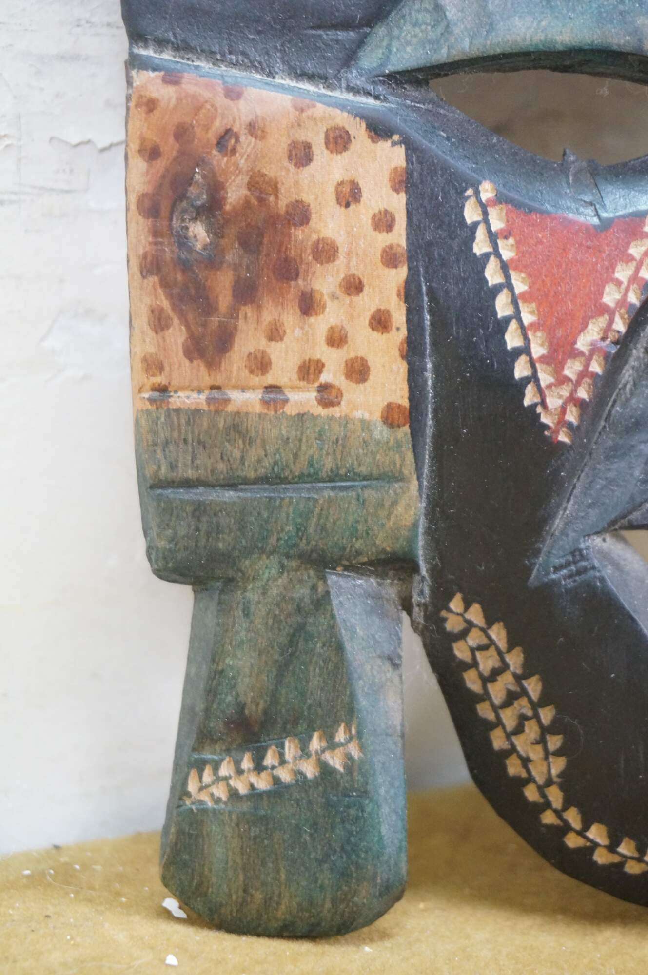 Decorative hand carved African folk art wall hanging mask depicting a human face with elongated ears and a tall highly decorated hat with cut out zebras and giraffe fur pattern. Black with carved details and red and green painted accents. Made in Kenya. Originally purchased at Walt Disney Parks & Resorts.