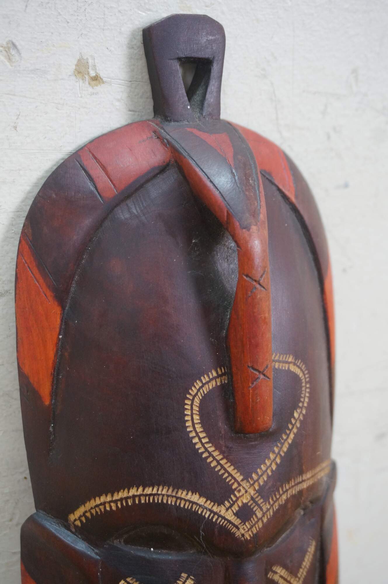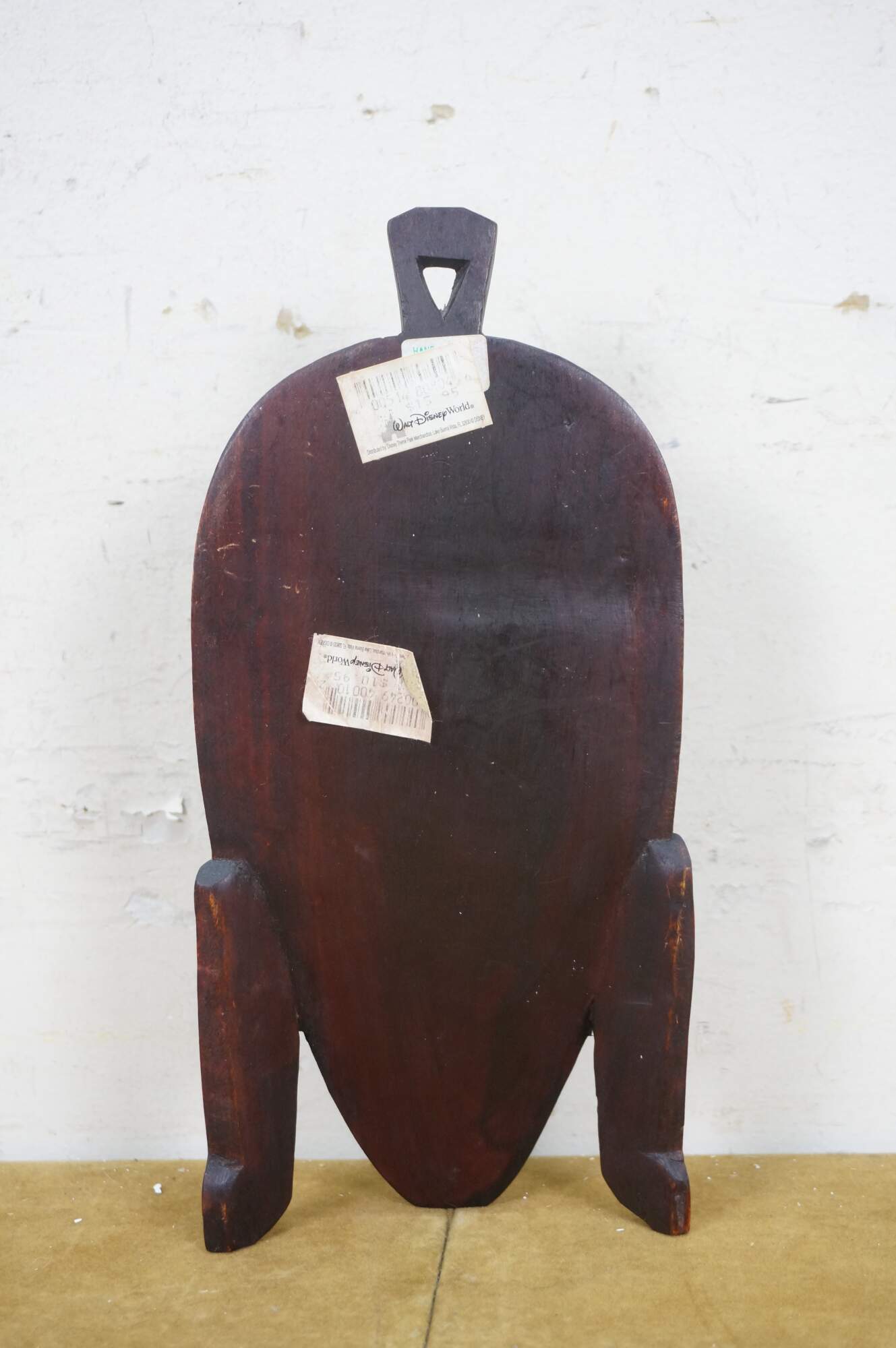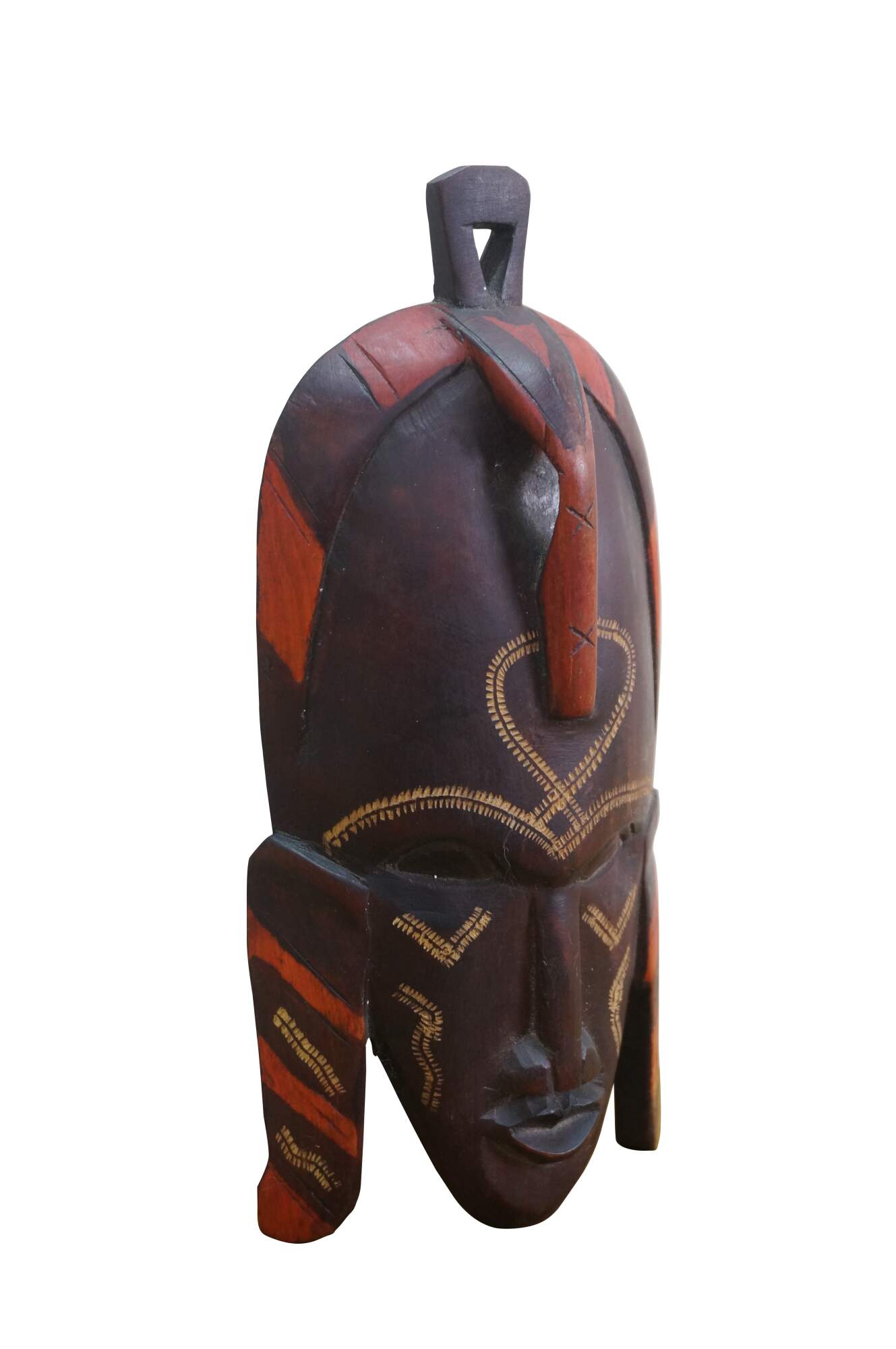Decorative wall hanging African tribal folk art mask depicting a human face with elongated ears and exaggerated forehead. Brown with carved details and orange accents. Hand Carved. Made in Kenya. Originally purchased at Walt Disney World.
