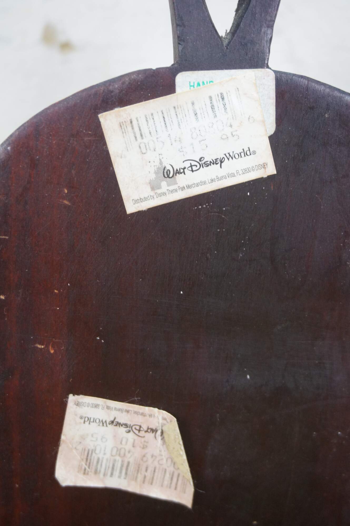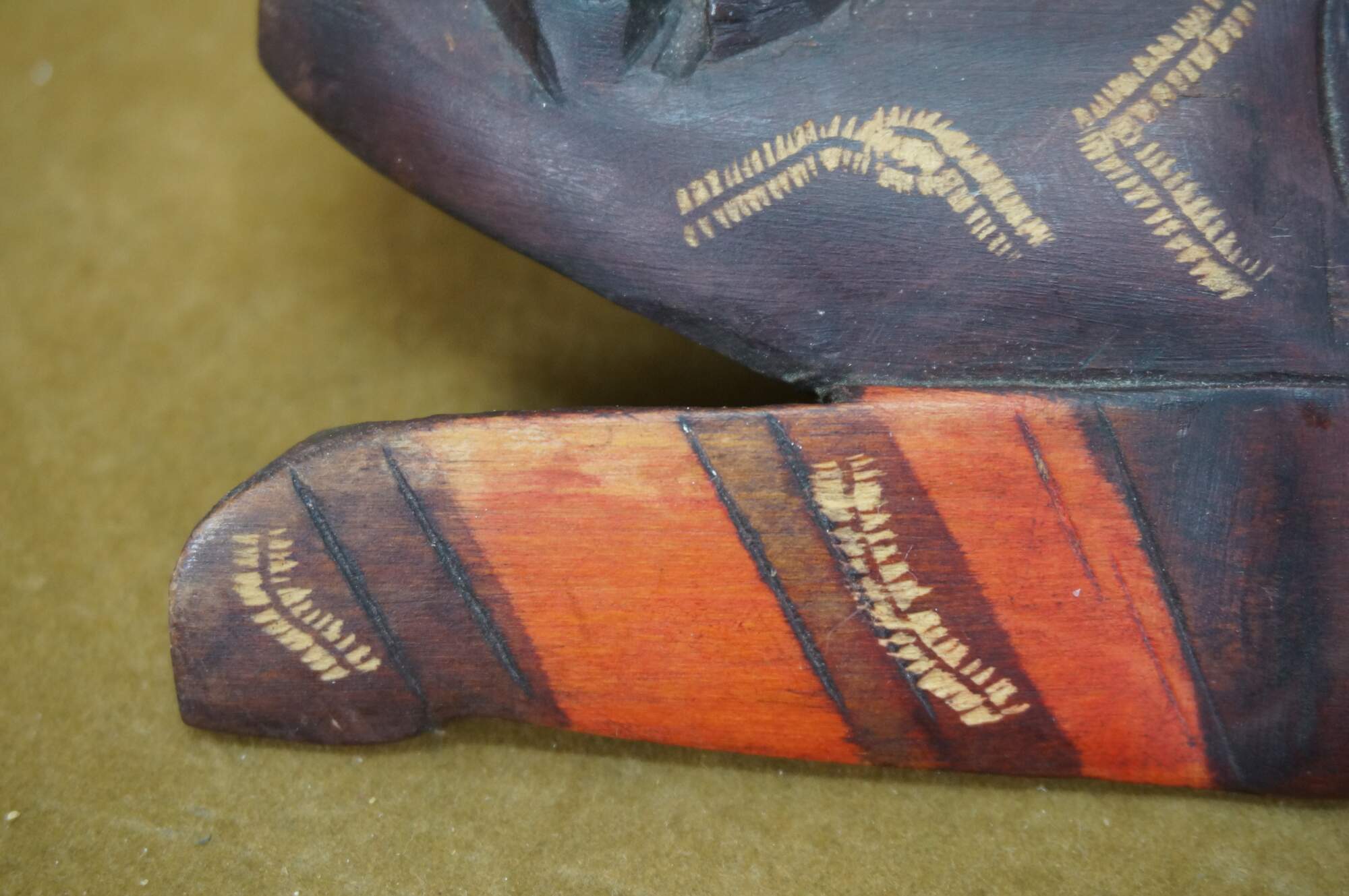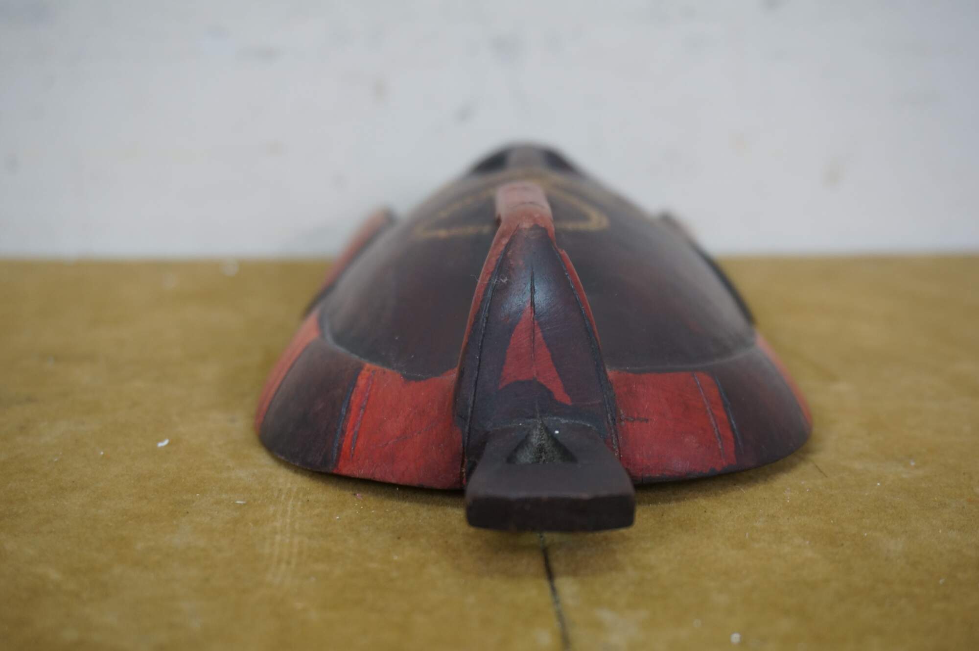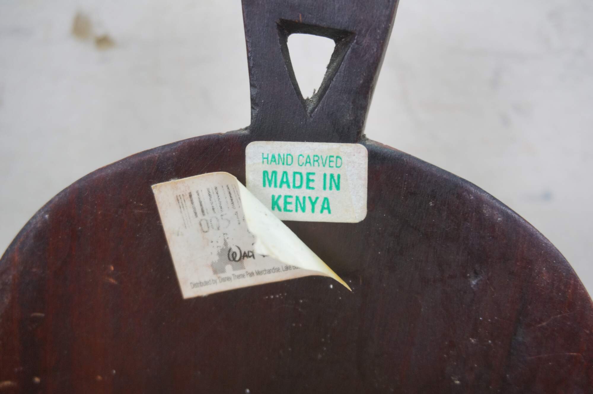 Decorative wall hanging African tribal folk art mask depicting a human face with elongated ears and exaggerated forehead. Brown with carved details and orange accents. Hand Carved. Made in Kenya. Originally purchased at Walt Disney World.