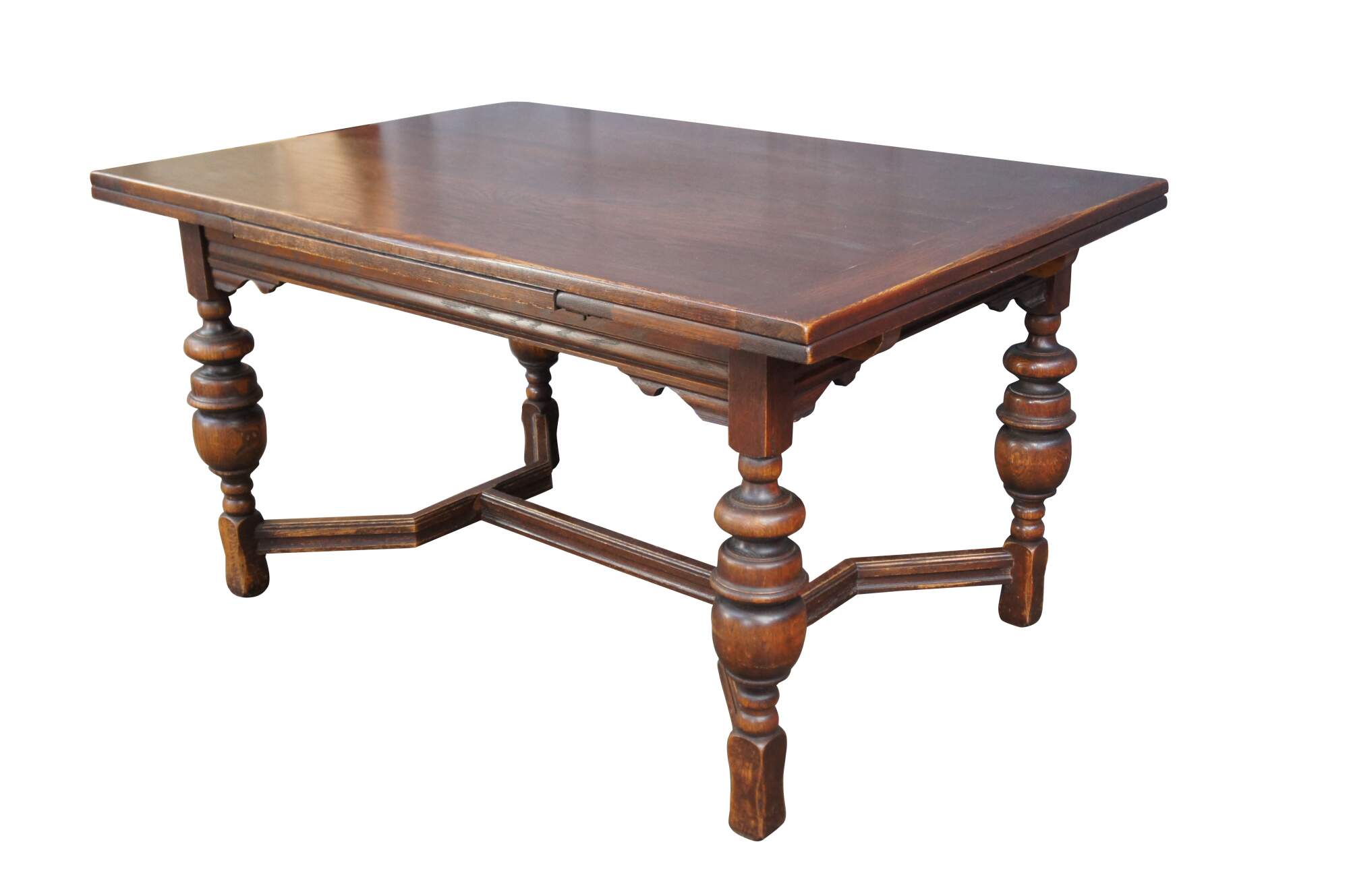 Early 20th Century Jacobean style draw leaf dining table. Features a rectangular form with two 15" draw leaves over a serpentine cut skirt, connected to a robust baluster turned trestle base.