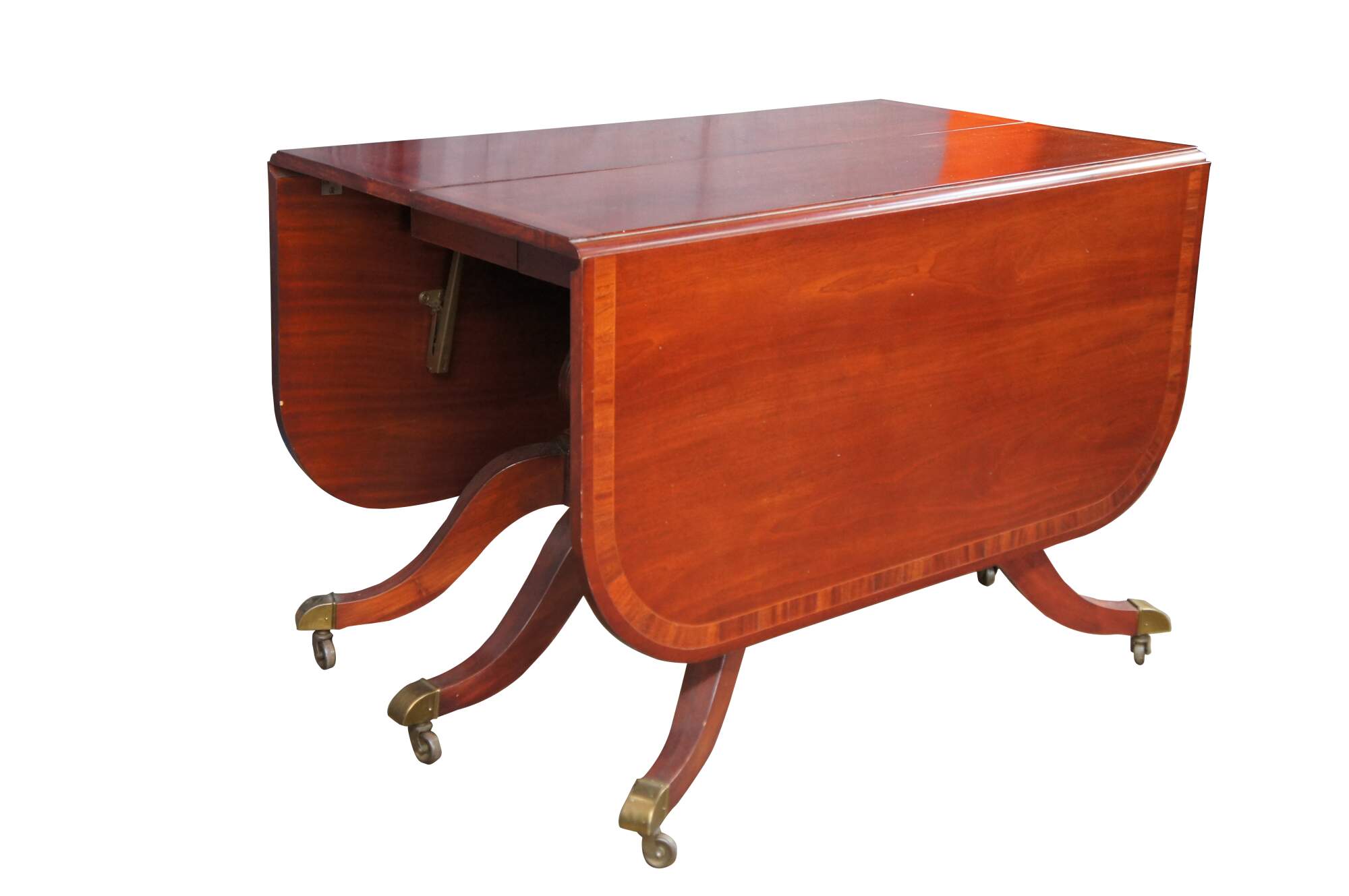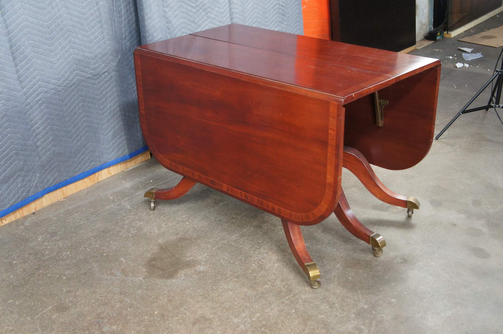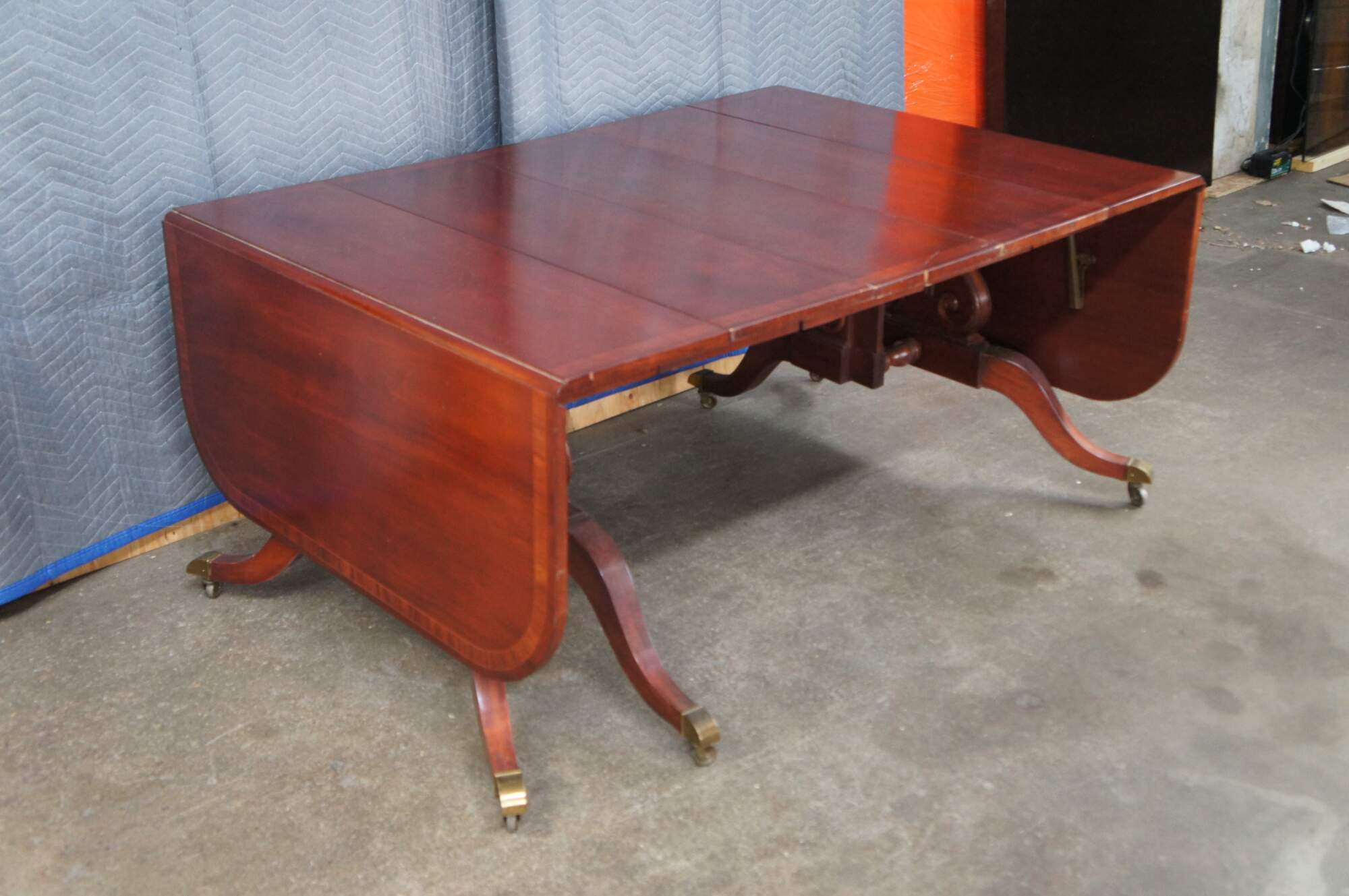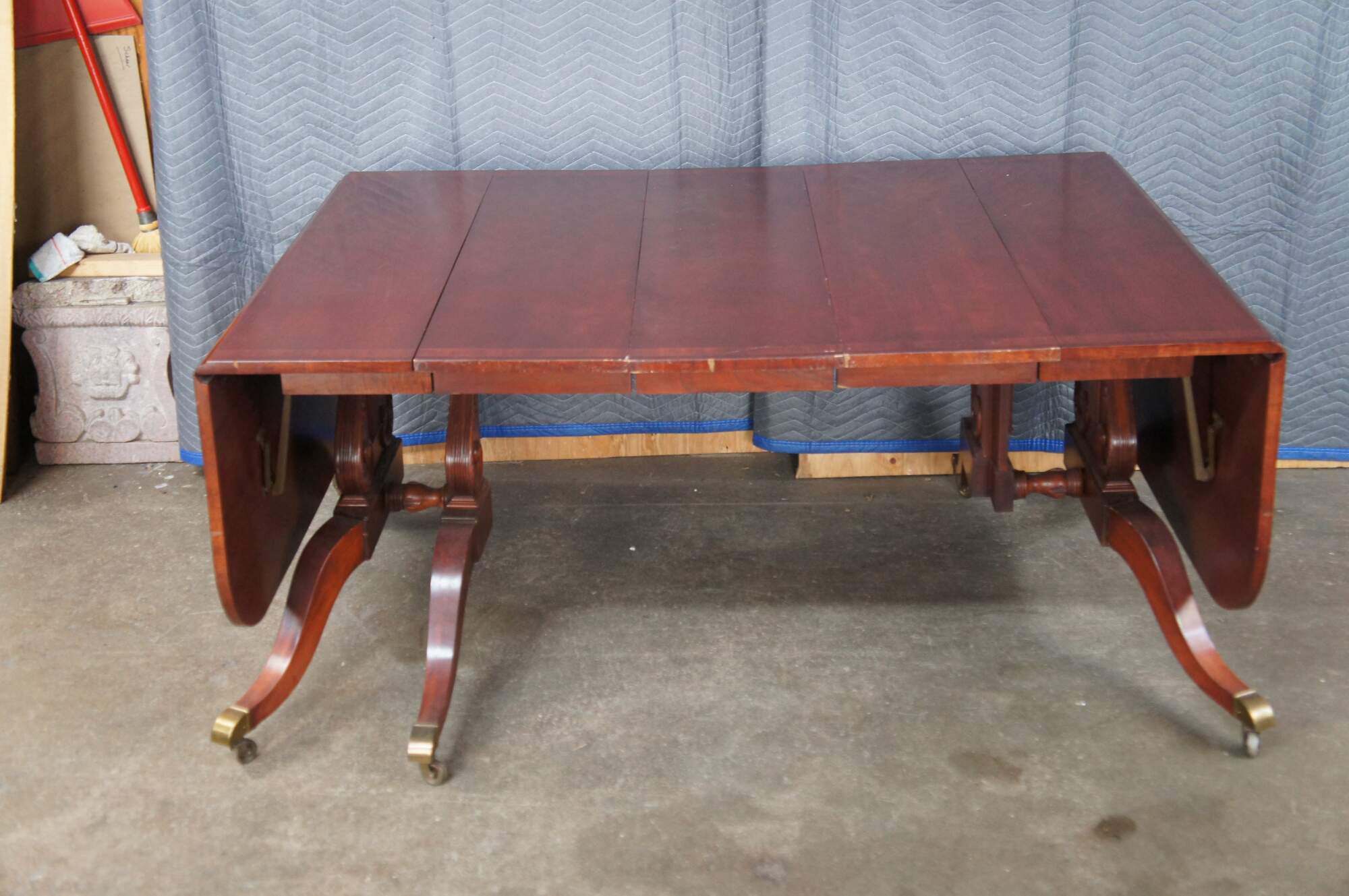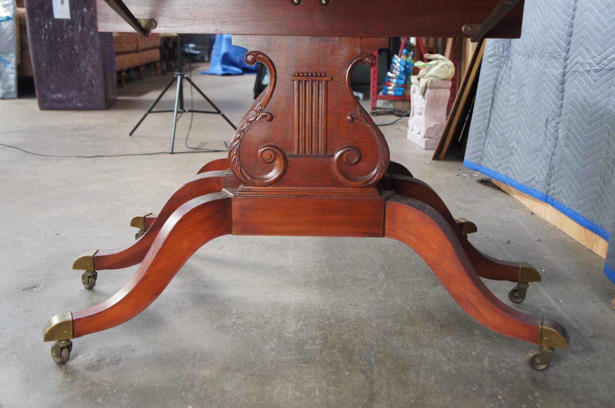 Mid-20th Century Union National Duncan Phyfe Style Drop Leaf Extendable Dining Table. Made from American mahogany with a banded top. Features a harp or lyre carved pedestal base leading to six downswept legs with brass capped feet and castors. This beautiful table will be the center of attention in any dining or breakfast room. For those with larger spaces it can be stowed away along a wall and used as a console when not in service and rolled into place for large gatherings. Includes three leaves for expansion up to 98.5"