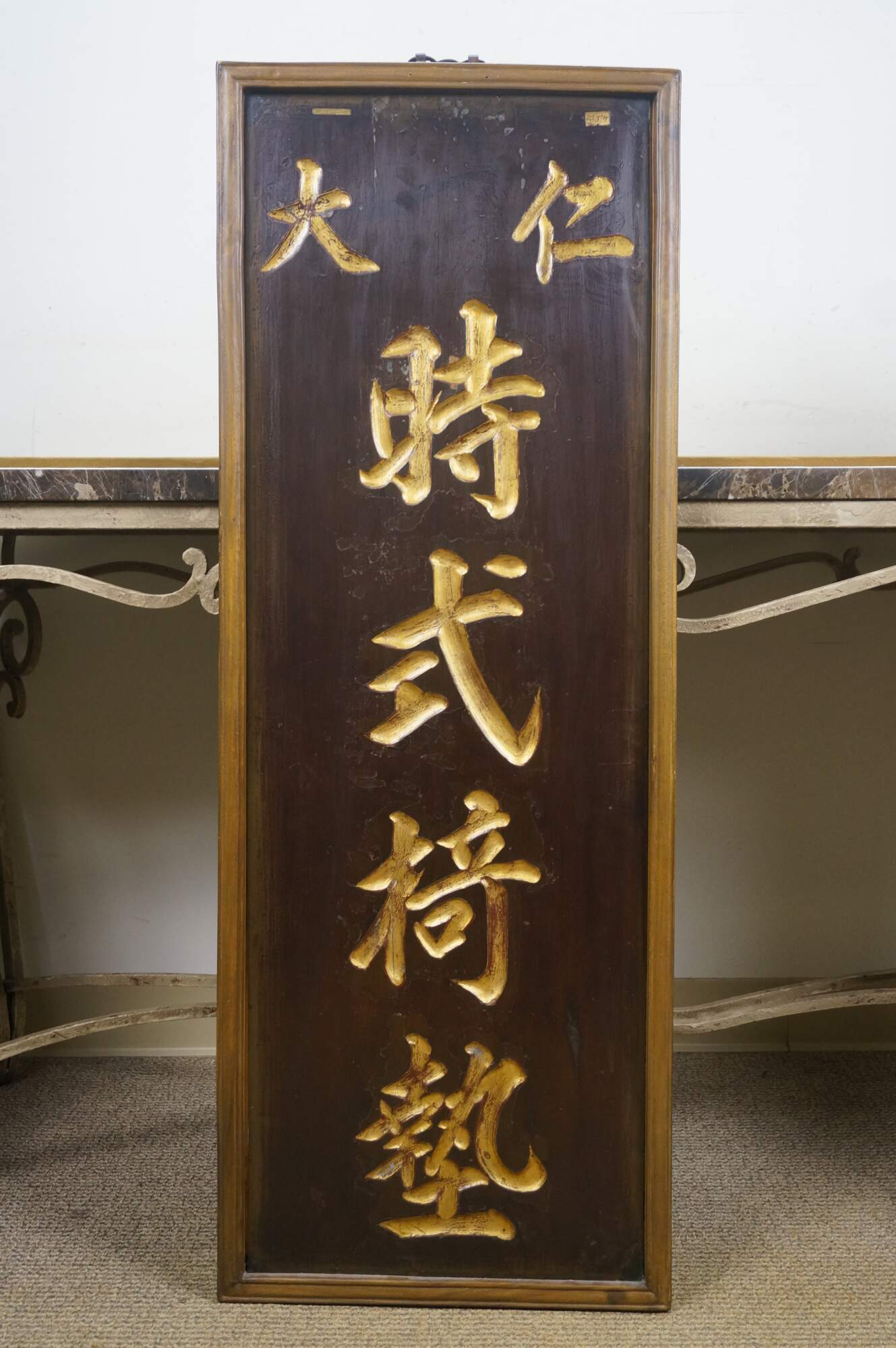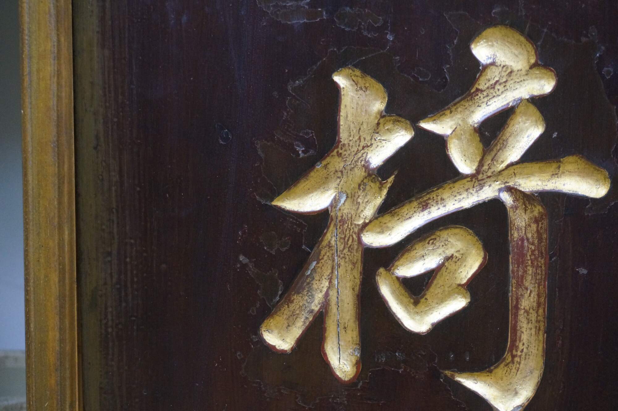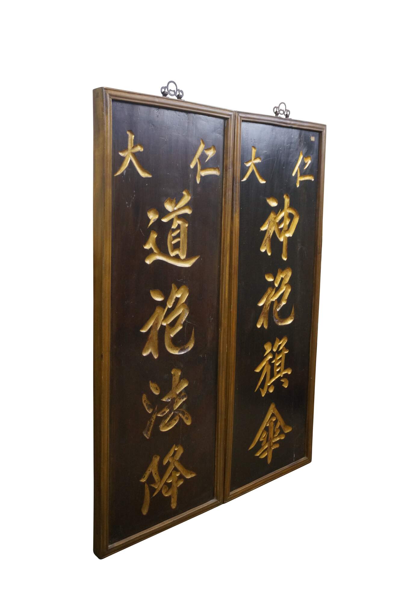 Pair of vintage mid to early 20th century hardwood opera troupe prop signage hanging panels, carved on both sides with gilded calligraphy; gold edges / frame.