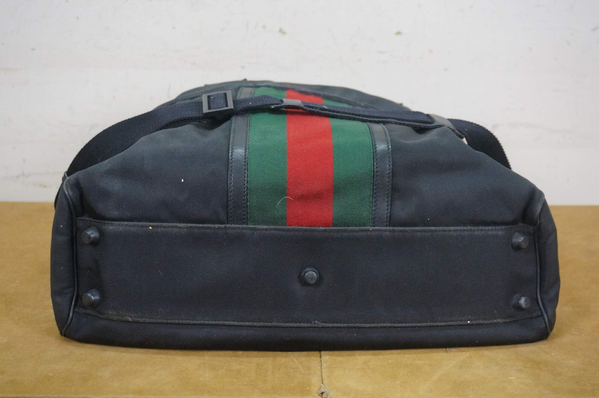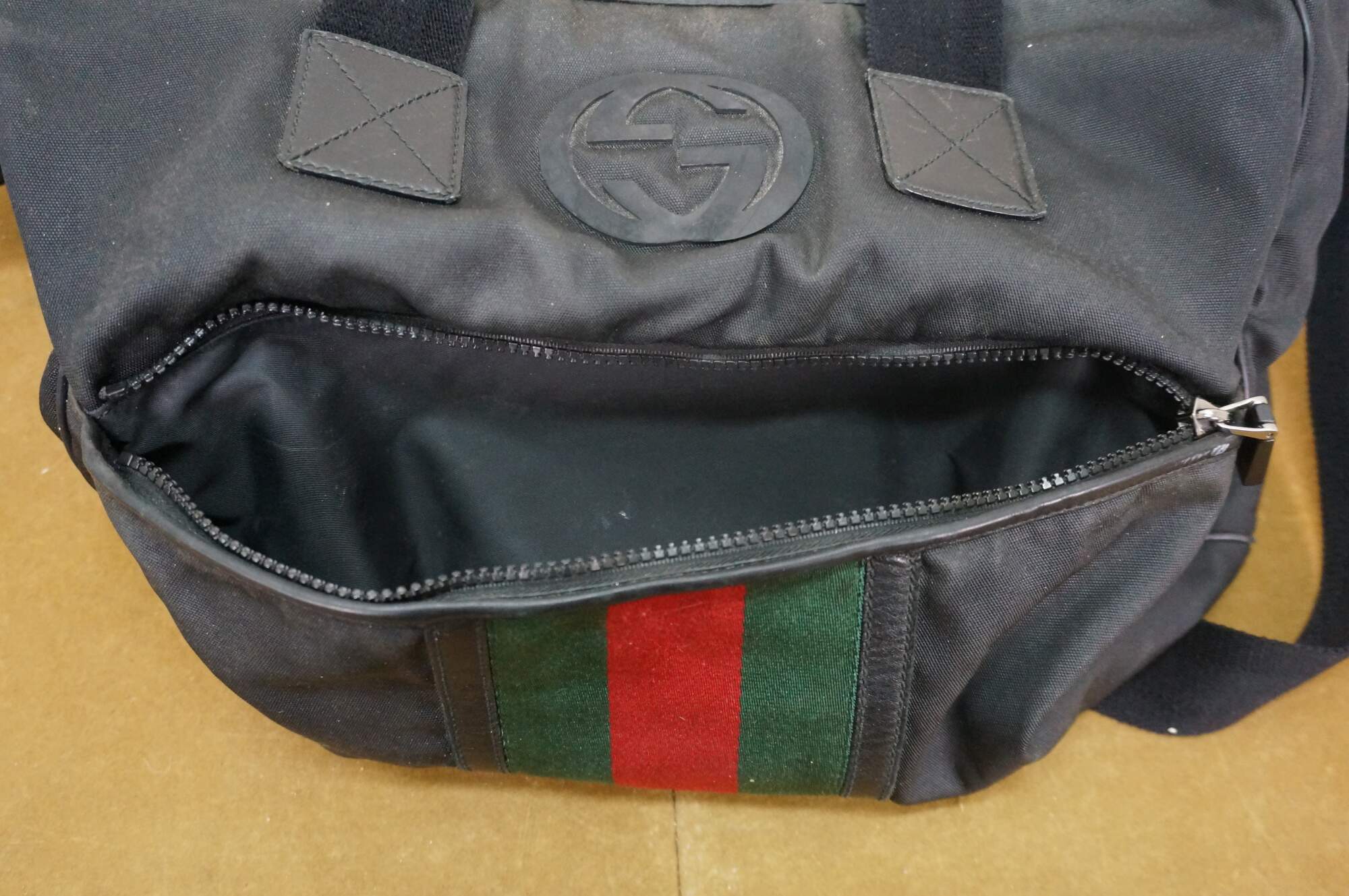 Vintage Gucci black nylon tote / shoulder bag with leather trim, interlocking G logo, and red and green web detail on front. Adjustable shoulder strap; two top handles. One zippered exterior pocket. Top zipper closure. One interior zippered pocket and two interior slip pockets. Inside tag stamped 181063 / 204046.