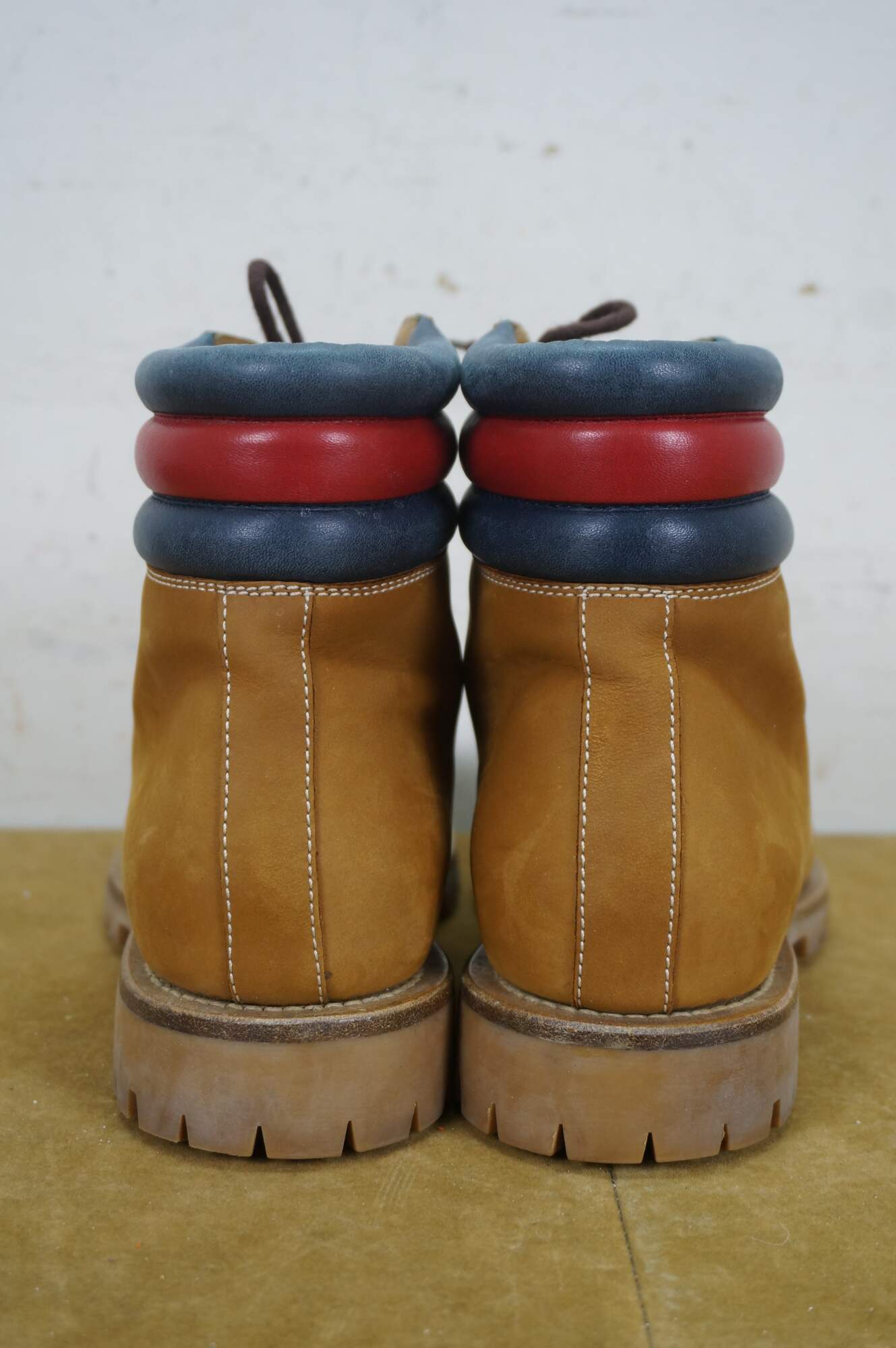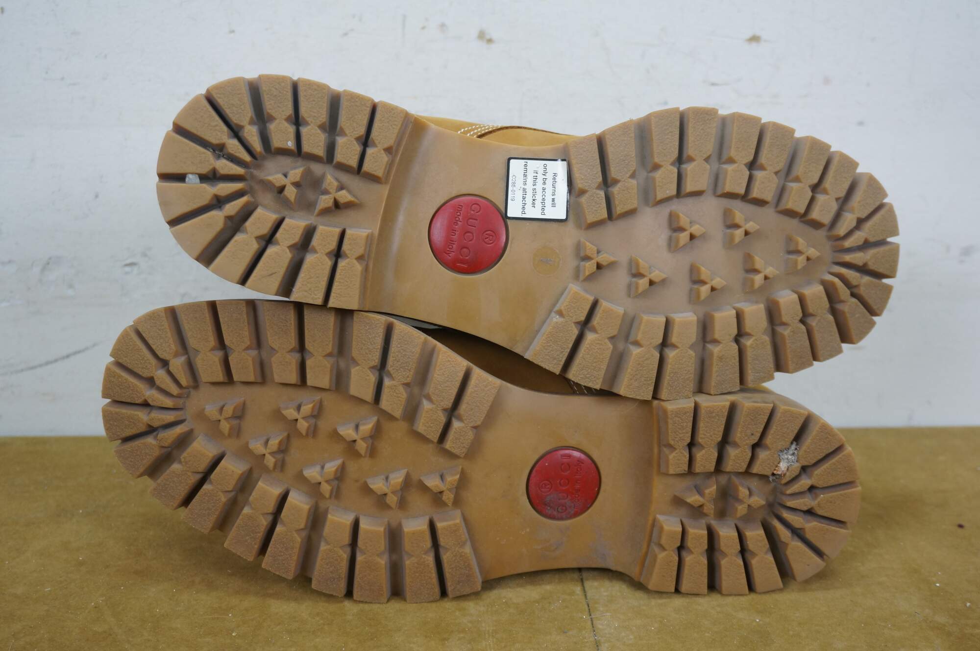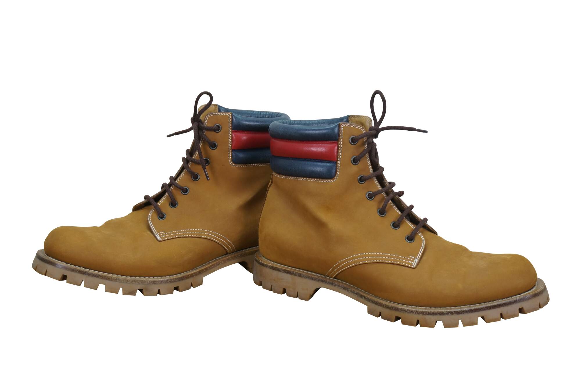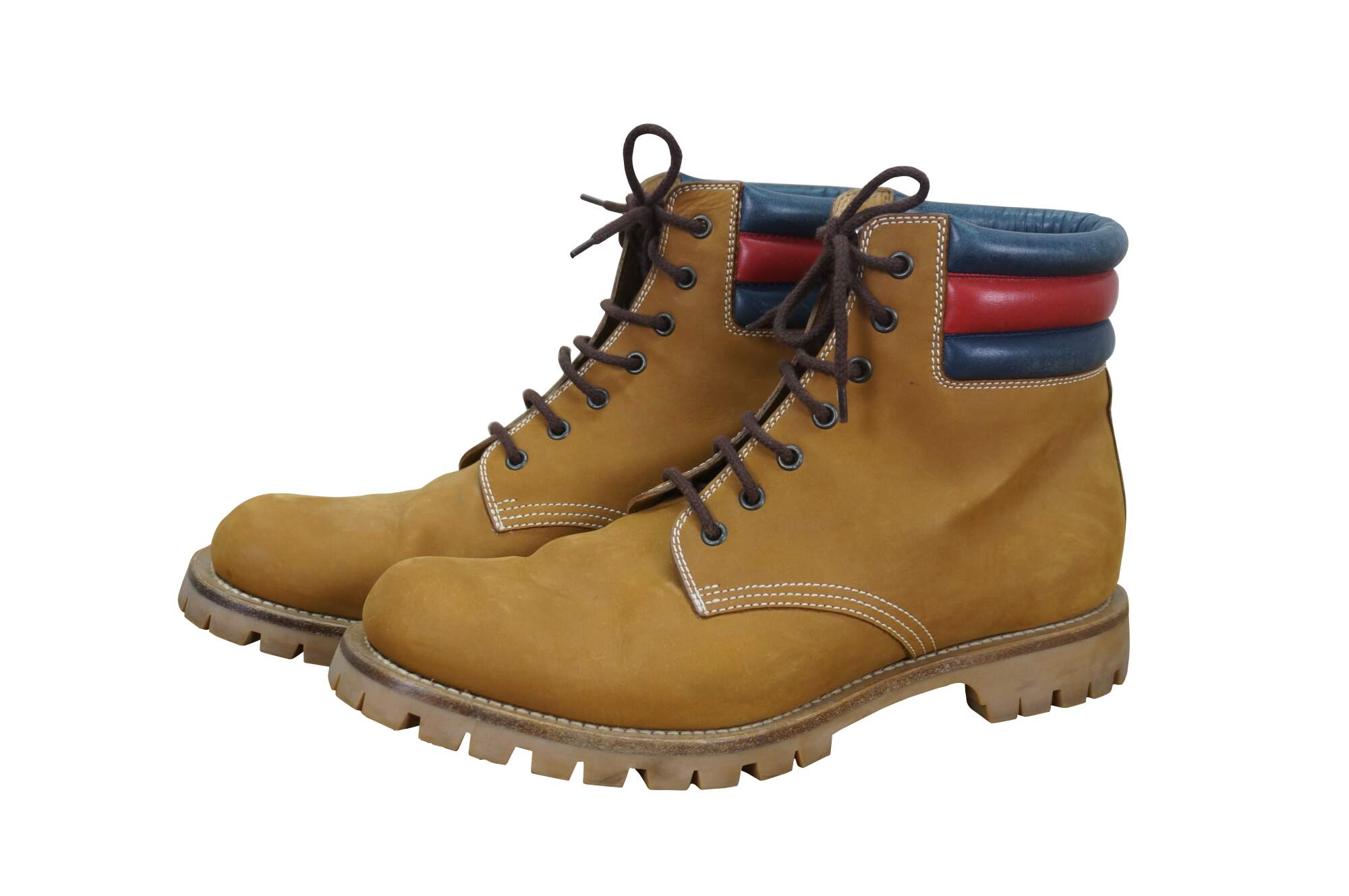 Vintage Gucci Marland plain toe hiking / combat boot. Brown suede leather with navy blue and red accents. Eugene/N. Pantoufle/N. Pantoufle. Cuir/Blu/Rosso. Lace-up closure. Black lug sole. 429220AIXN0. Made in Italy. Originally purchased at Saks Fifth Avenue. Includes original box and dust bags. MSRP $830.