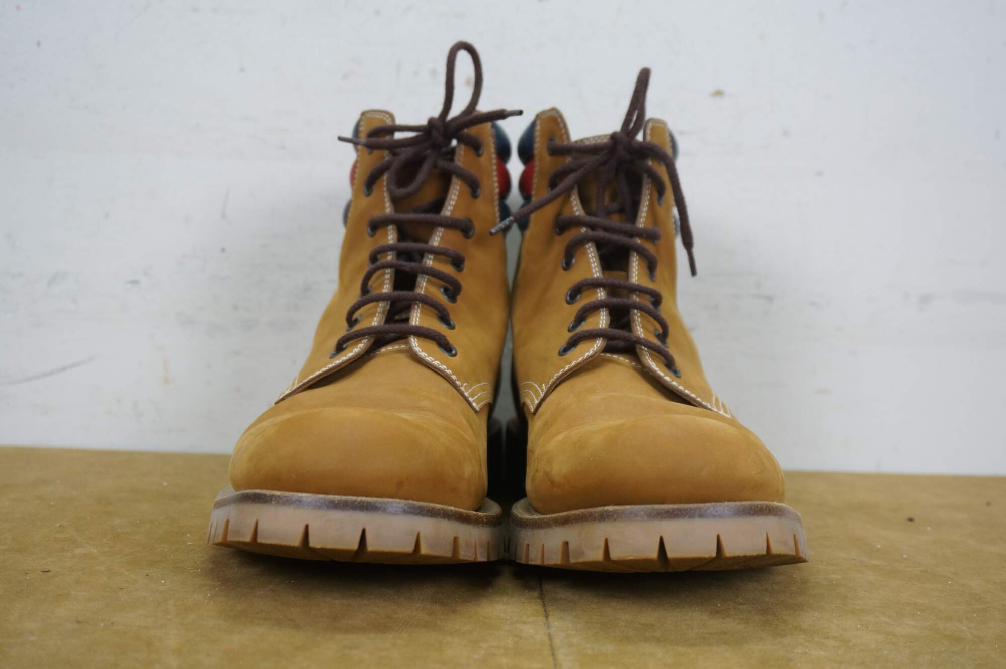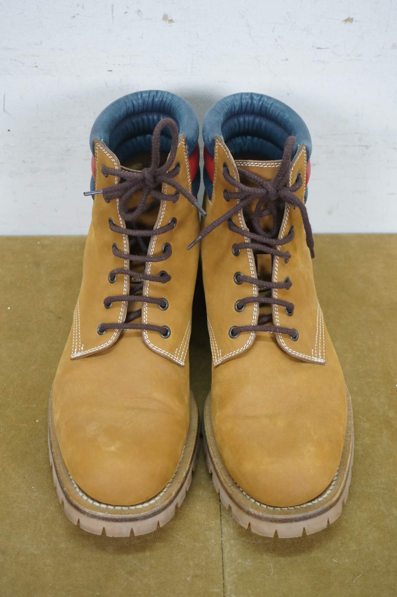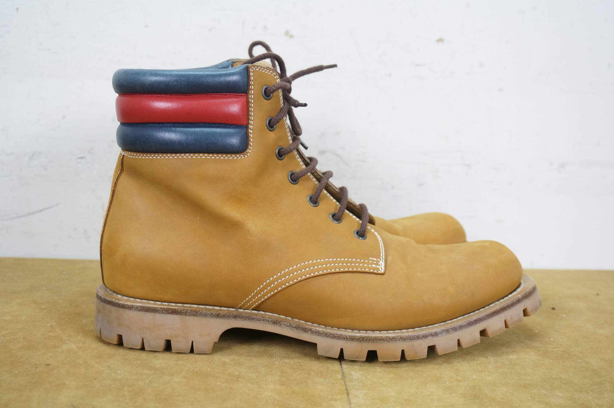 Vintage Gucci Marland plain toe hiking / combat boot. Brown suede leather with navy blue and red accents. Eugene/N. Pantoufle/N. Pantoufle. Cuir/Blu/Rosso. Lace-up closure. Black lug sole. 429220AIXN0. Made in Italy. Originally purchased at Saks Fifth Avenue. Includes original box and dust bags. MSRP $830.