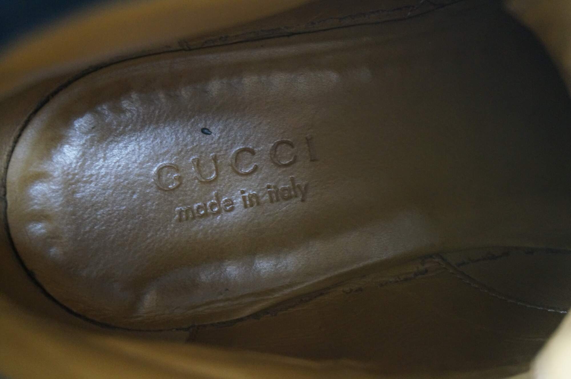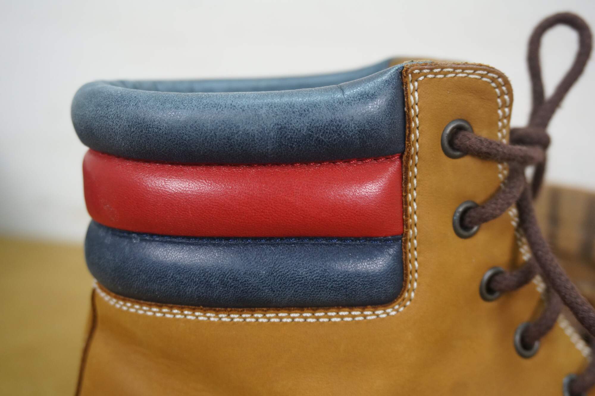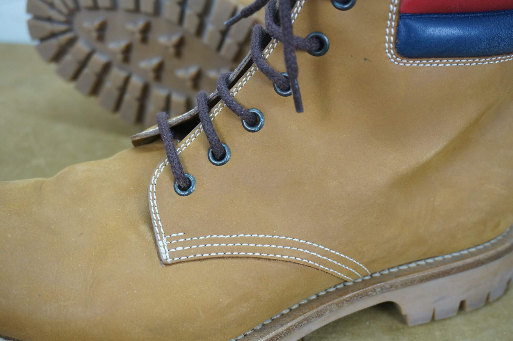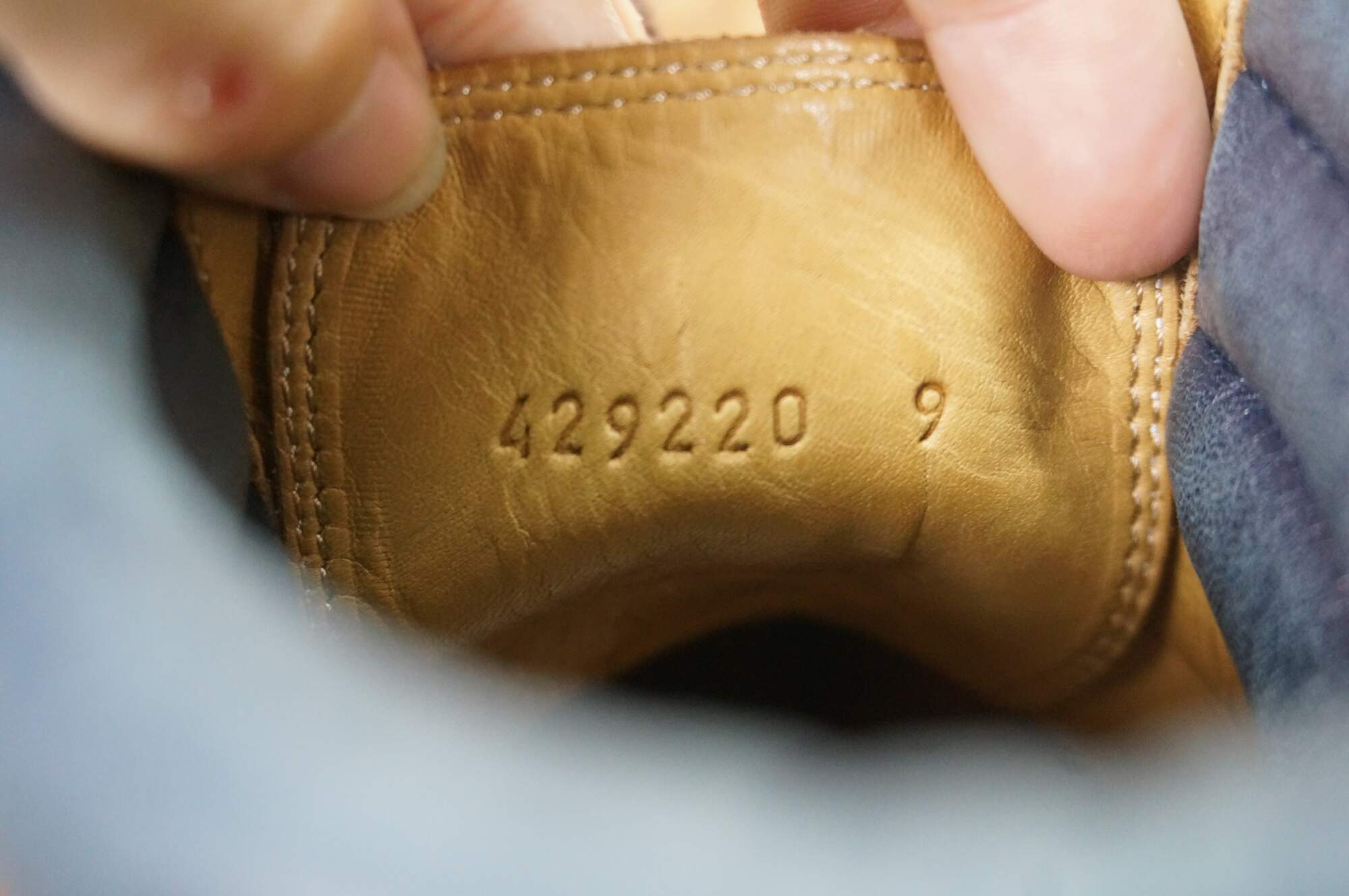 Vintage Gucci Marland plain toe hiking / combat boot. Brown suede leather with navy blue and red accents. Eugene/N. Pantoufle/N. Pantoufle. Cuir/Blu/Rosso. Lace-up closure. Black lug sole. 429220AIXN0. Made in Italy. Originally purchased at Saks Fifth Avenue. Includes original box and dust bags. MSRP $830.