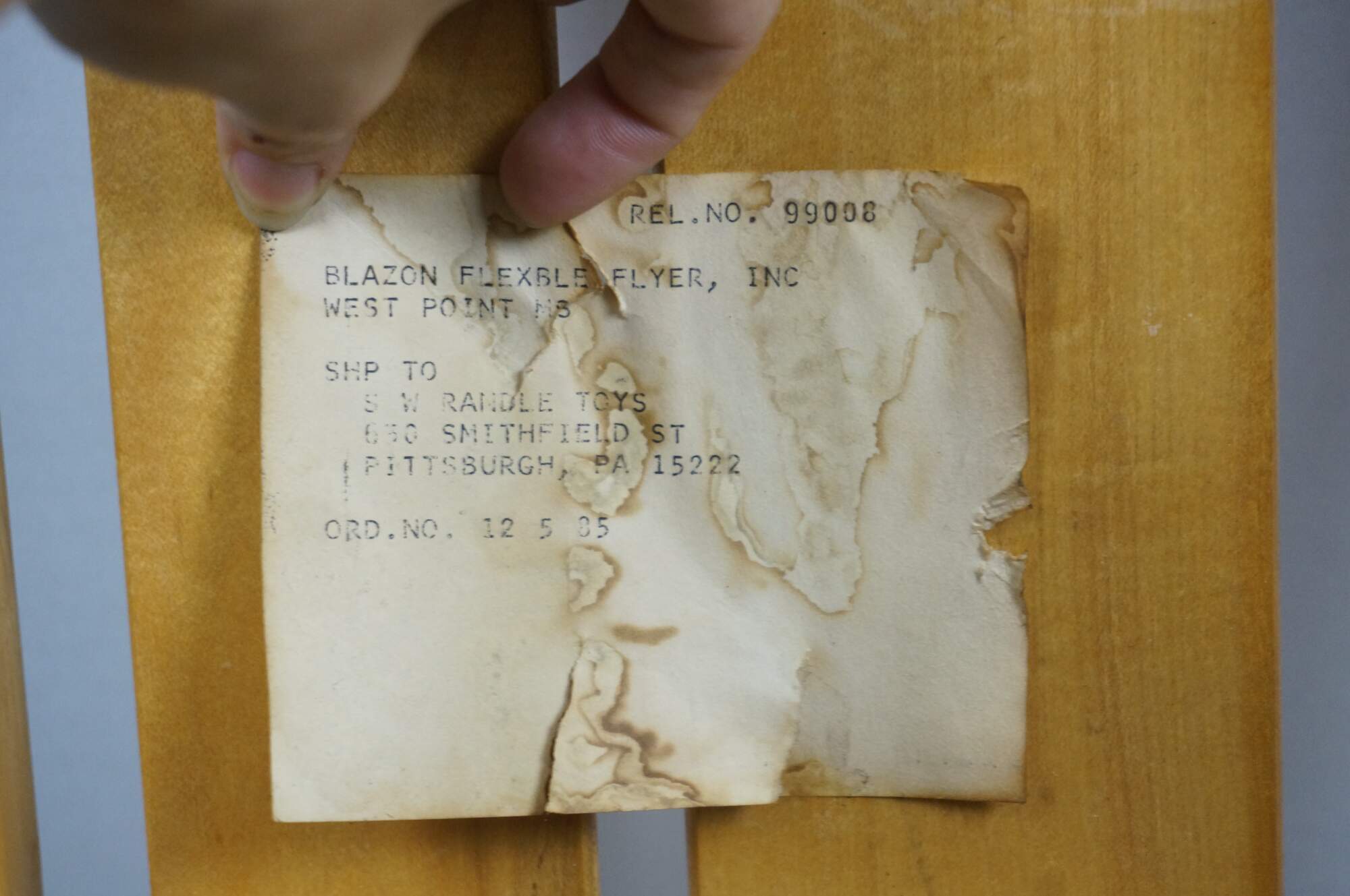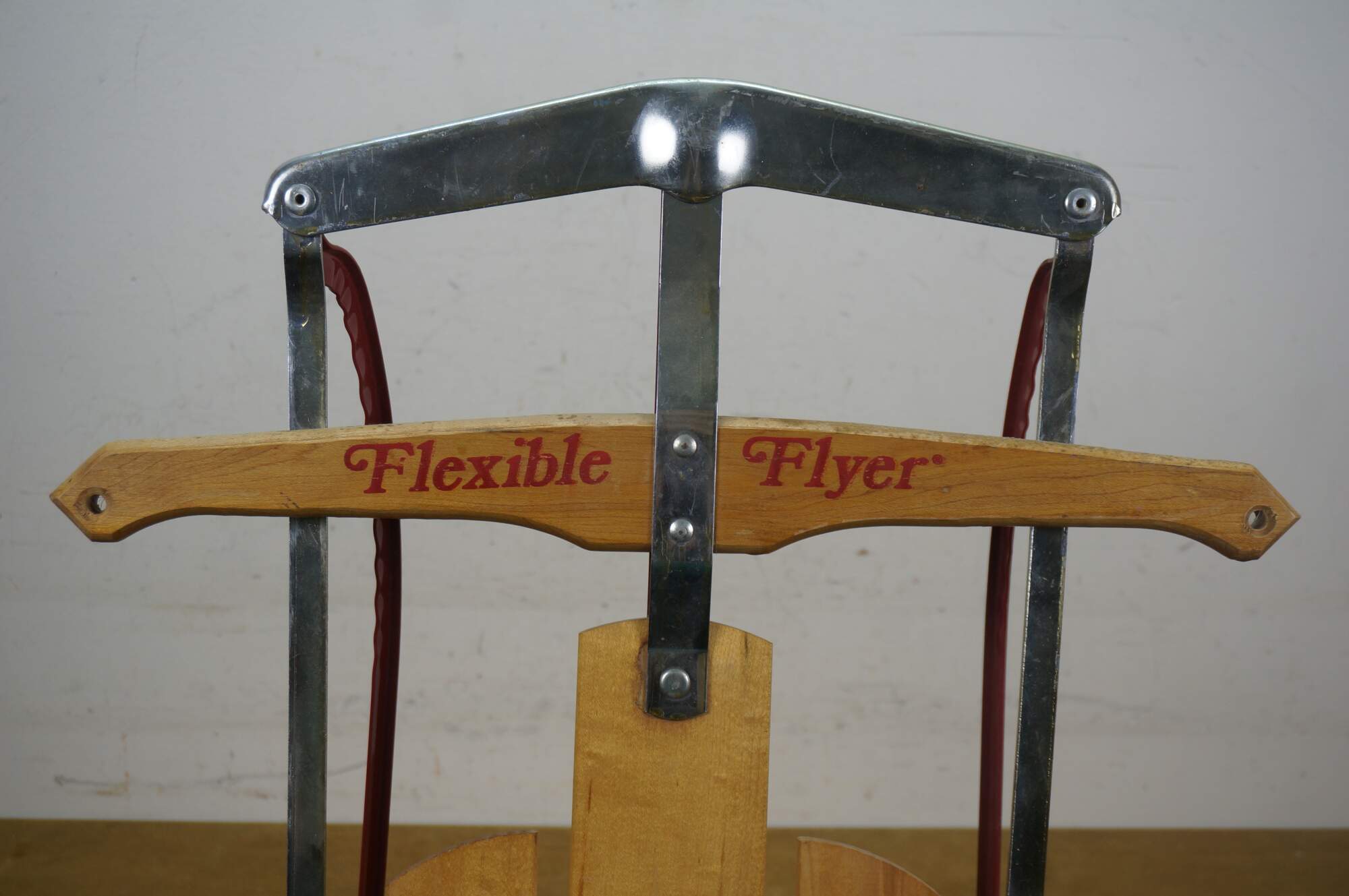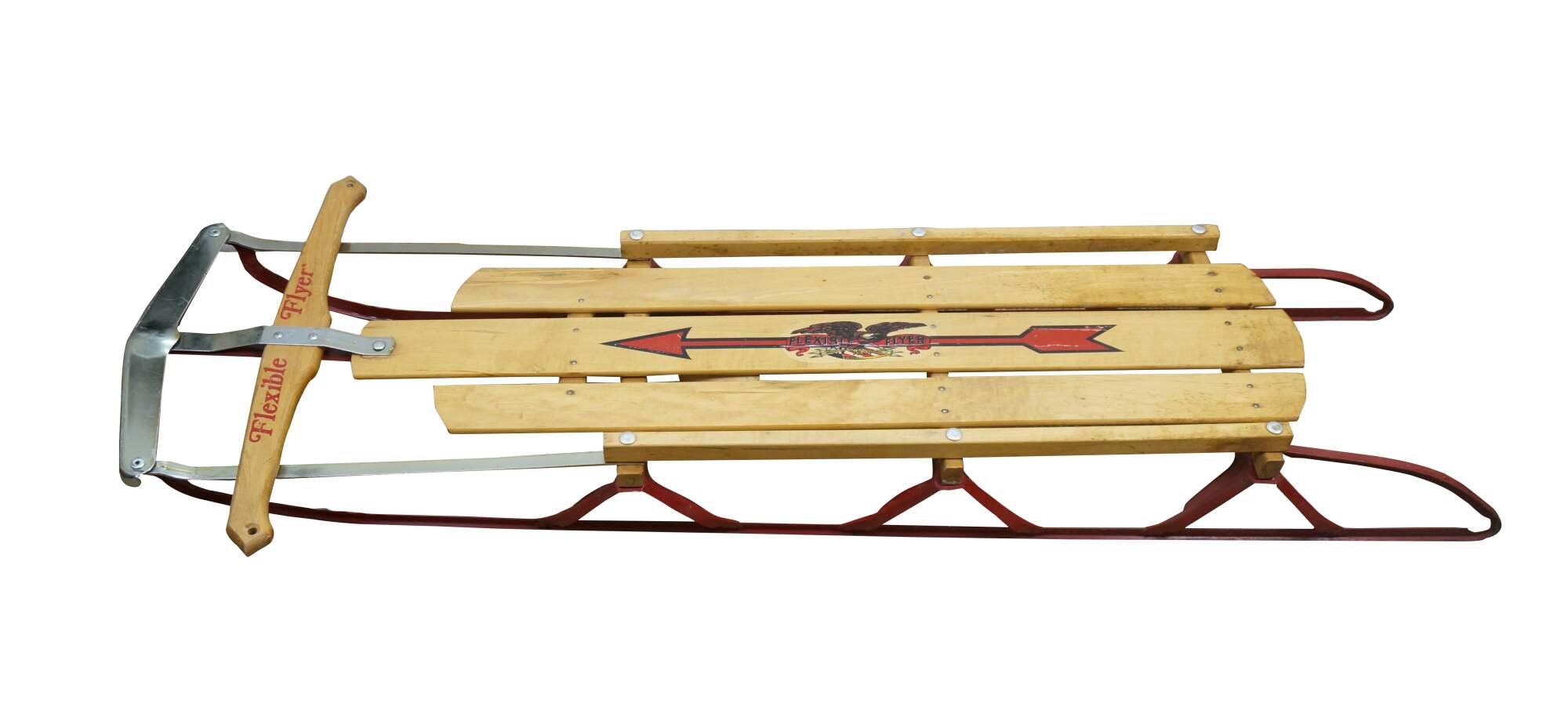 "Flexible Flyer is a toy and recreational equipment brand, best known for the sled of the same name, a steerable wooden sled with steel runners. Flexible Flyers are flexible both in design and usage. Riders may sit upright on the sled or lie on their stomachs, allowing the possibility to descend a snowy slope feet-first or head-first. To steer the sled, riders may either push on the wooden cross piece with their hands or feet, or pull on the rope attached to the wooden cross-piece. Shifting the cross-piece one way or the other causes the flexible rails to bend, turning the sled. Samuel Leeds Allen patented the Flexible Flyer in 1889 in Cinnaminson, New Jersey, using local children and adults to test prototypes. Allen's company flourished by selling these speedy and yet controllable sleds at a time when others were still producing toboggans and "gooseneck" sleds. Allen began producing sleds in his farm equipment factory to keep his workers busy even when it was not the farm season. He developed many prototypes before he created the Flexible Flyer. The sleds did not sell well until he began marketing them to the toy departments of department stores. In 1915, around 120,000 Flexible Fliers were sold, and almost 2,000 Flexible Flyers were sold in one day. In 1968, Leisure Group of Los Angeles, California, bought the S. L. Allen Company. Leisure Group continued to produce Flexible Flyers in Medina, Ohio. In 1973, a group of private investors bought Leisure Group's toy division and started manufacturing the sleds under the name "Blazon Flexible Flyer" in West Point, Mississippi. In 1993, Roadmaster purchased the rights to production and moved production to Olney, Illinois, and in 1998, production was moved to China. As of 2012, Flexible Flyers are mostly made in China, and some are made in South Paris, Maine, by Paricon, Inc." (Source: Wikipedia)