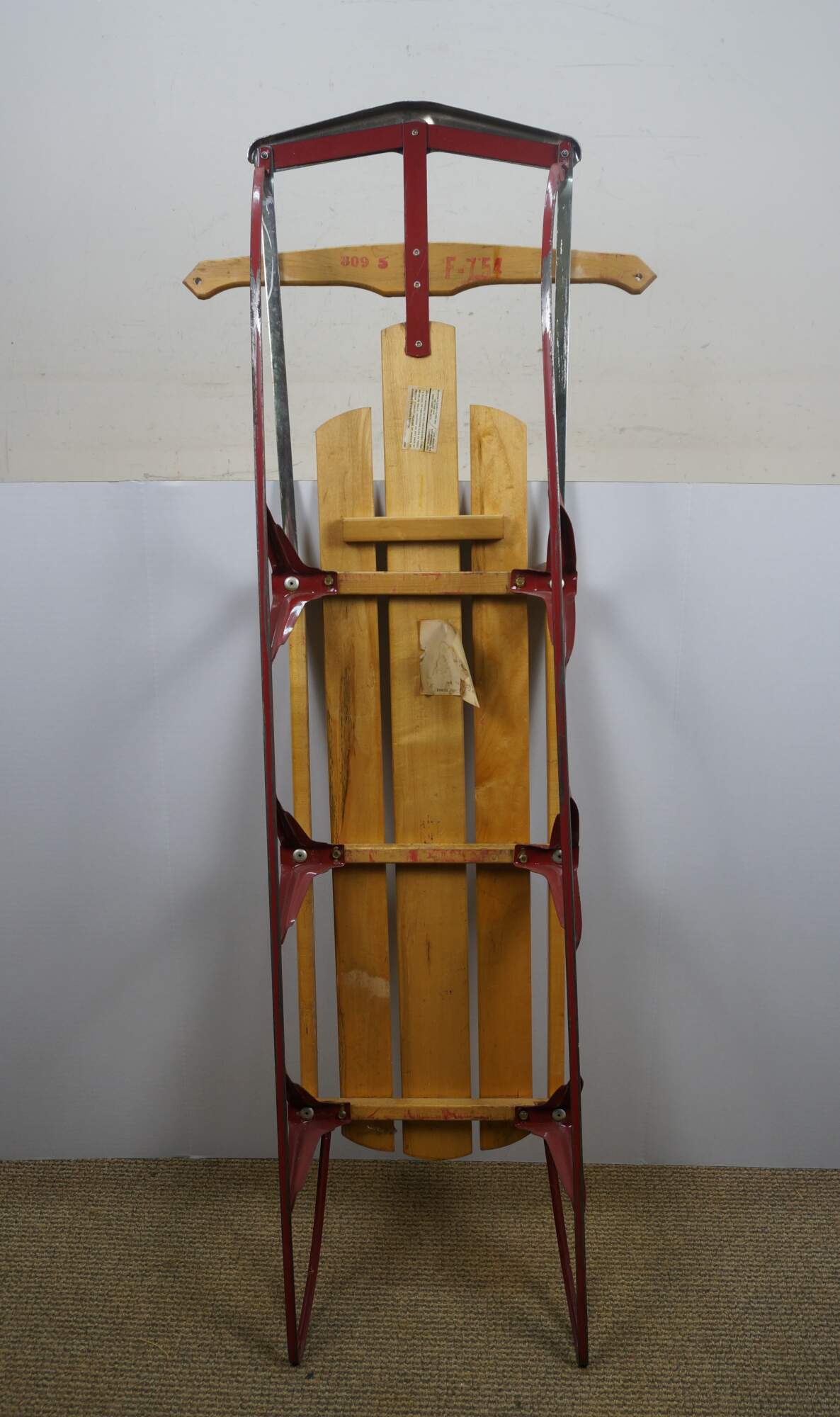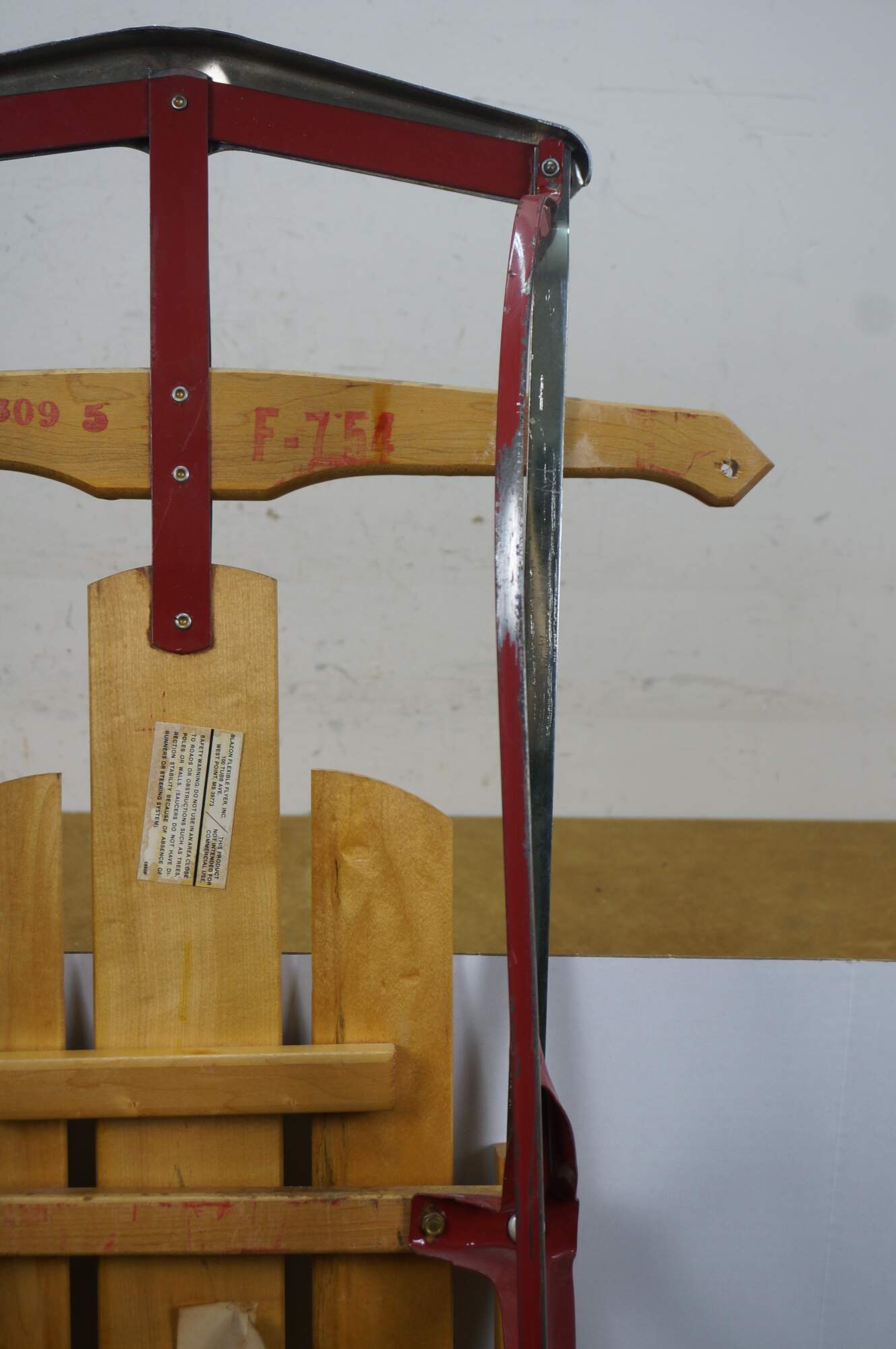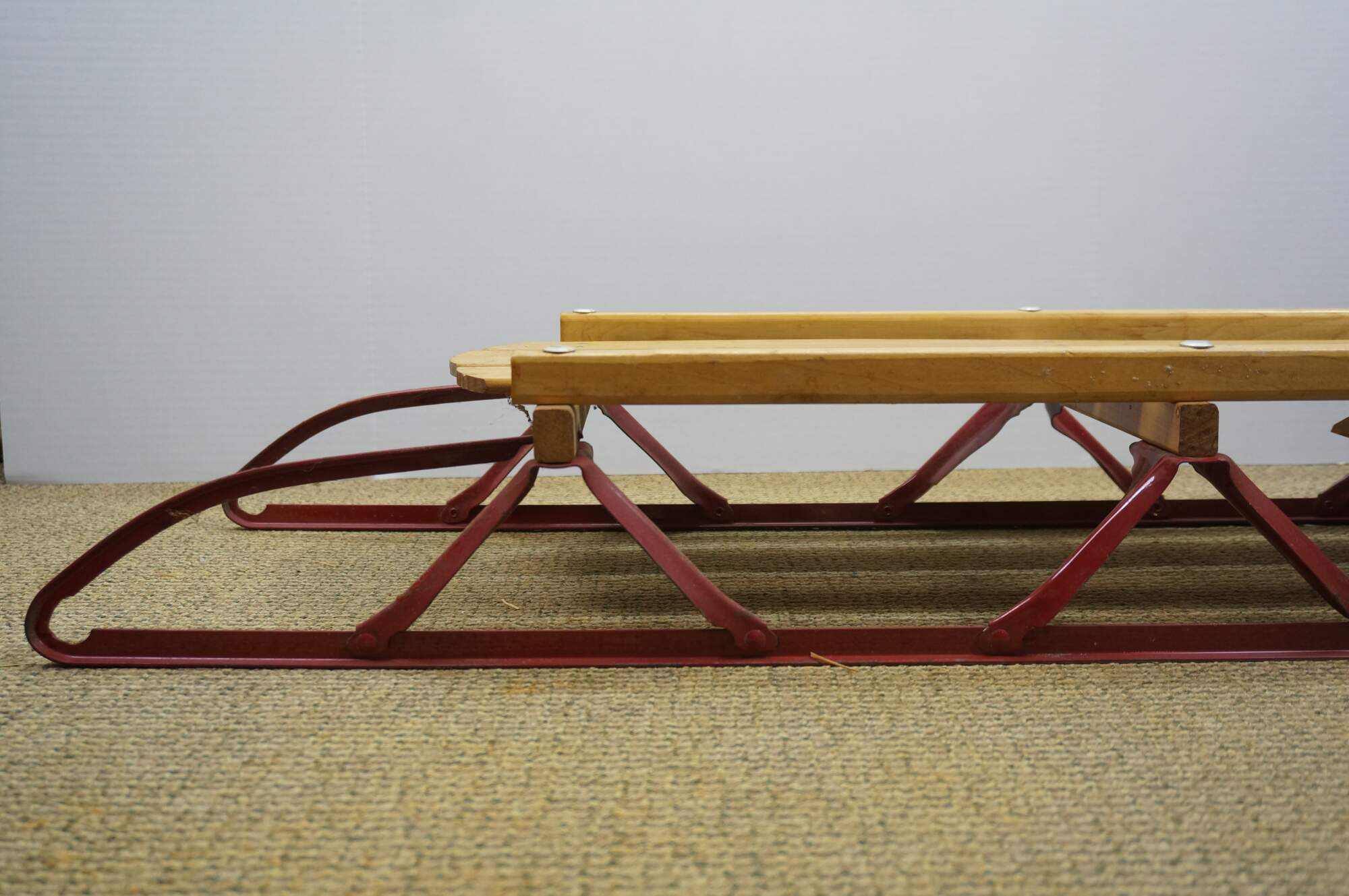 Circa 1970's Blazon Flexible Flyer winter sled. Crafted of wood slats with red-painted iron runners. Marked on reverse 309 5 / F-754. Blazon Flexible Flyer, Inc., West Point, MS.