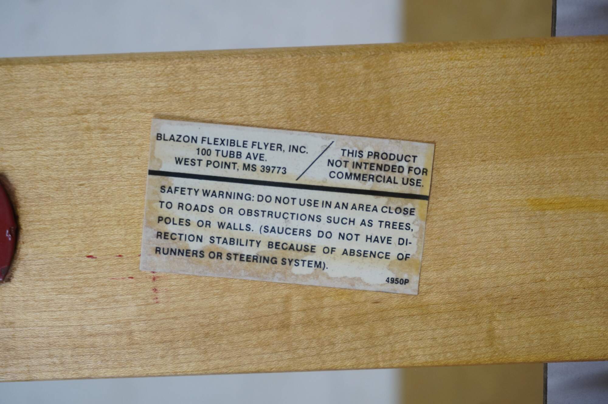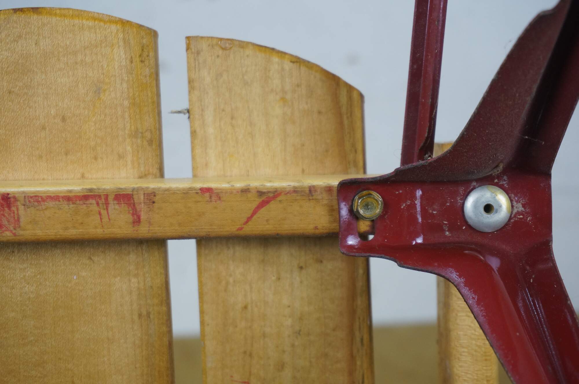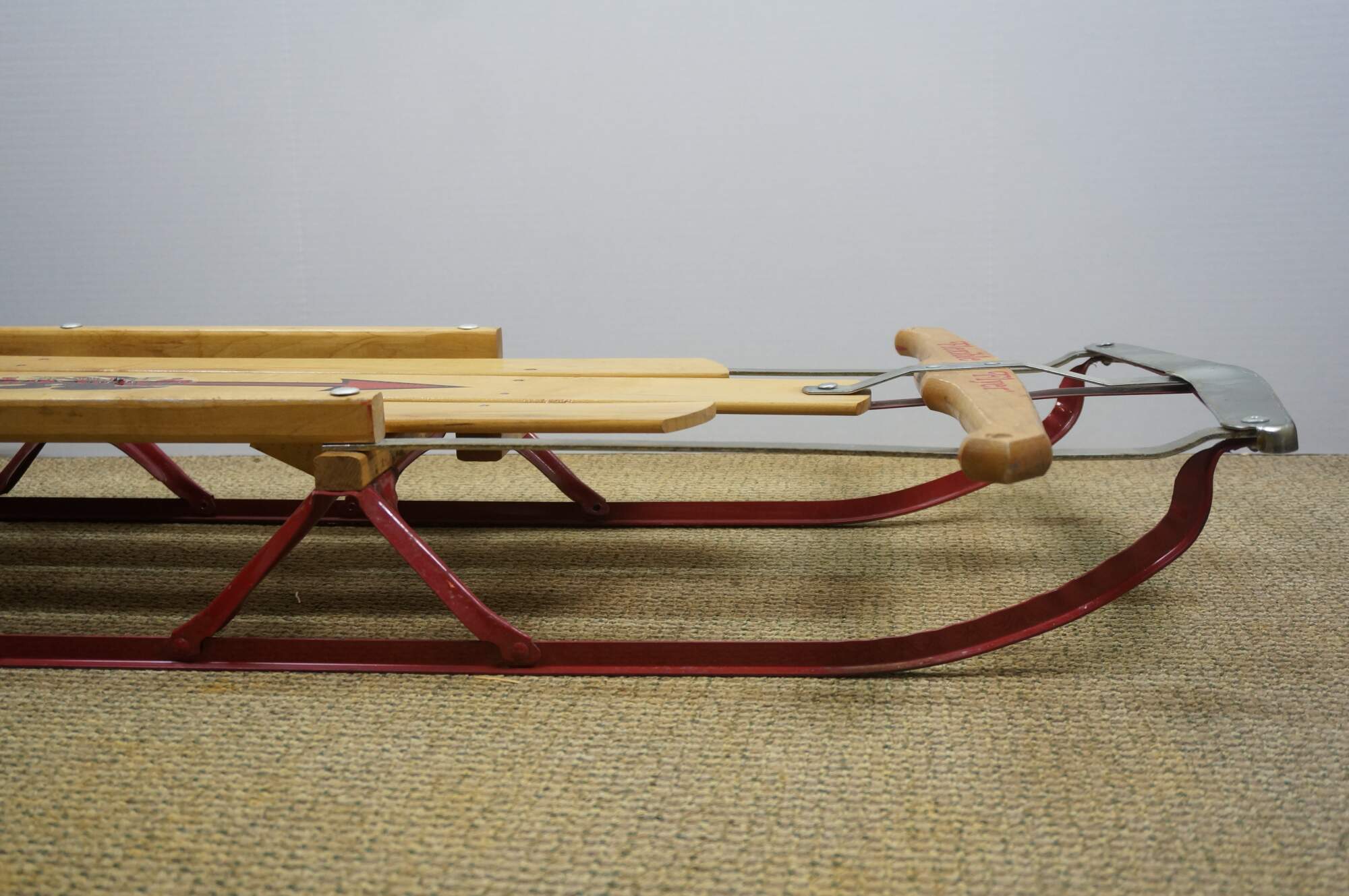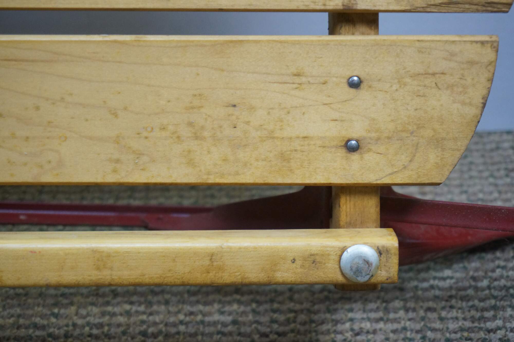 Circa 1970's Blazon Flexible Flyer winter sled. Crafted of wood slats with red-painted iron runners. Marked on reverse 309 5 / F-754. Blazon Flexible Flyer, Inc., West Point, MS.