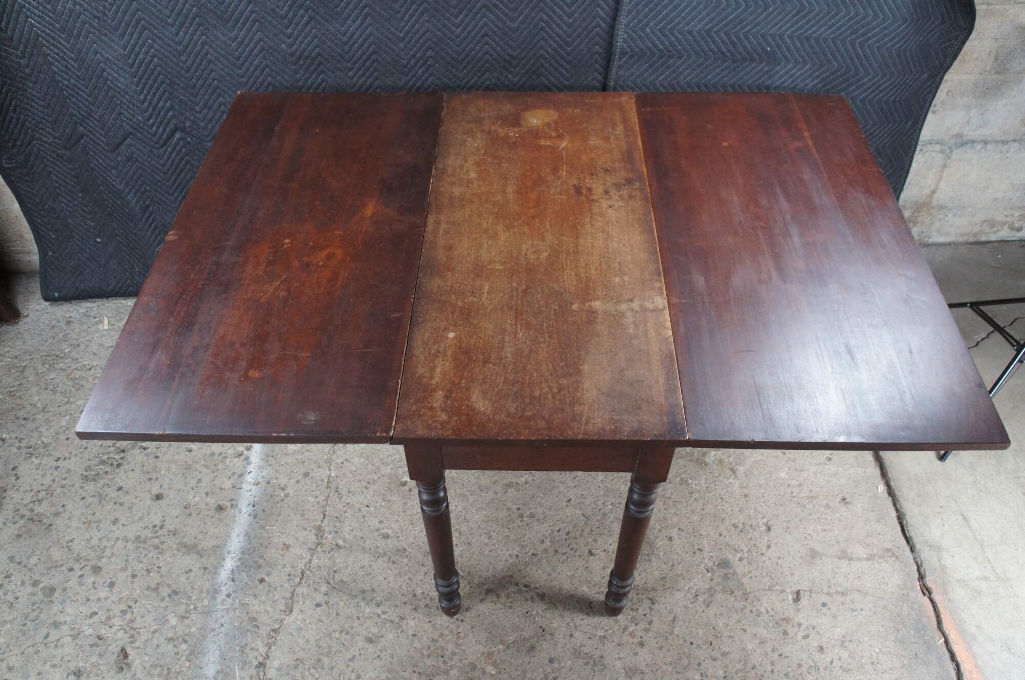 Fair; Structurally solid; top is weathered from use and age. Staining and finish loss