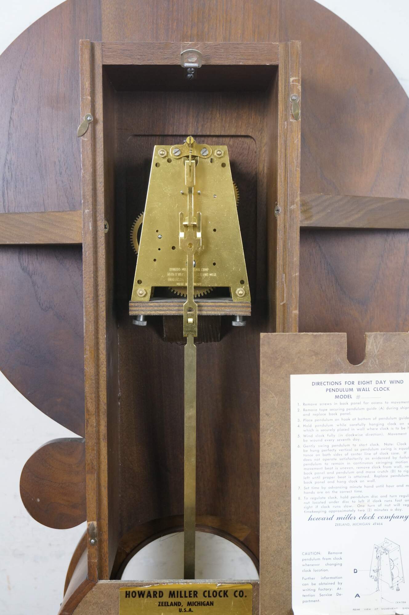 Mid 20th century Howard Miller 8 day, key wound, calendar wall clock, Model 644. Figure eight walnut case with carved details. Brass pendulum. Black speckled white face with black Roman numerals, Arabic numerals for date, and hands (missing date hand). UW 21/21 / Howard Miller Clock Company / No (0) Jewels / Zeeland, Michigan / Unadjusted / Made in Germany.