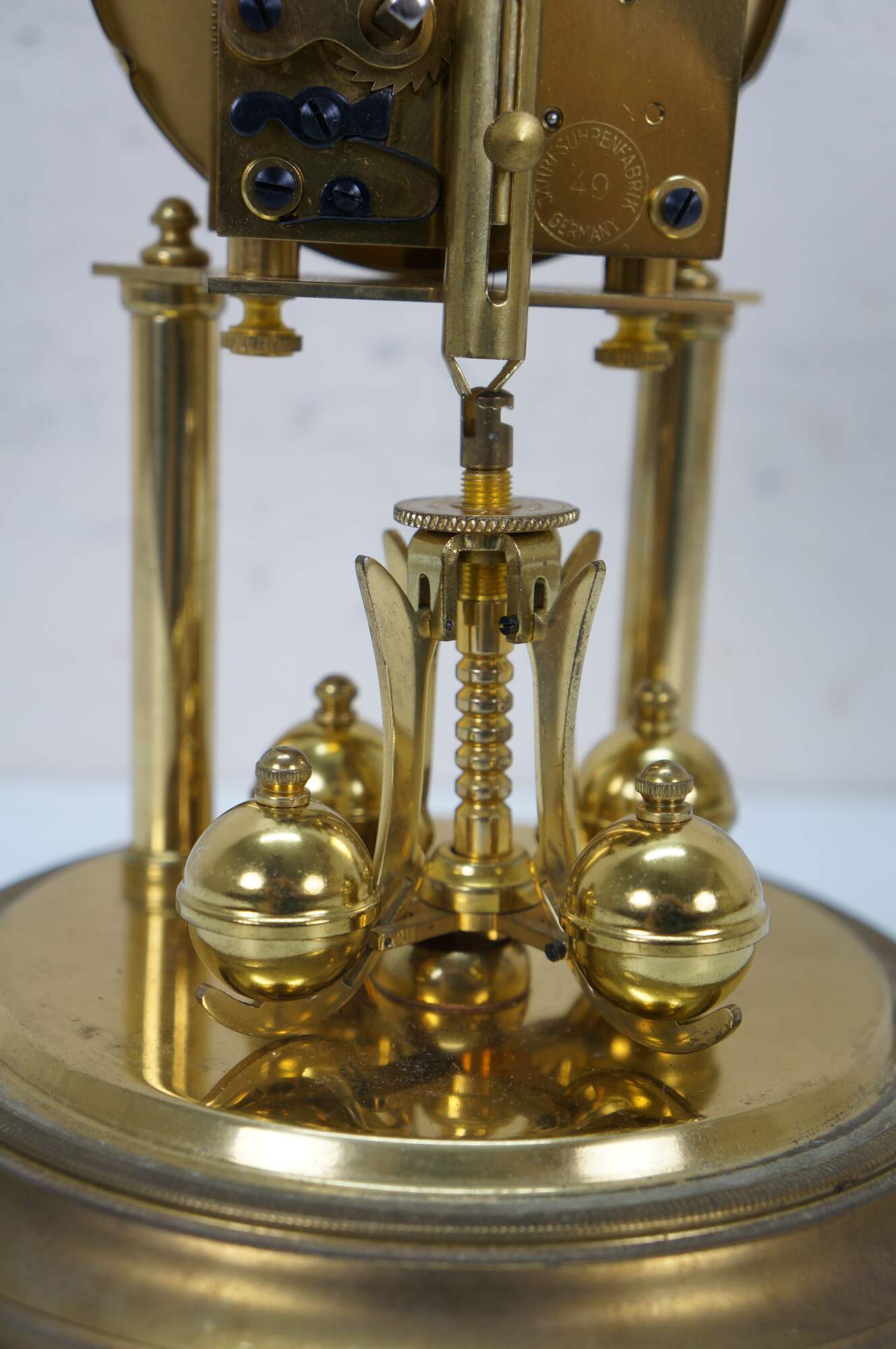 Vintage 1953 400 day Schatz anniversary clock. Brass clock with metallic painted plastic base, cased in a glass bell jar. Off white round face over two plain columns, with gilt Arabic numerals and hands. Movement marked: RR - No (0) Jewels Unadjusted - 3 - 53 - Jahresuhrenfabrik 49 Germany. Two leveling feet on base. Made in Germany.