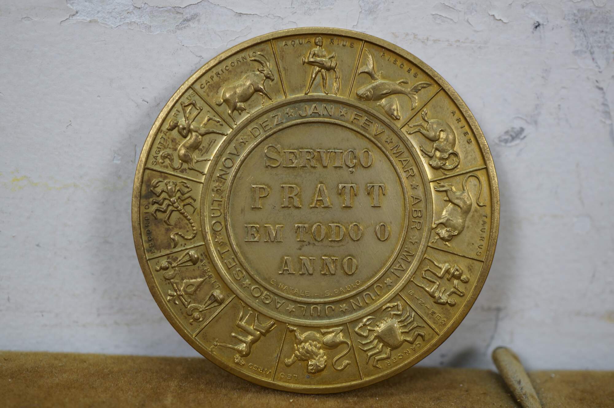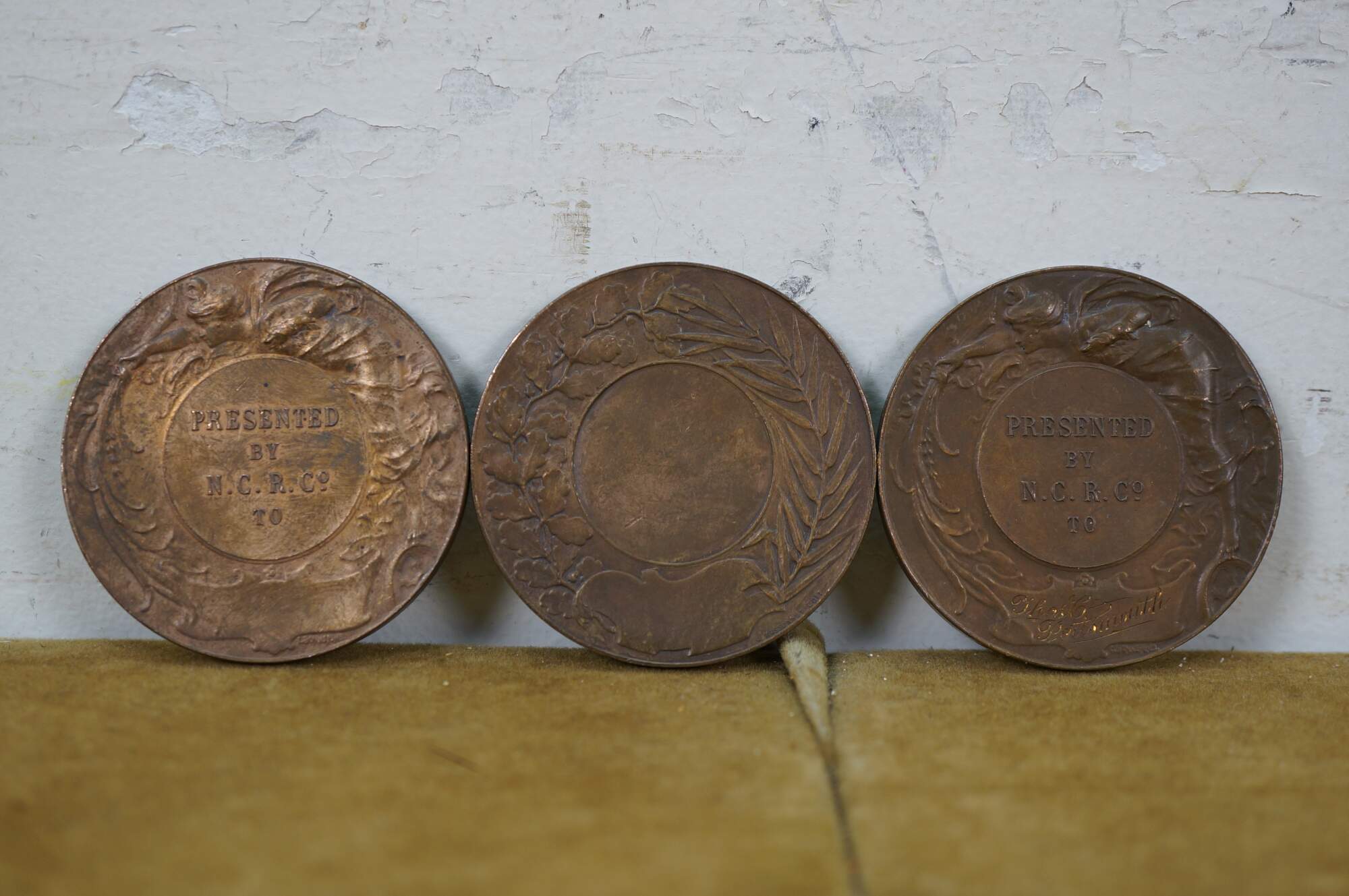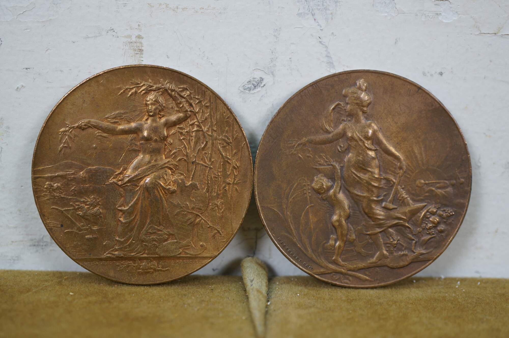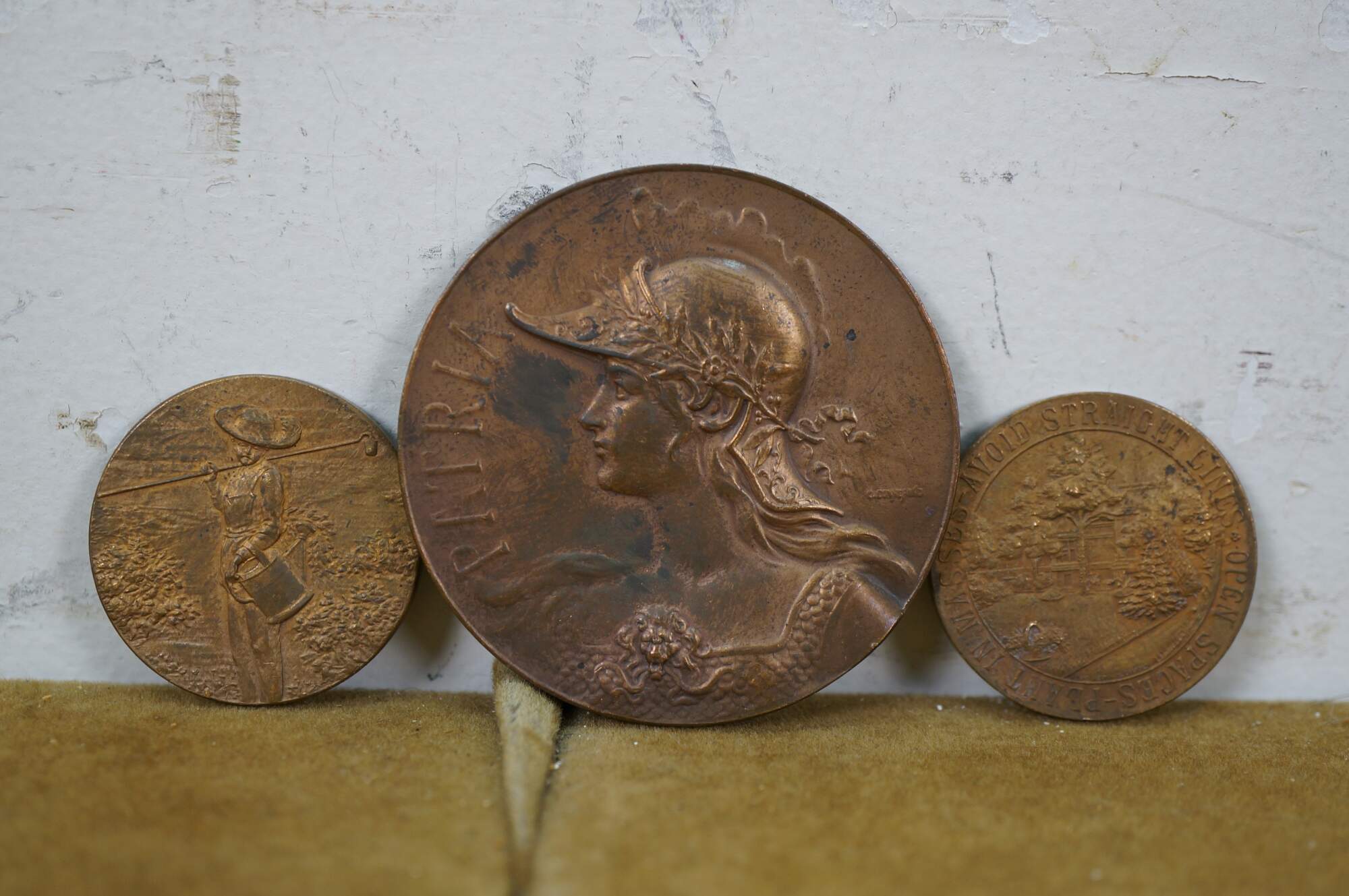 Lot of 12 rare antique employee recognition / appreciation bronze medals / medallions / plaques / coins. Designs include: Two from Casa Pratt, Brasil for "Service All Year Round" - C. Natale - S. Paulo. Three with seated neoclassical woman holding out a laurel wreath over the motto "Av Merite" (Of Merit) - one with blank spaces for engraving on reverse; two marked "Presented by NCR Co to," and one including the name Thos. C. Portmouth - Massonnet, Edit. Man and woman in a garden - black spaces for engraving on reverse - A. Desaide, Edit. Horses, cattle, sheep and chickens - marked "Presented by National Cash Registers Co to" - Massonnet. Standing neoclassical woman next to tree and lyre - blank spaces on reverse - A. Desaide, Edit - A. Massoulle. Standing neoclassical woman with hammer and child - blank spaces on reverse - Massonnet, Edit. Farmer with watering can - blank space on reverse. Greco-Roman soldier with the word "Patria" - marked "Presented by NCR Co to" over a blank space on reverse. Landscape surrounded by the words "Plant in Masses - Avoid Straight Lines - Open Spaces" - blank space on reverse.