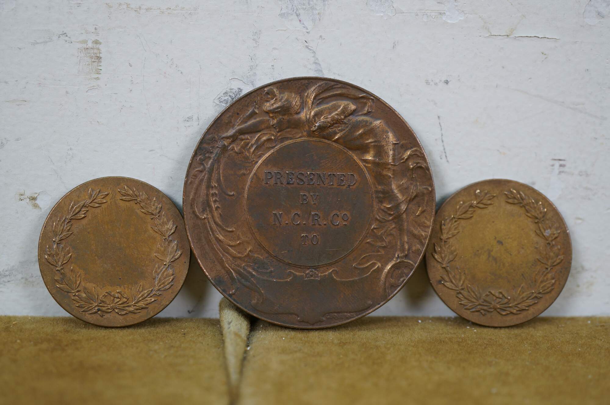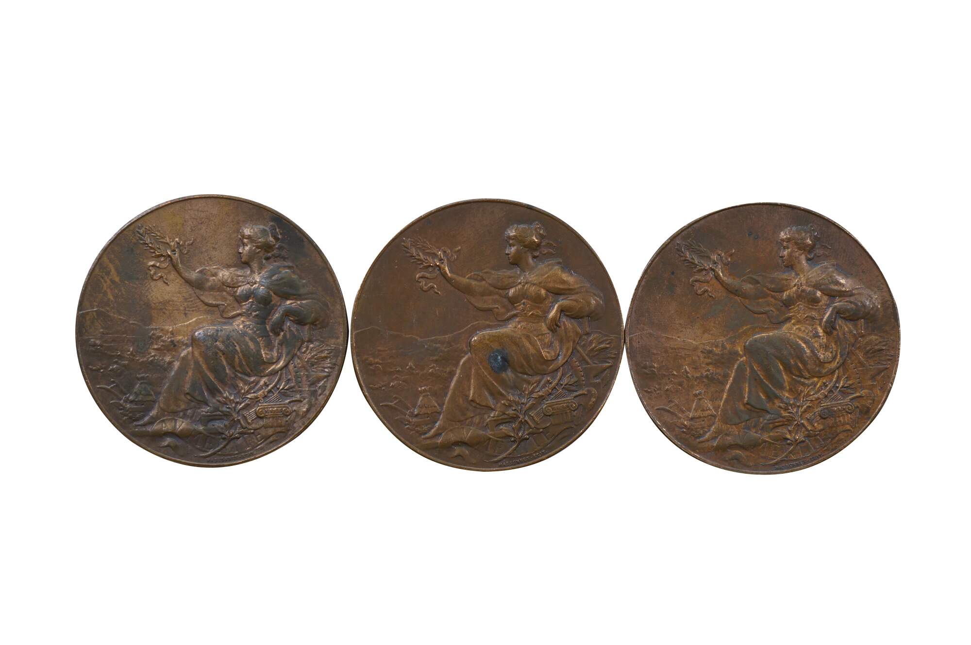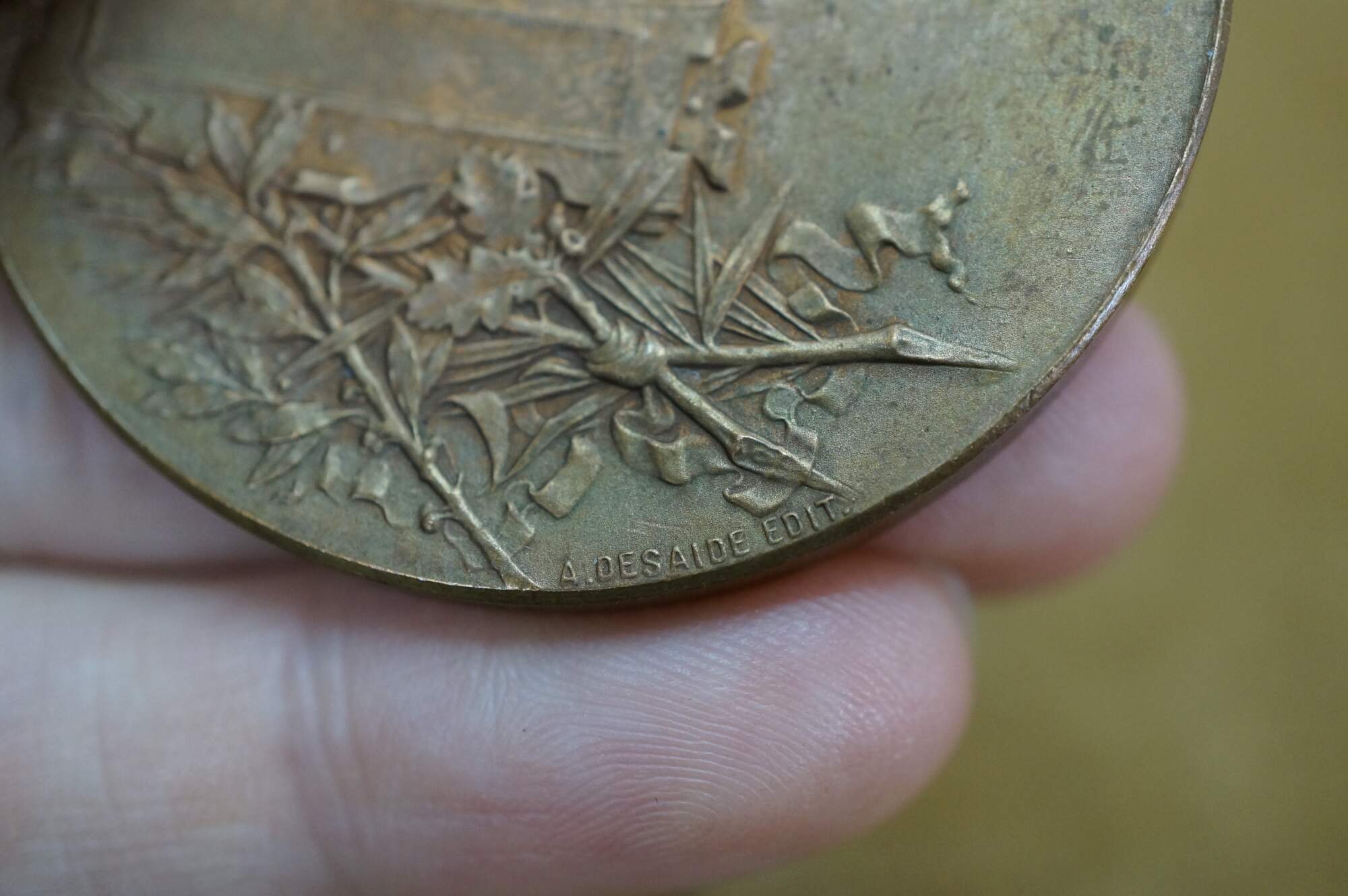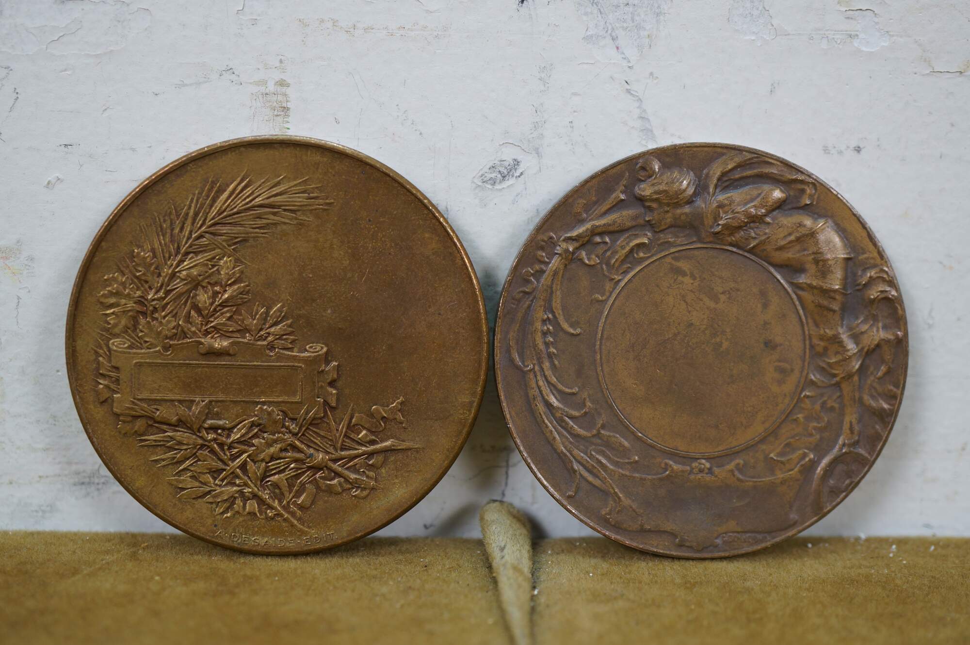 Lot of 12 rare antique employee recognition / appreciation bronze medals / medallions / plaques / coins. Designs include: Two from Casa Pratt, Brasil for "Service All Year Round" - C. Natale - S. Paulo. Three with seated neoclassical woman holding out a laurel wreath over the motto "Av Merite" (Of Merit) - one with blank spaces for engraving on reverse; two marked "Presented by NCR Co to," and one including the name Thos. C. Portmouth - Massonnet, Edit. Man and woman in a garden - black spaces for engraving on reverse - A. Desaide, Edit. Horses, cattle, sheep and chickens - marked "Presented by National Cash Registers Co to" - Massonnet. Standing neoclassical woman next to tree and lyre - blank spaces on reverse - A. Desaide, Edit - A. Massoulle. Standing neoclassical woman with hammer and child - blank spaces on reverse - Massonnet, Edit. Farmer with watering can - blank space on reverse. Greco-Roman soldier with the word "Patria" - marked "Presented by NCR Co to" over a blank space on reverse. Landscape surrounded by the words "Plant in Masses - Avoid Straight Lines - Open Spaces" - blank space on reverse.