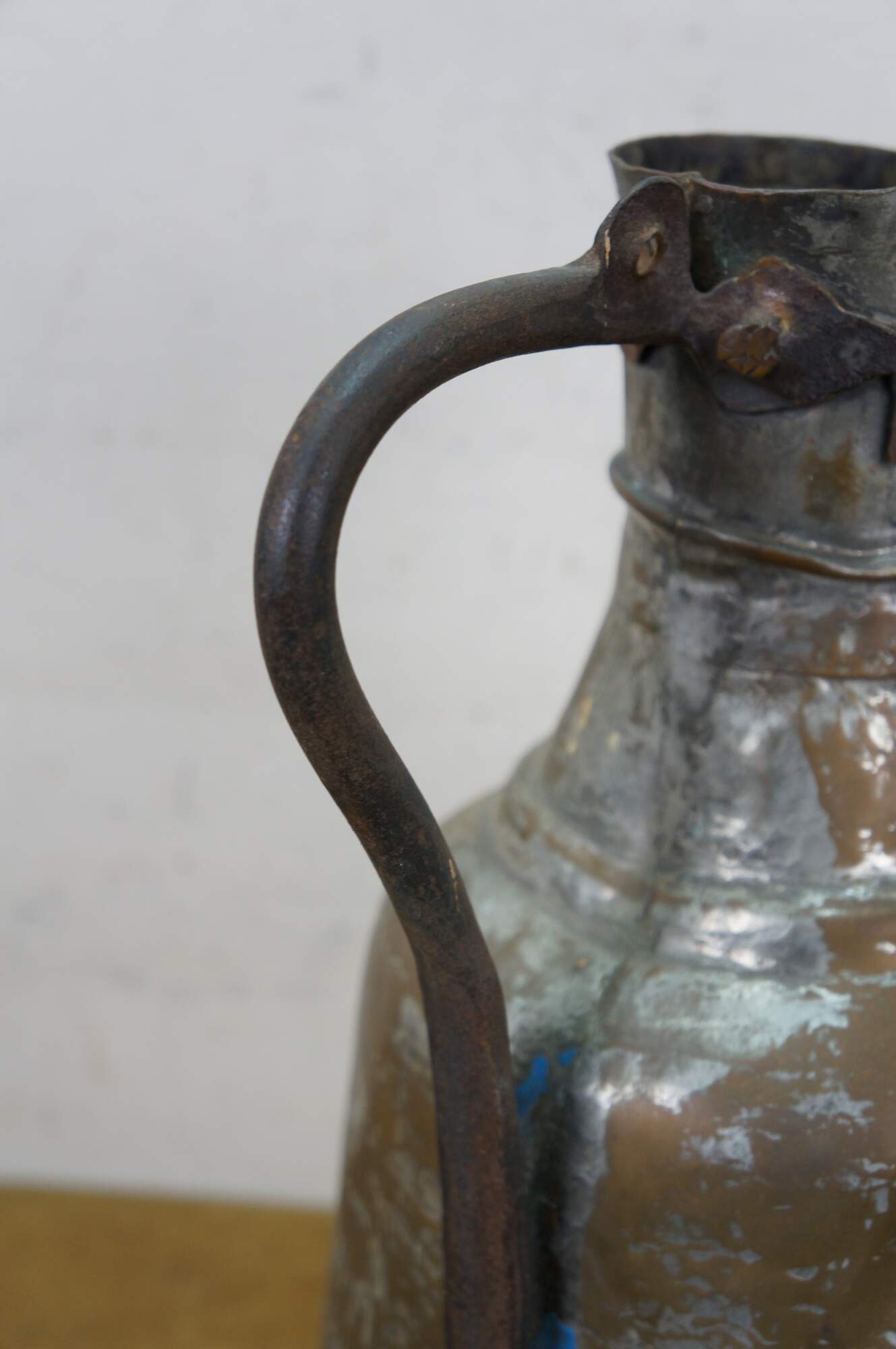 Antique 19th century Turkish hammered copper jug / pitcher with curved iron handle and triangular spout. Missing flip top lid.