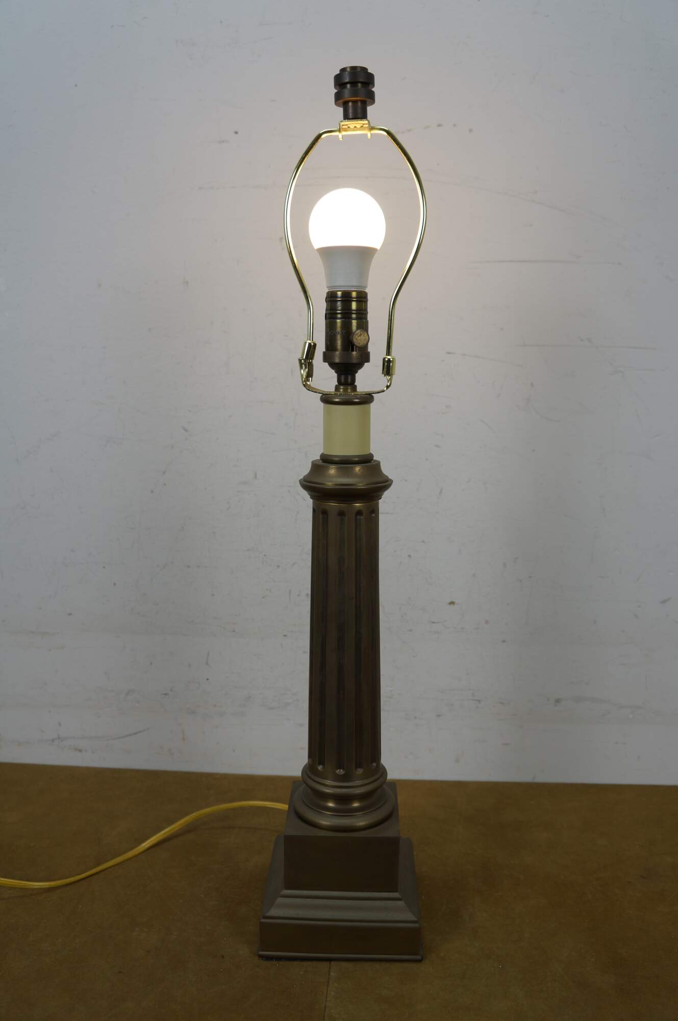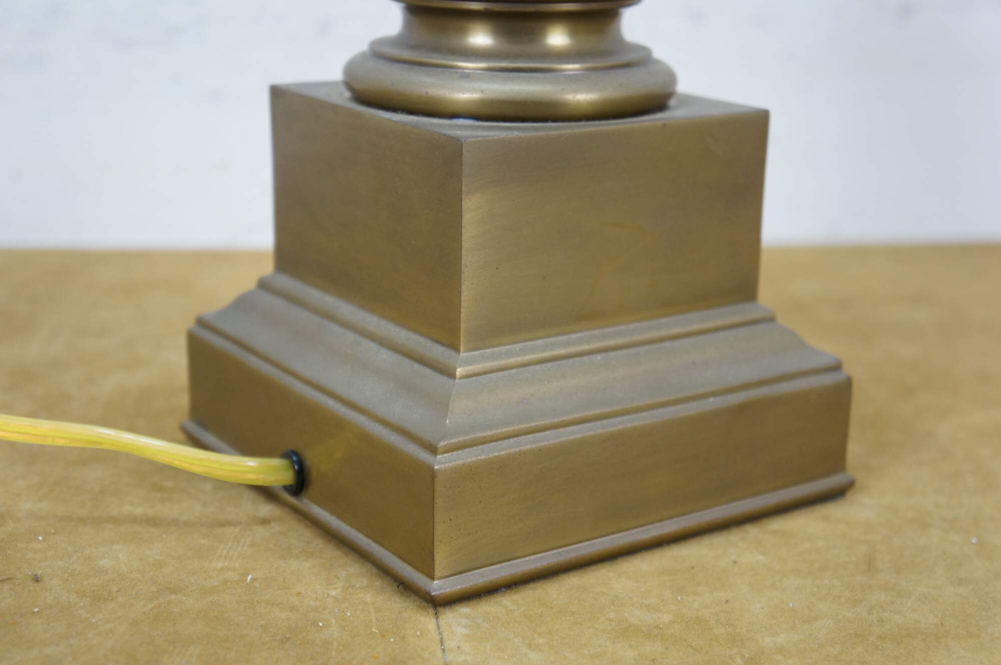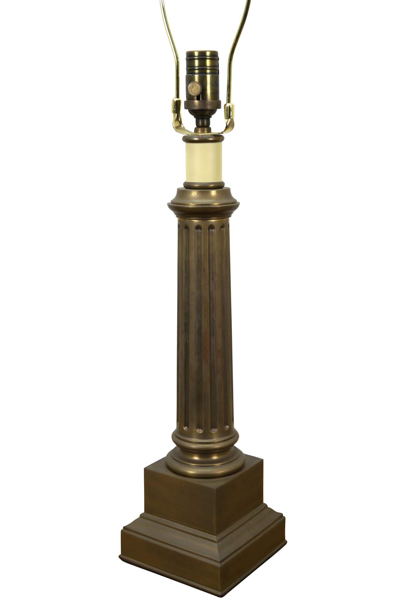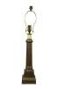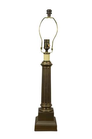Late 20th century heavy brass table lamp by Visual Comfort & Company in the shape of a neoclassical column / pillar on a square plinth. Includes harp and brass finial.