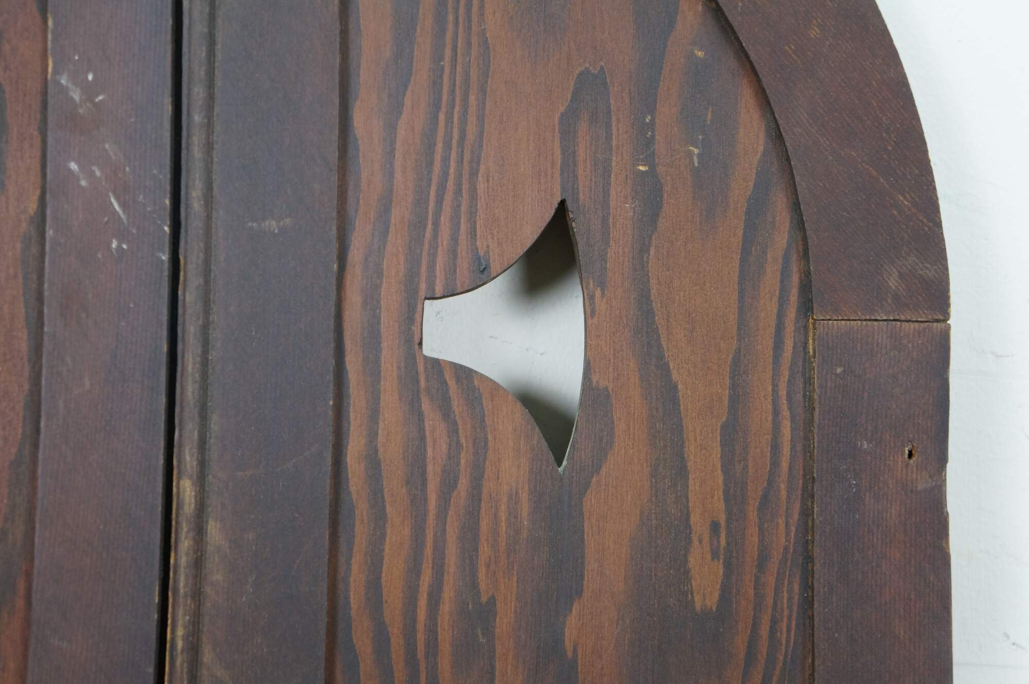Two matching pairs of vintage window storm shutters. Made of oak with an arch shaped with axe head shaped cut outs. Contemporary hinges.