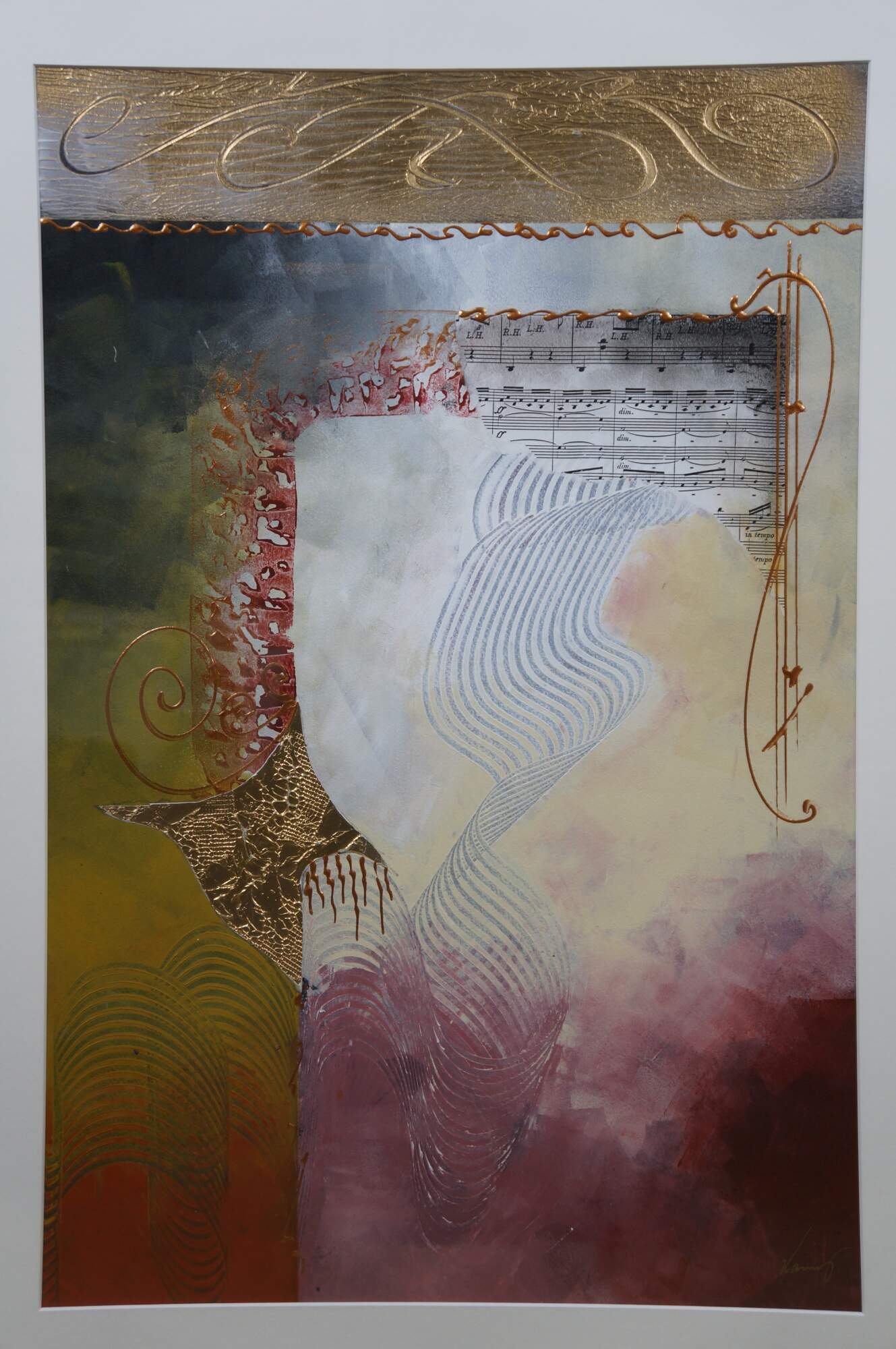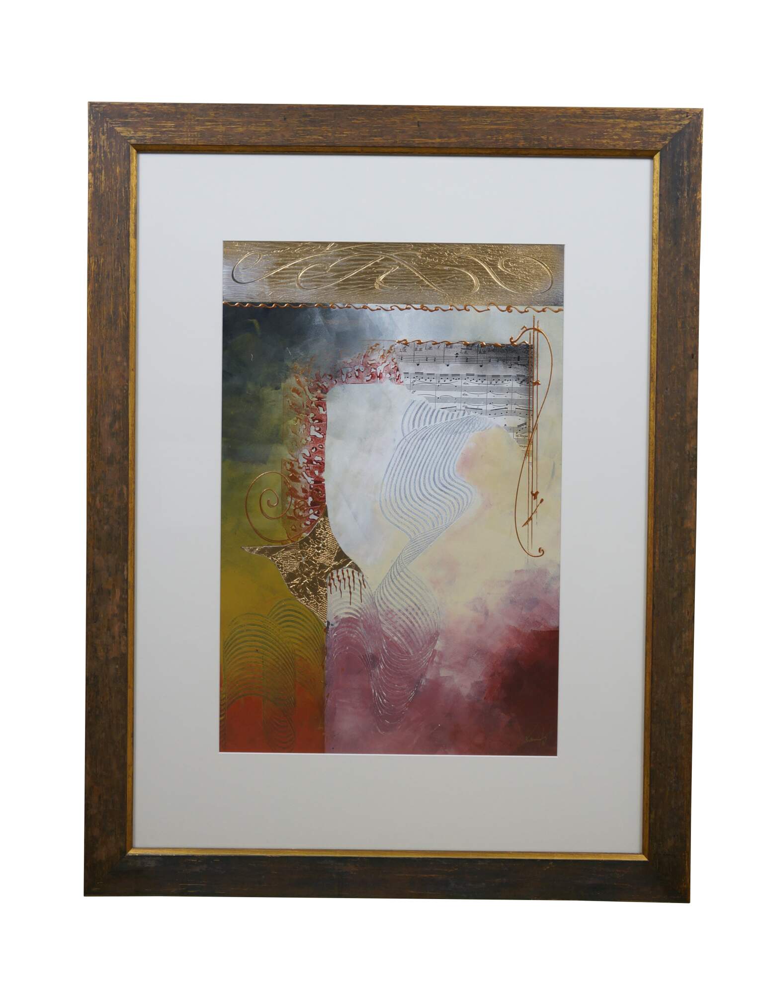 Set of three mixed media abstract triptych artworks by Kamy Deljou. Wood frames with a hint of gilding; white mat.