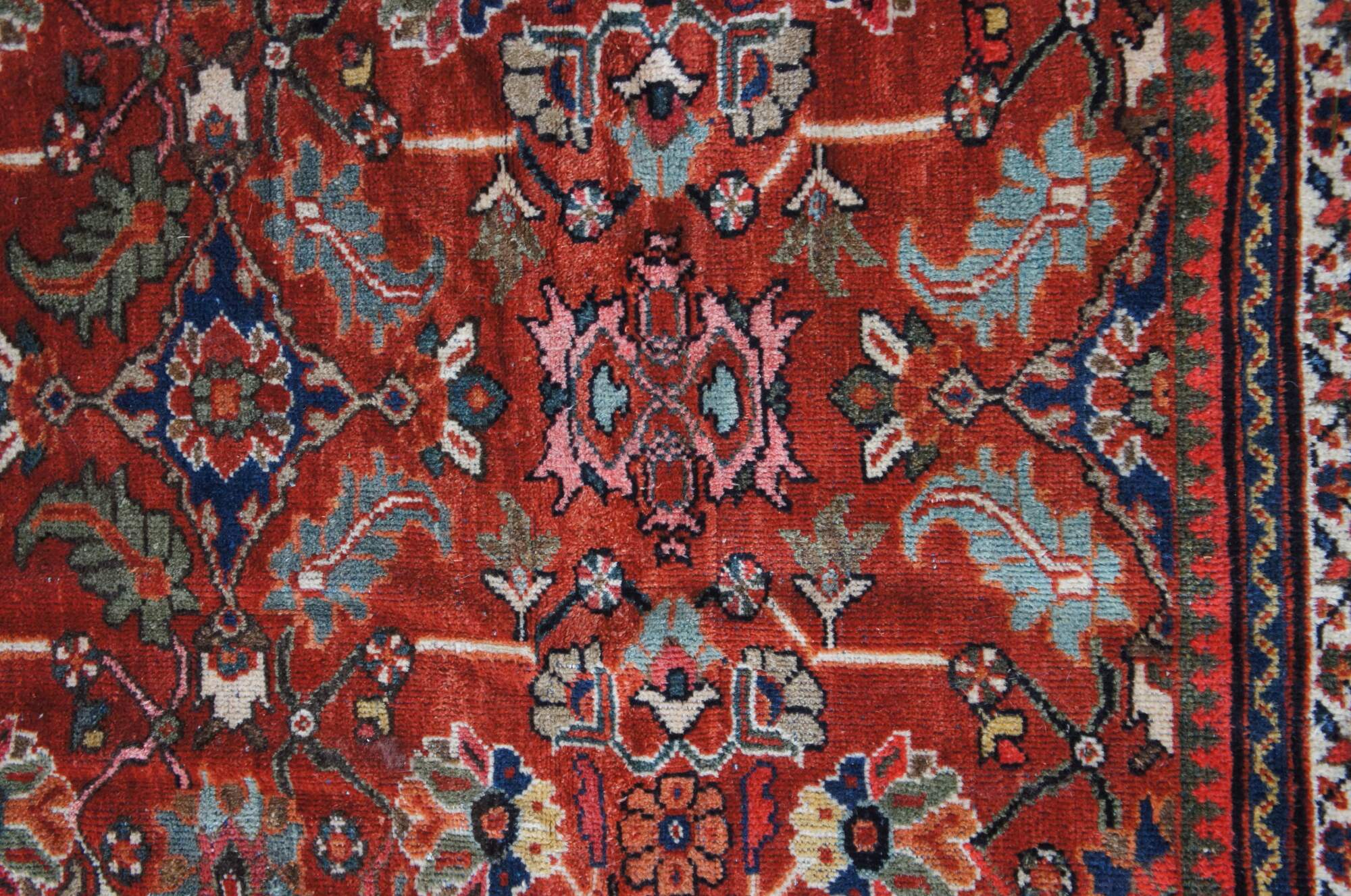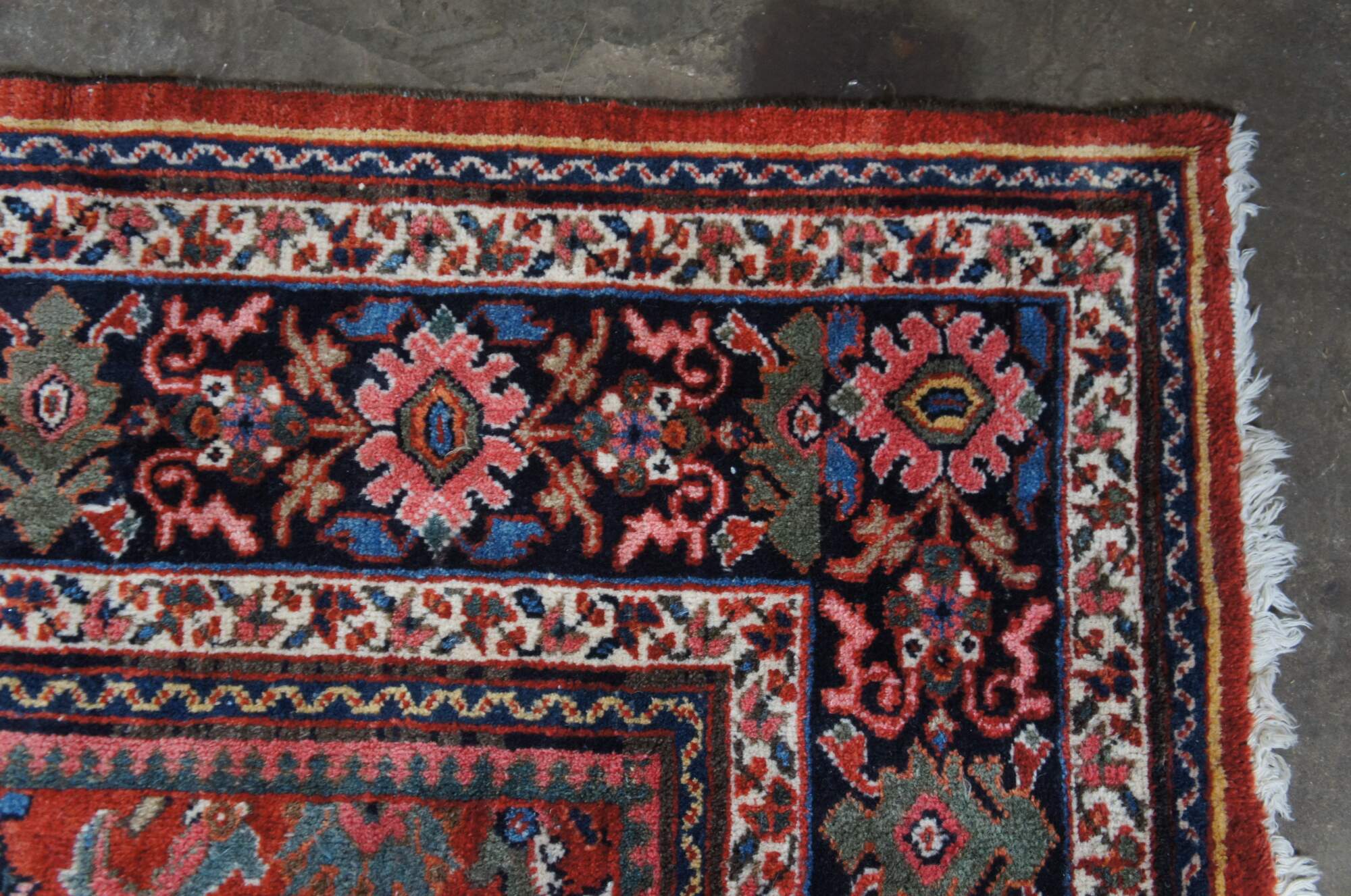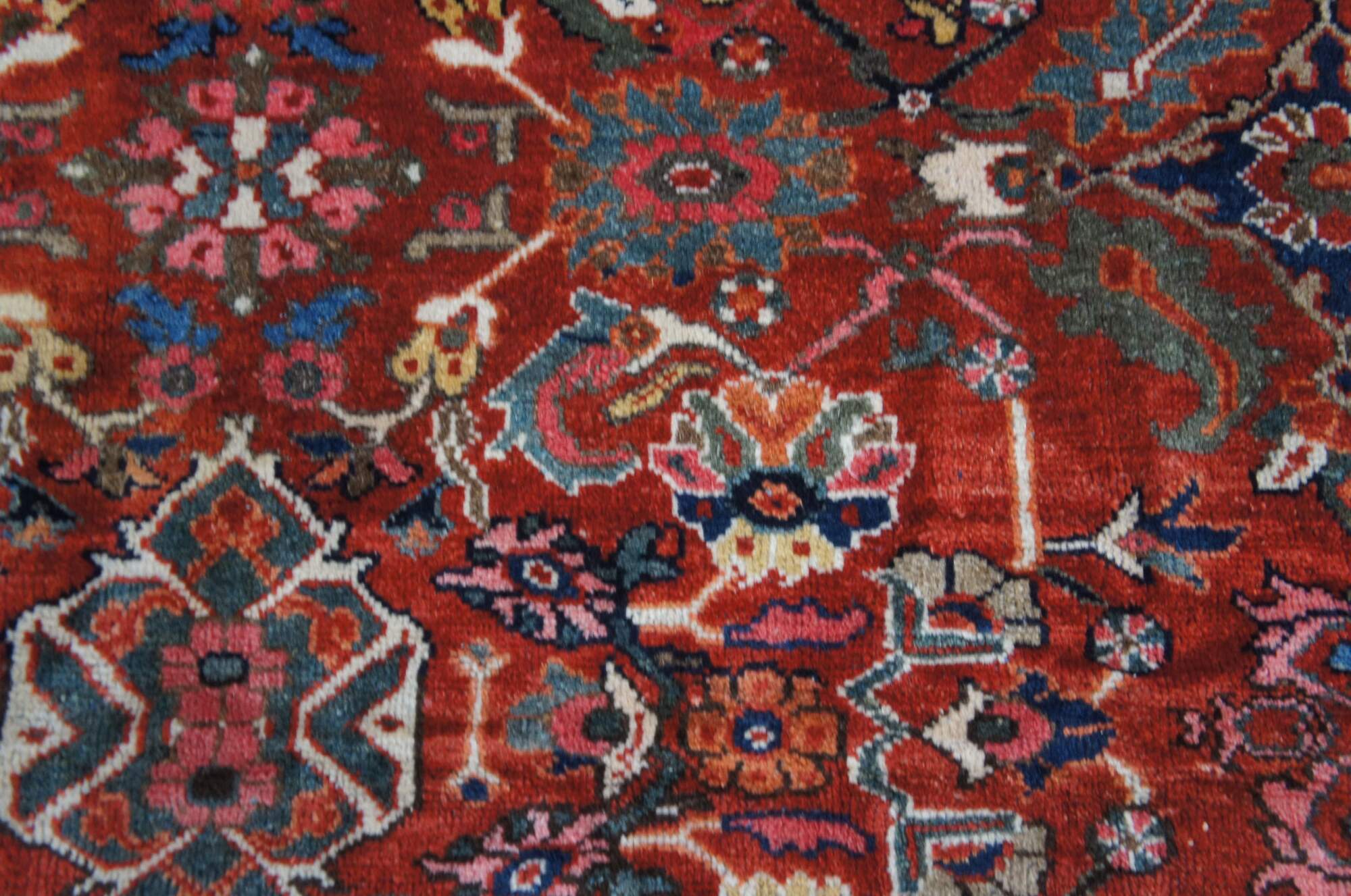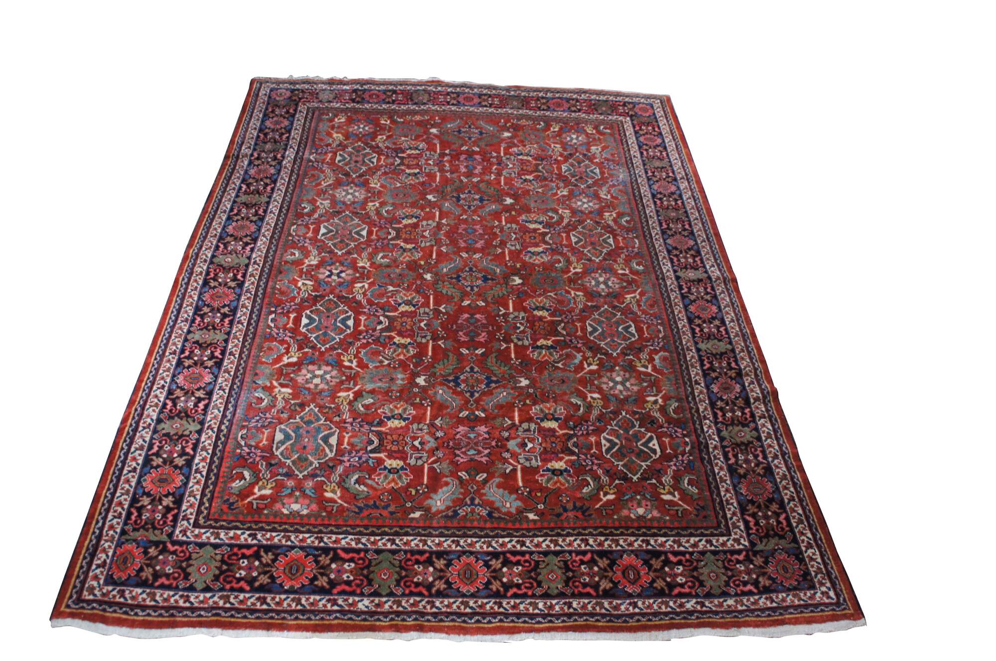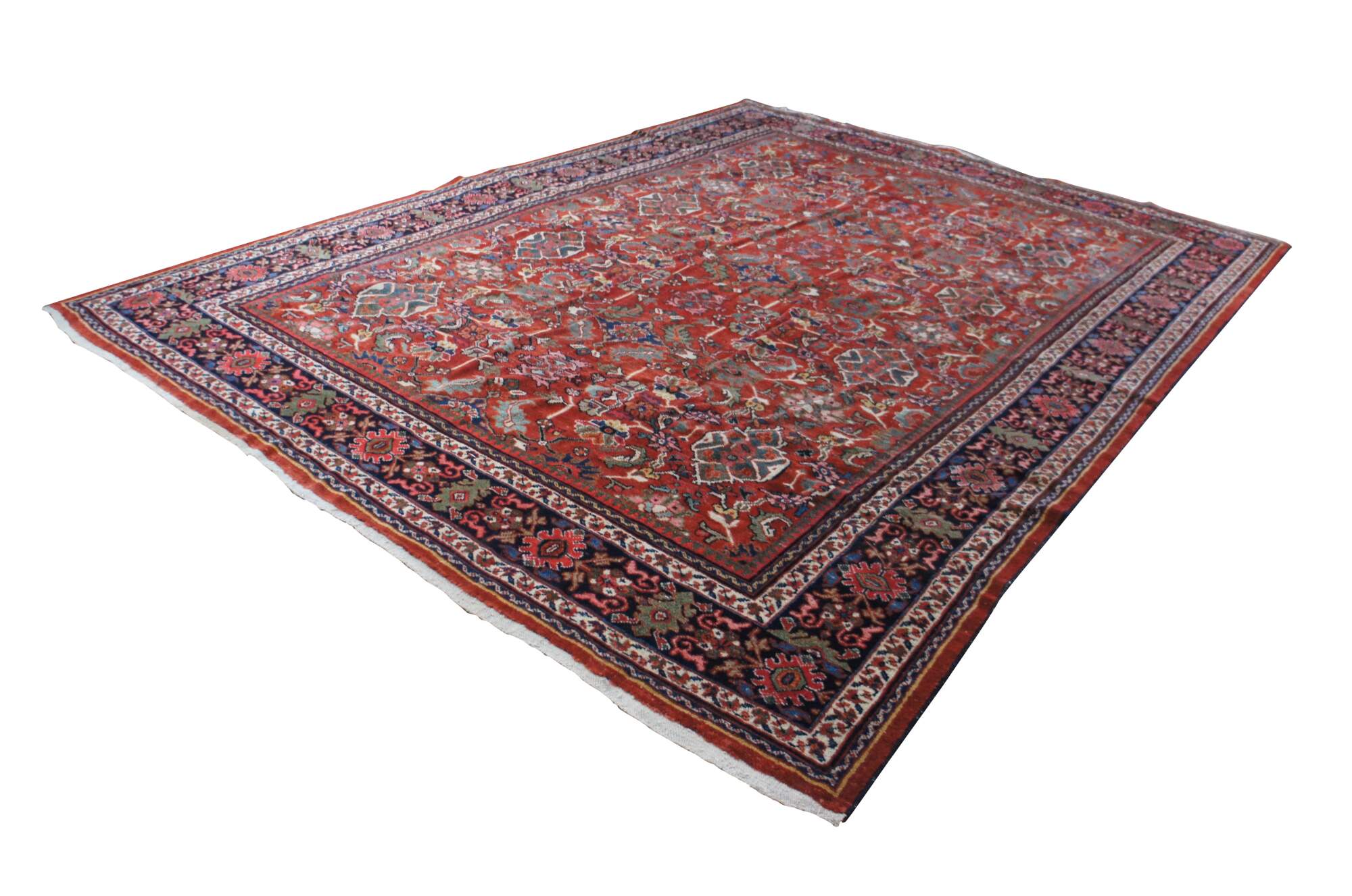A large and Impressive oriental geometric woold area rug. Features a hand knotted pile with geometric foliate designs. The foreground of the rug is red with blue, green, beige and pink accents.