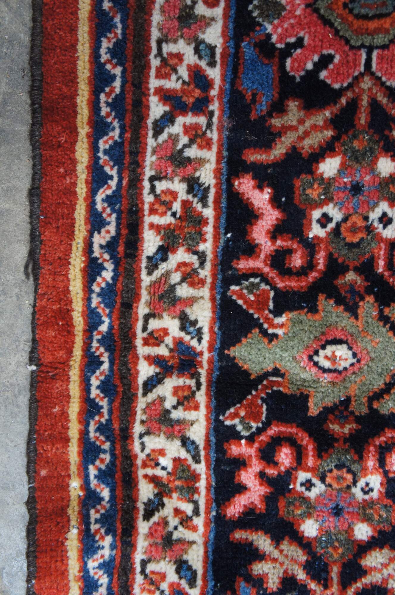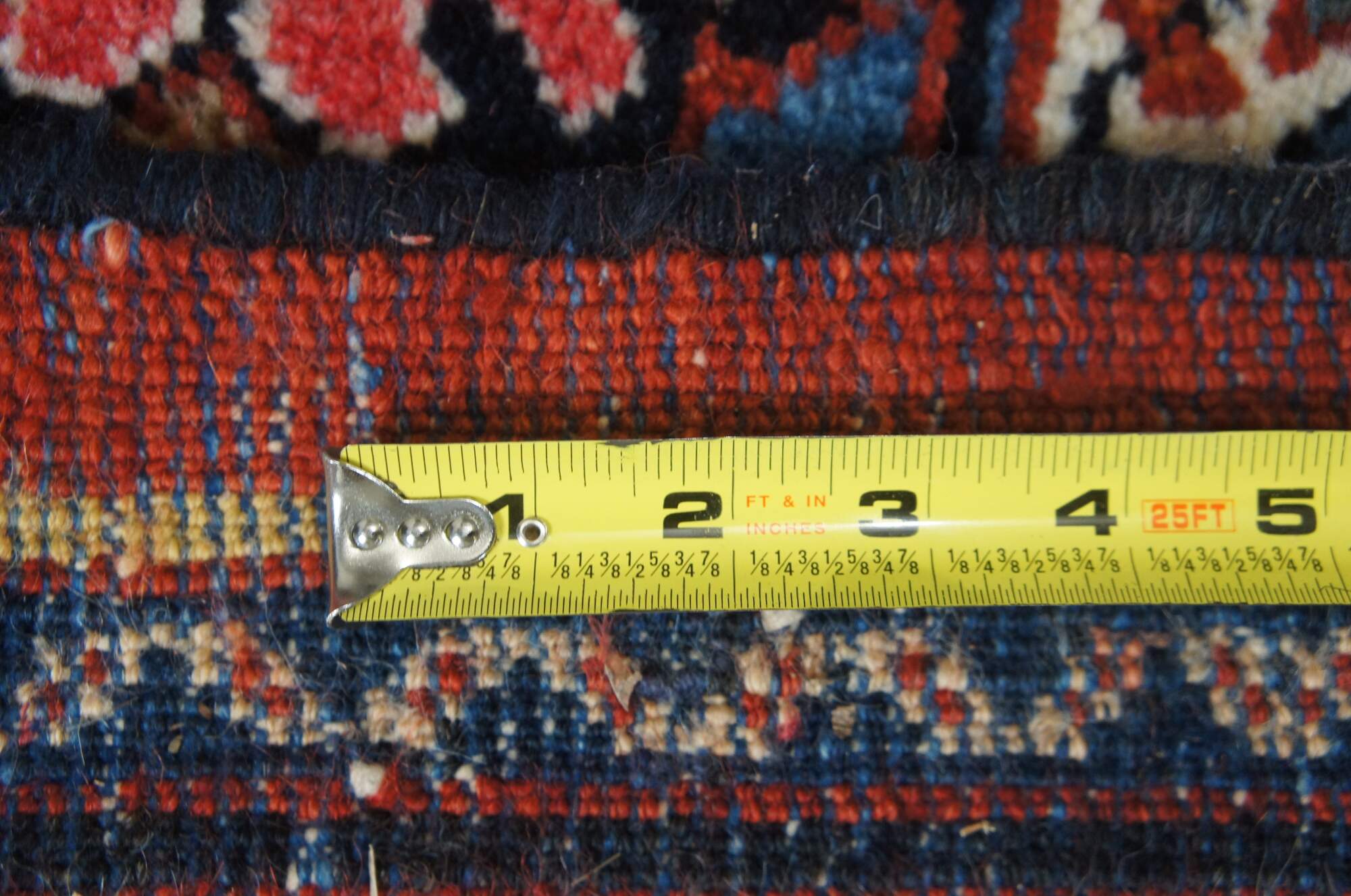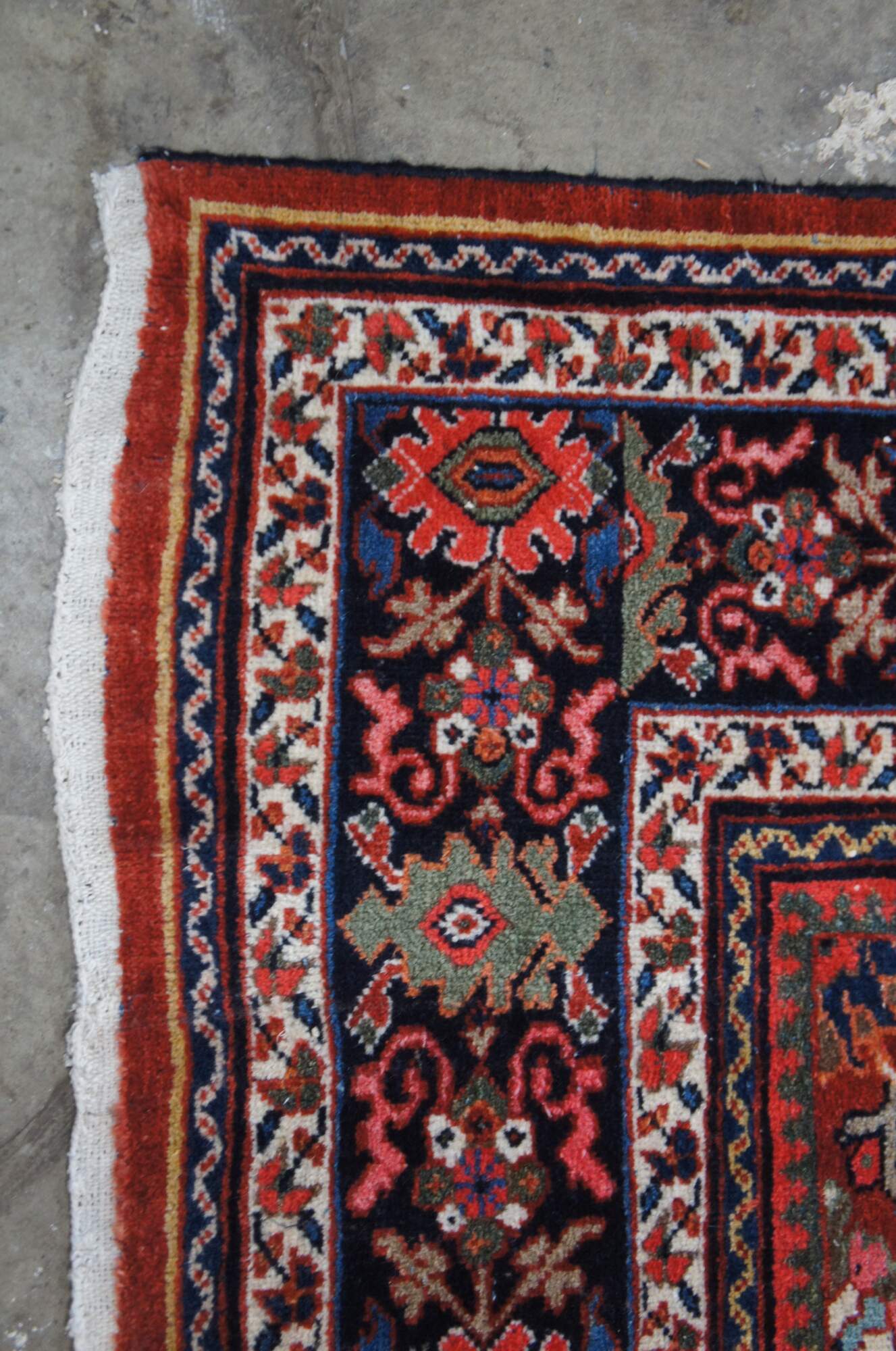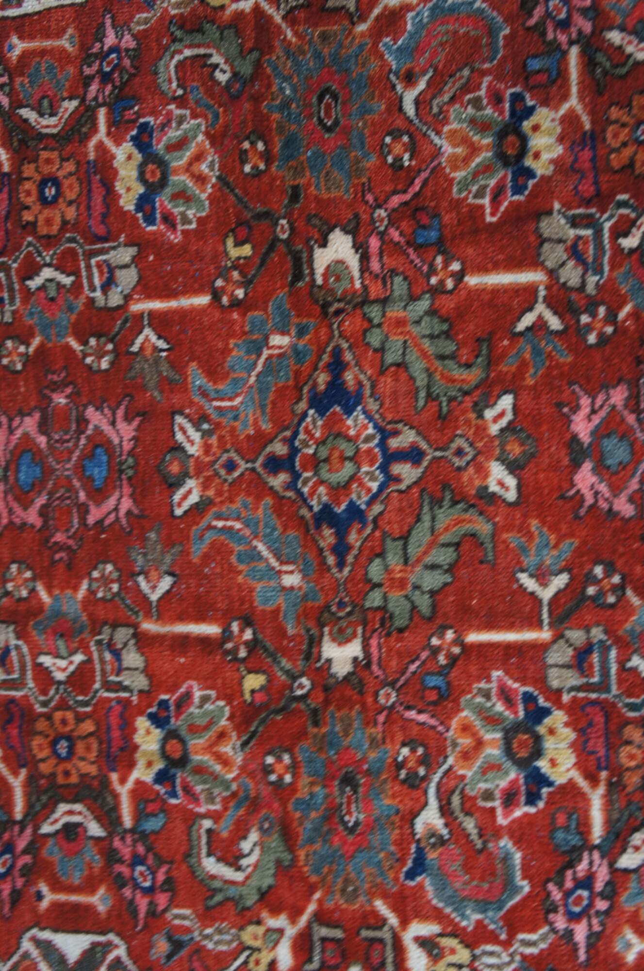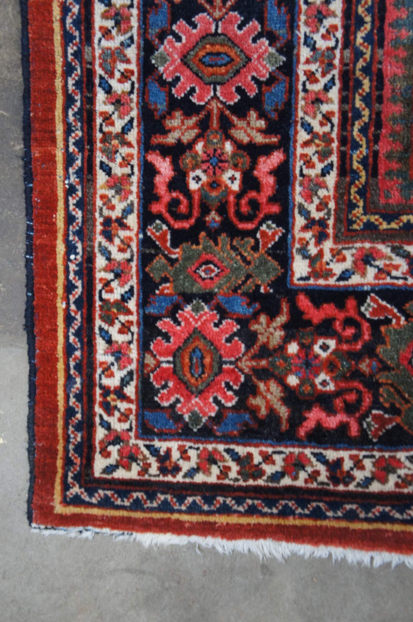 A large and Impressive oriental geometric woold area rug. Features a hand knotted pile with geometric foliate designs. The foreground of the rug is red with blue, green, beige and pink accents.