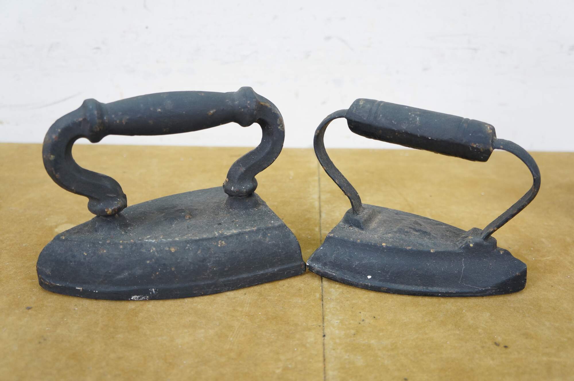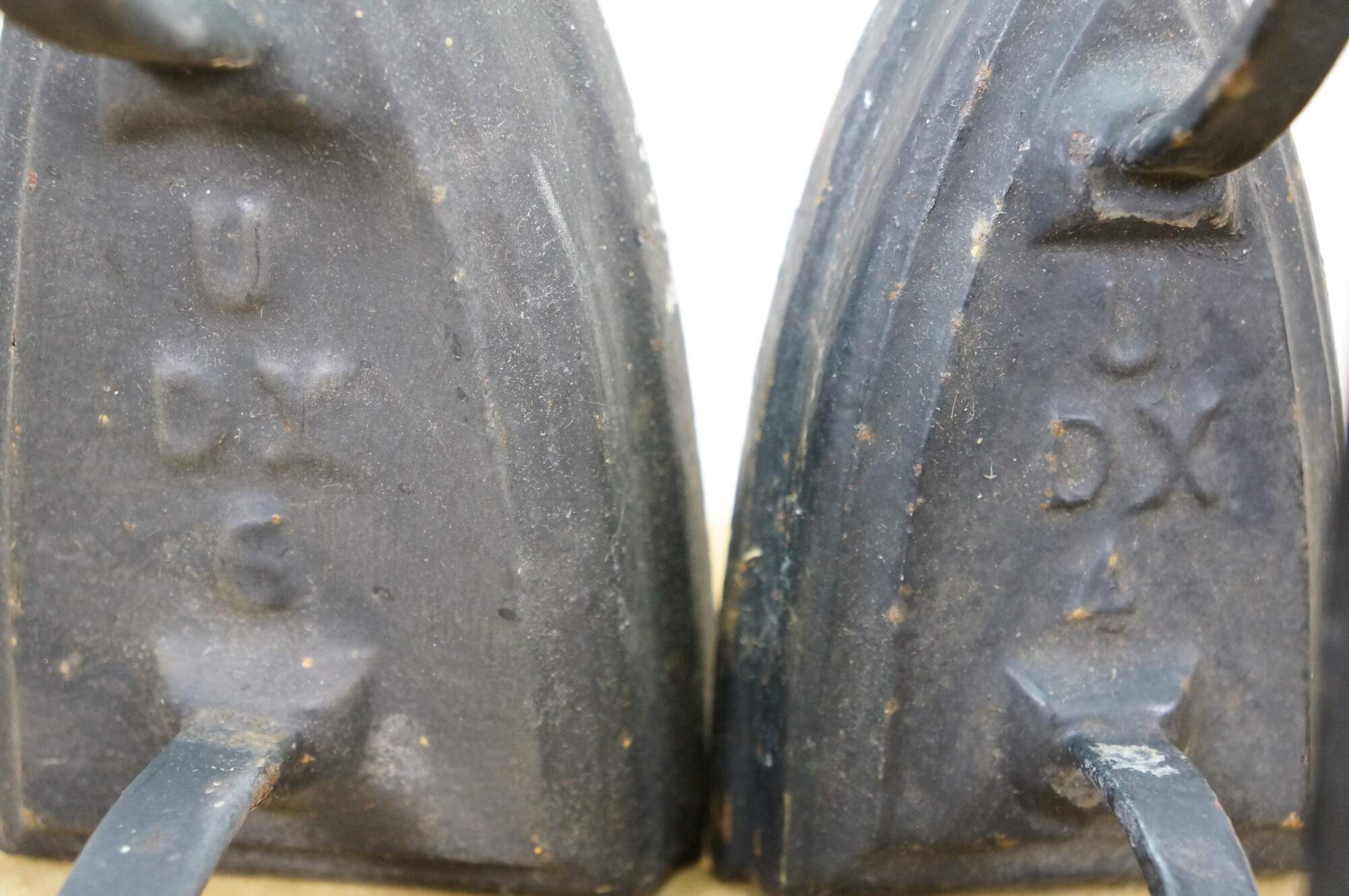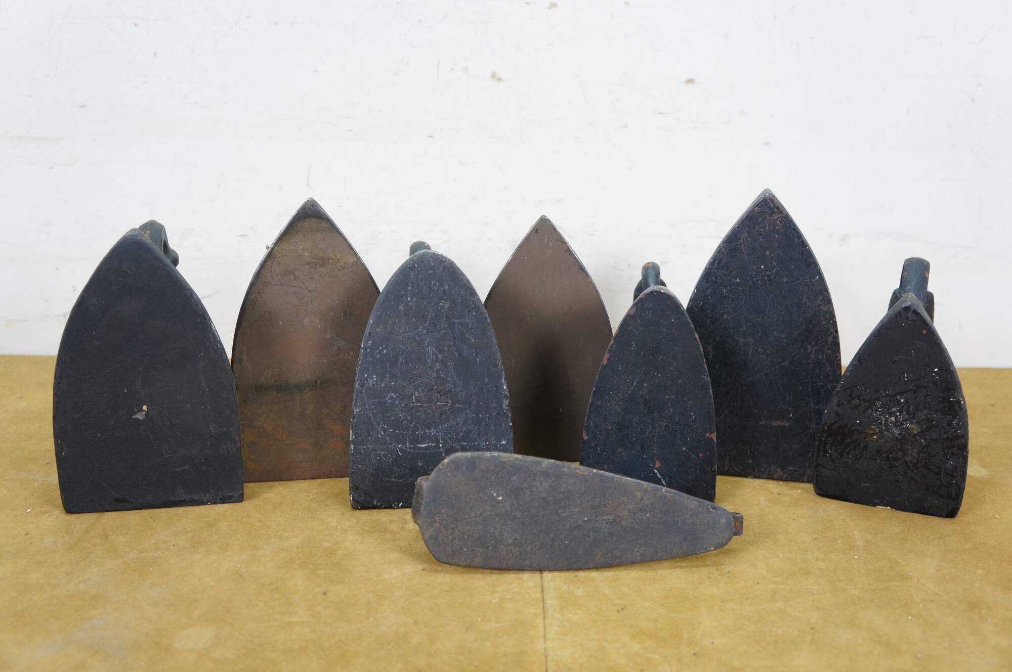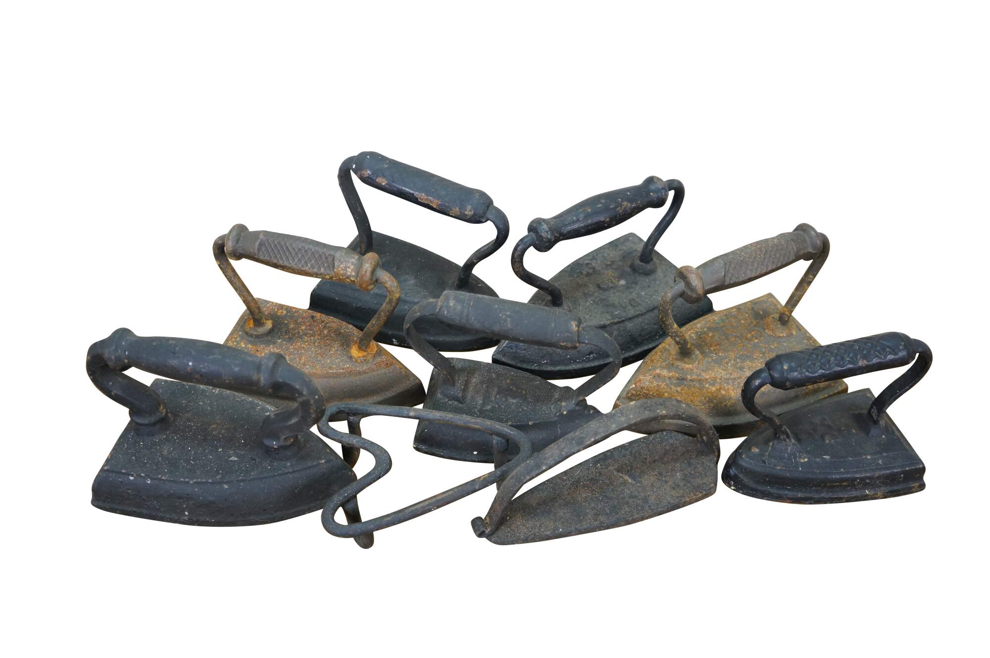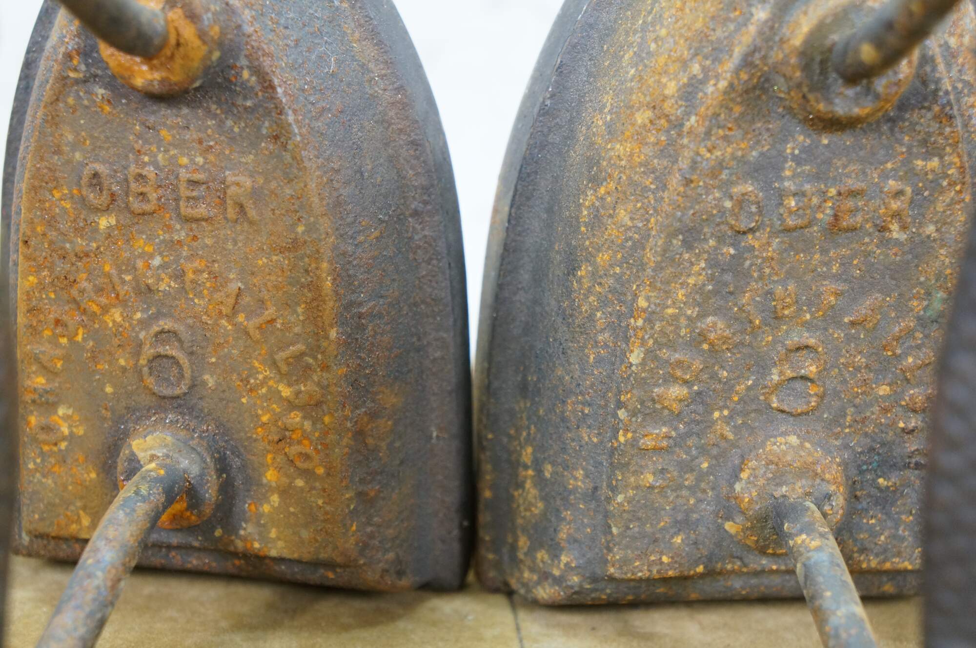 Lot of 8 late 19th to early 20th century sad irons / clothing irons and one wrought iron trivet. Includes one small hand forged iron, UDX No. 4 and No. 6, Ober No. 6 and No. 8, Downs & Co No. 8, and a No. 4 and No. 8 of unknown makers.