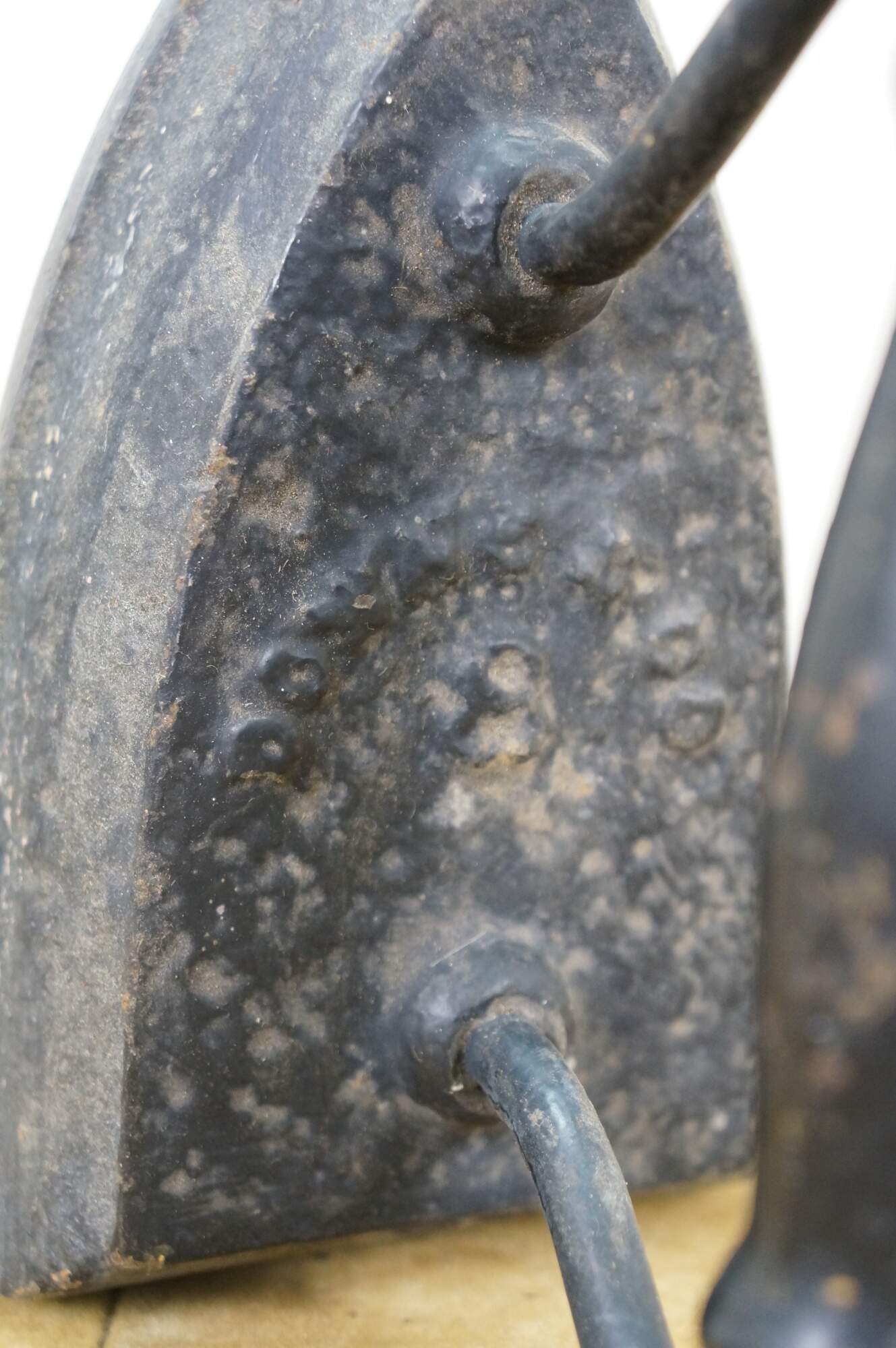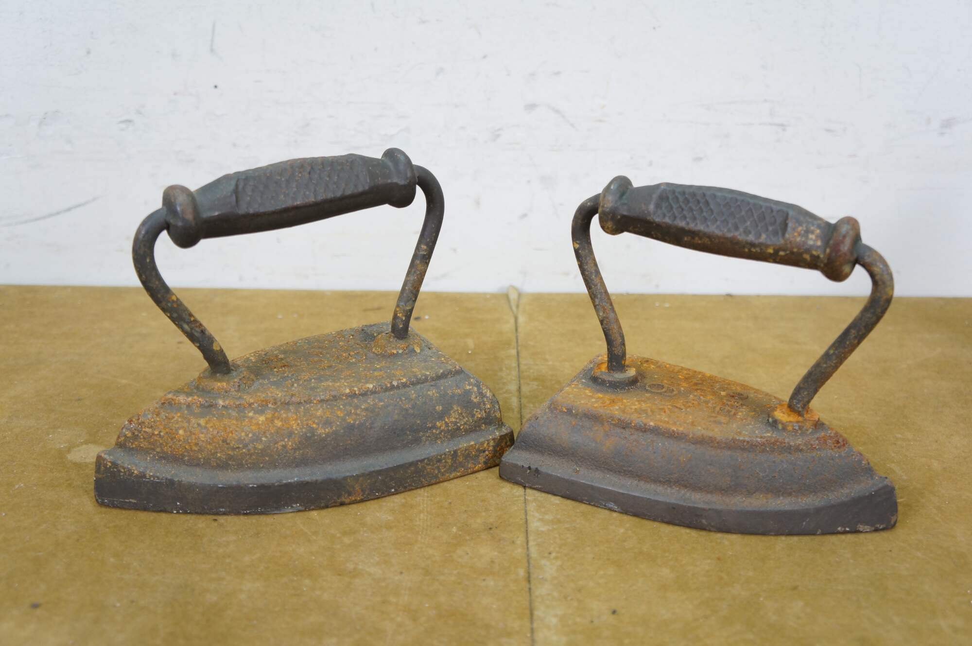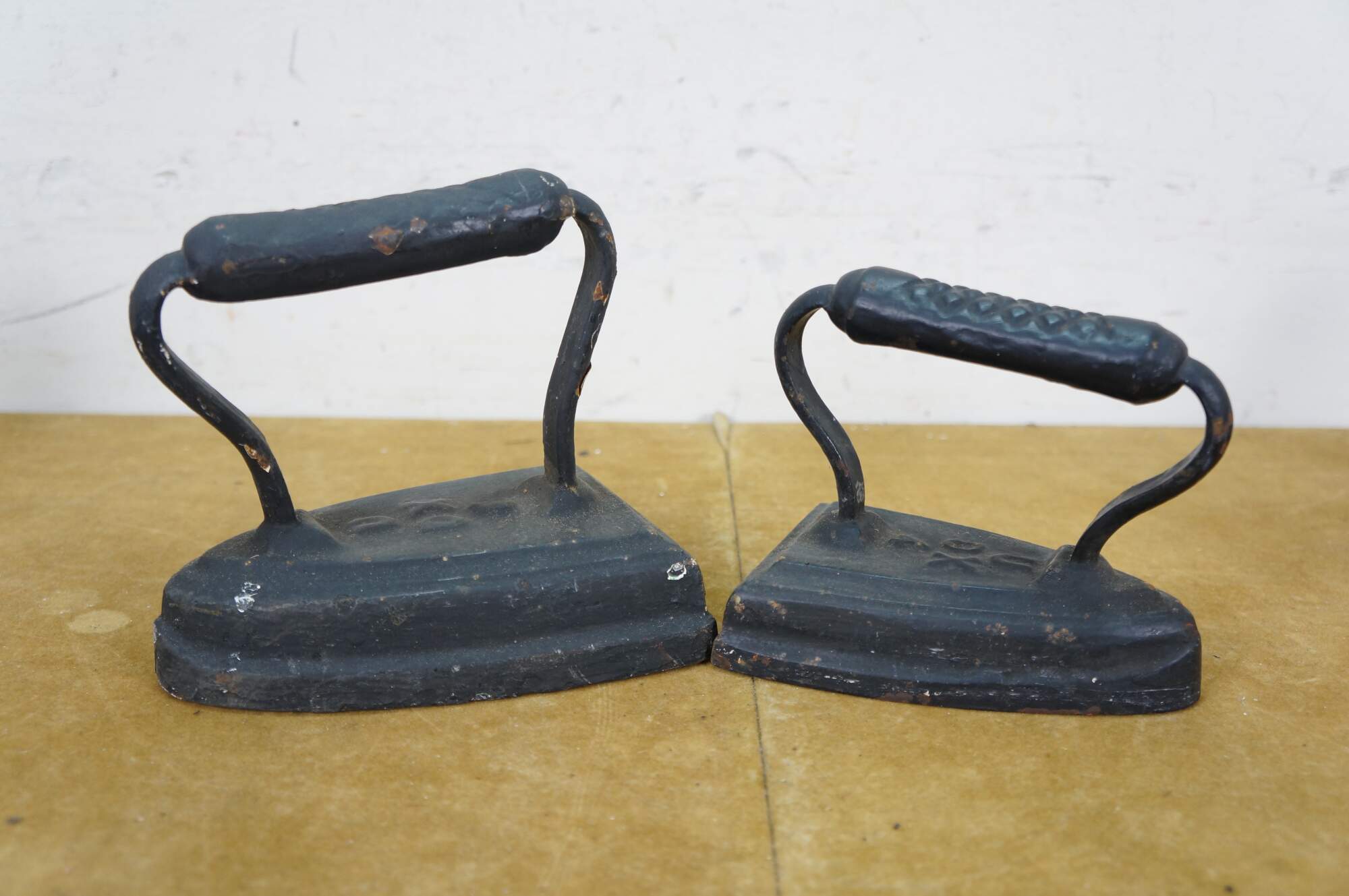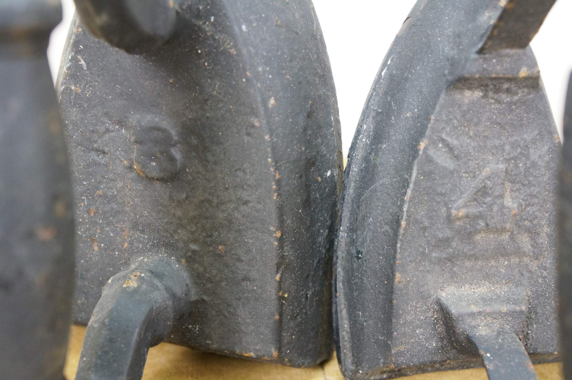 Lot of 8 late 19th to early 20th century sad irons / clothing irons and one wrought iron trivet. Includes one small hand forged iron, UDX No. 4 and No. 6, Ober No. 6 and No. 8, Downs & Co No. 8, and a No. 4 and No. 8 of unknown makers.