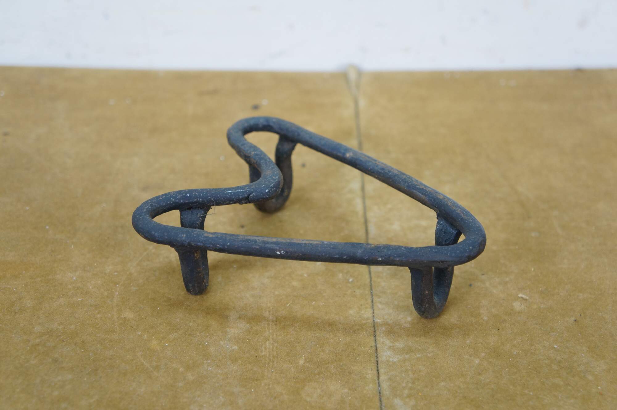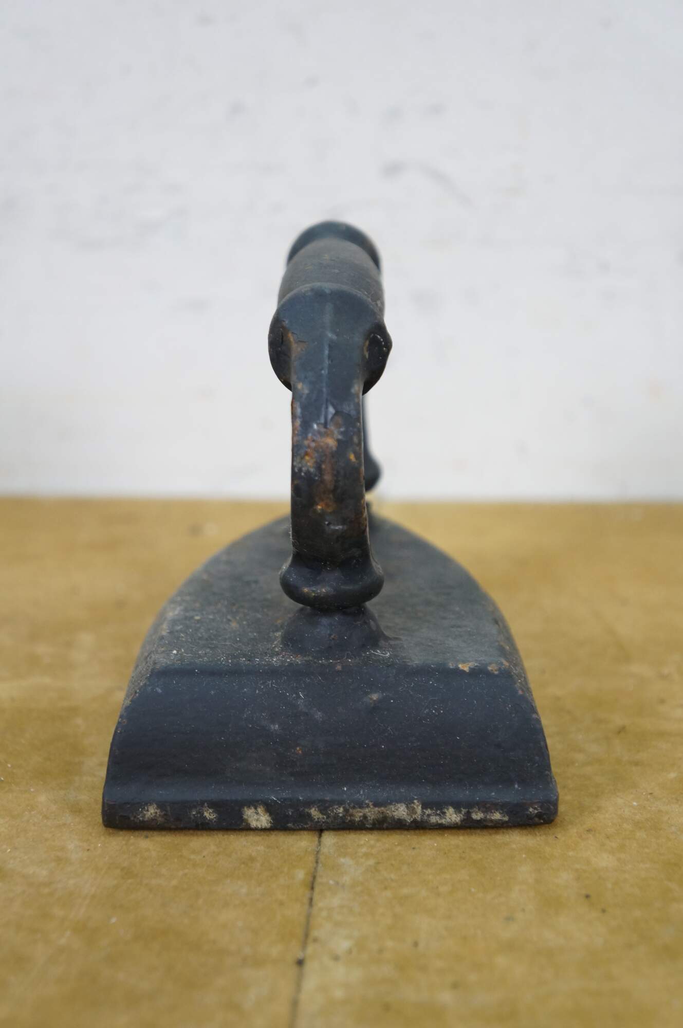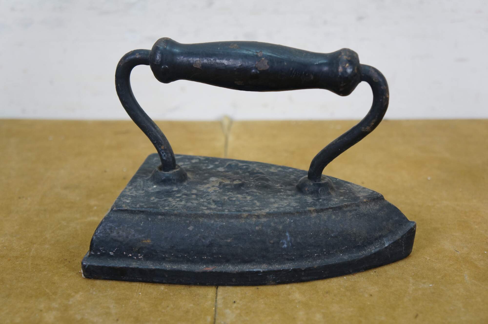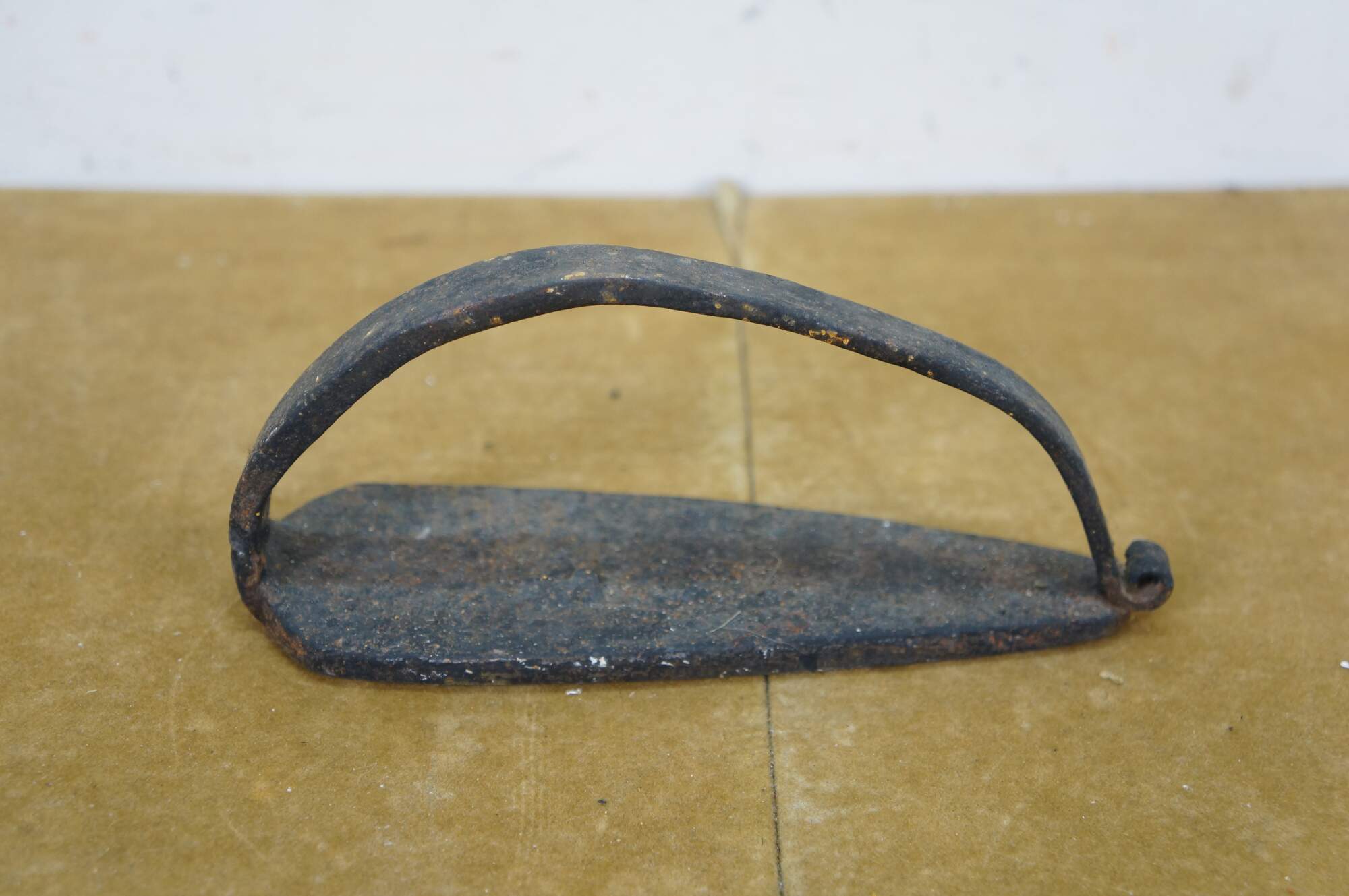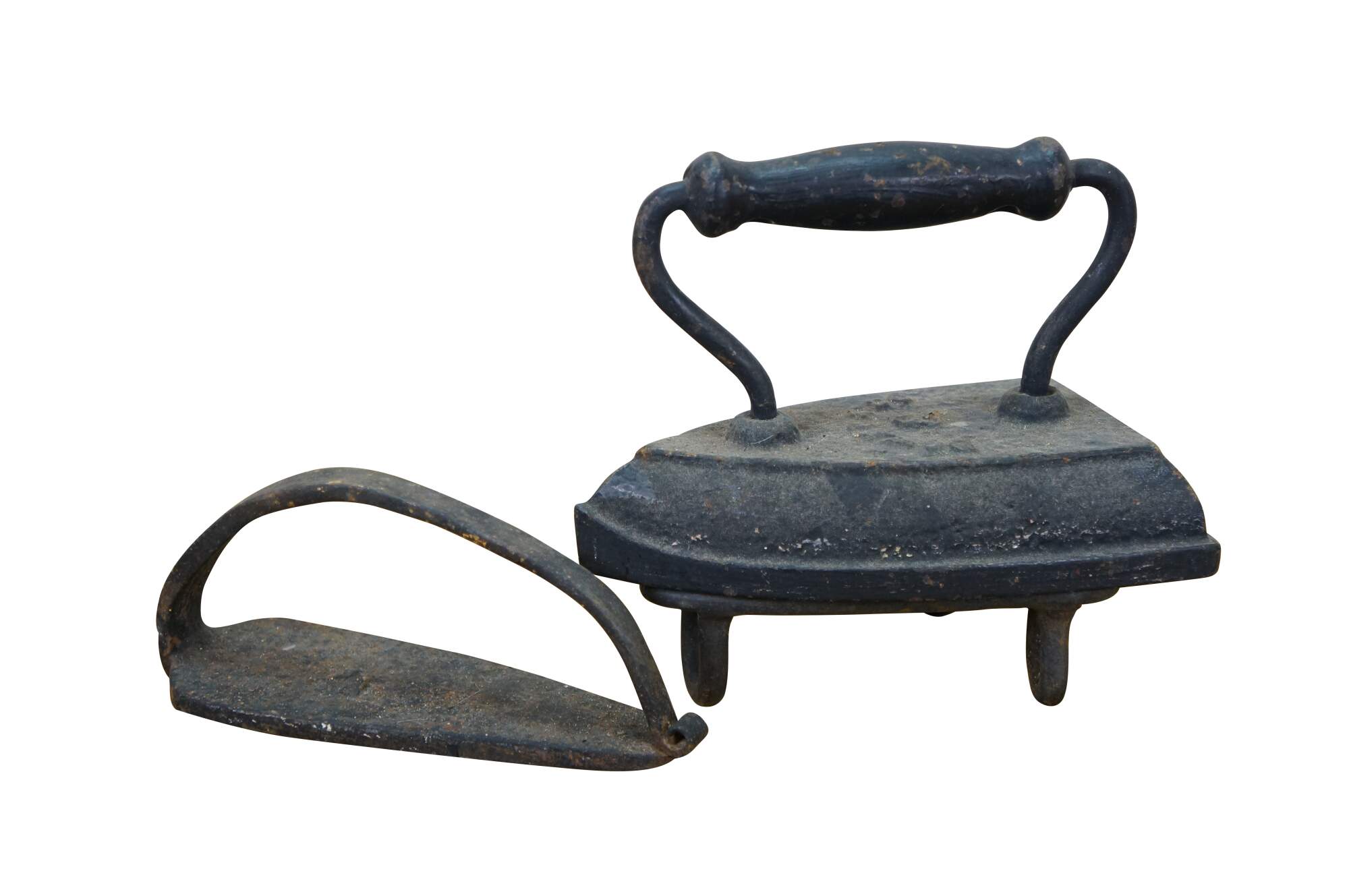 Lot of 8 late 19th to early 20th century sad irons / clothing irons and one wrought iron trivet. Includes one small hand forged iron, UDX No. 4 and No. 6, Ober No. 6 and No. 8, Downs & Co No. 8, and a No. 4 and No. 8 of unknown makers.