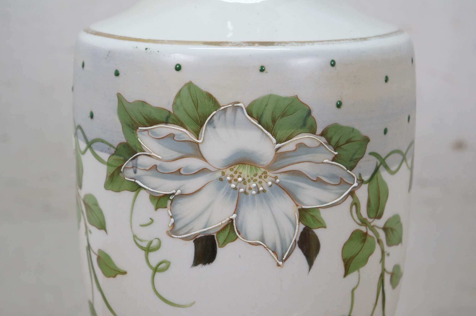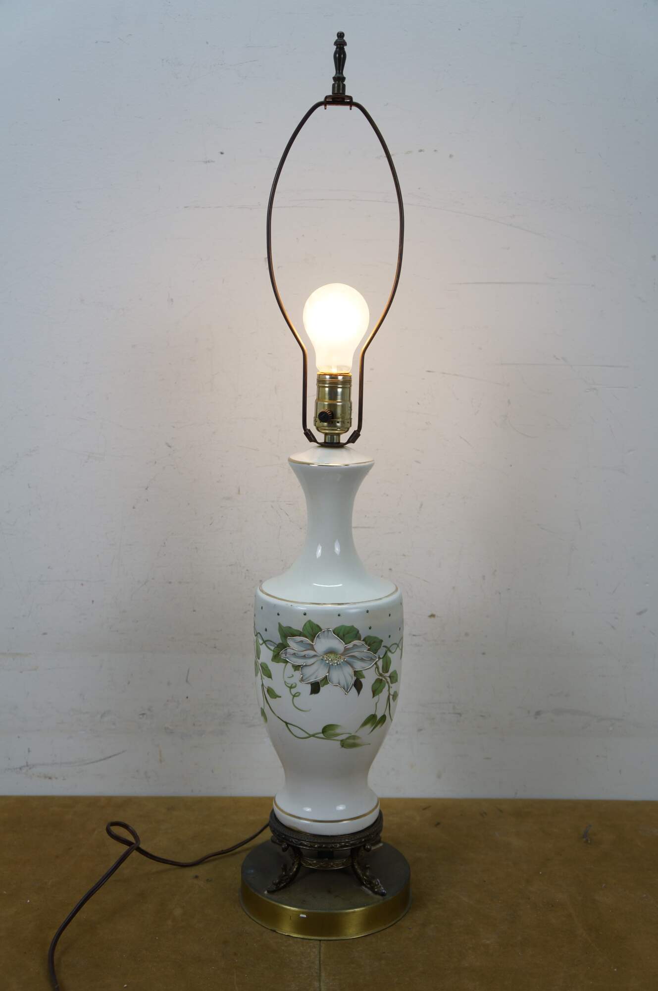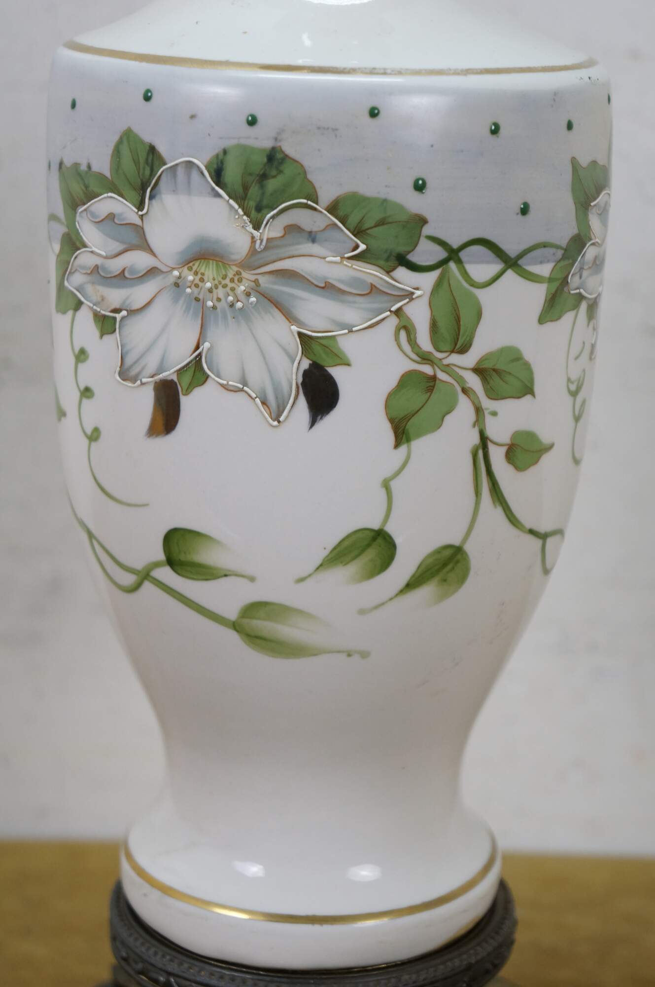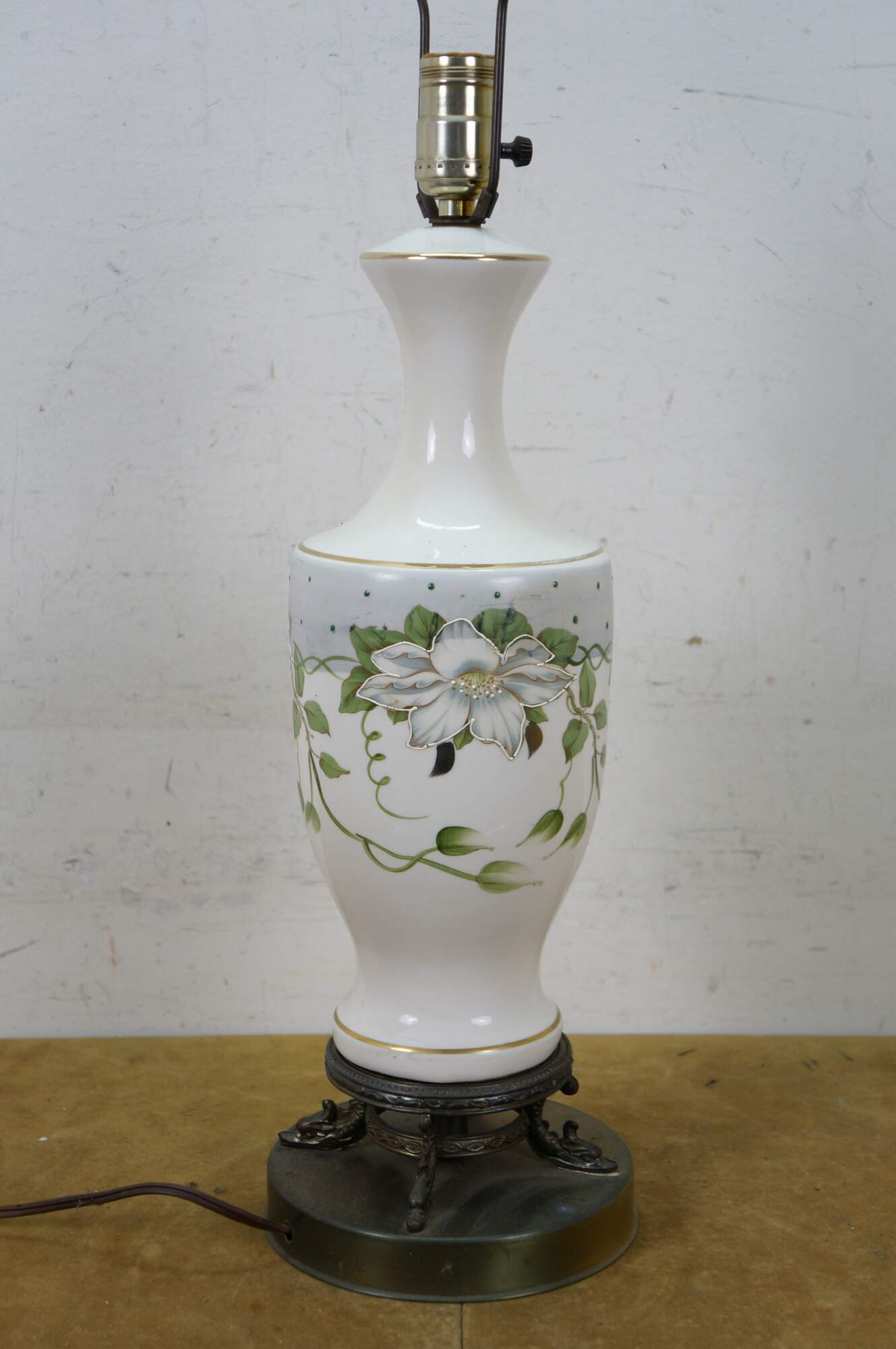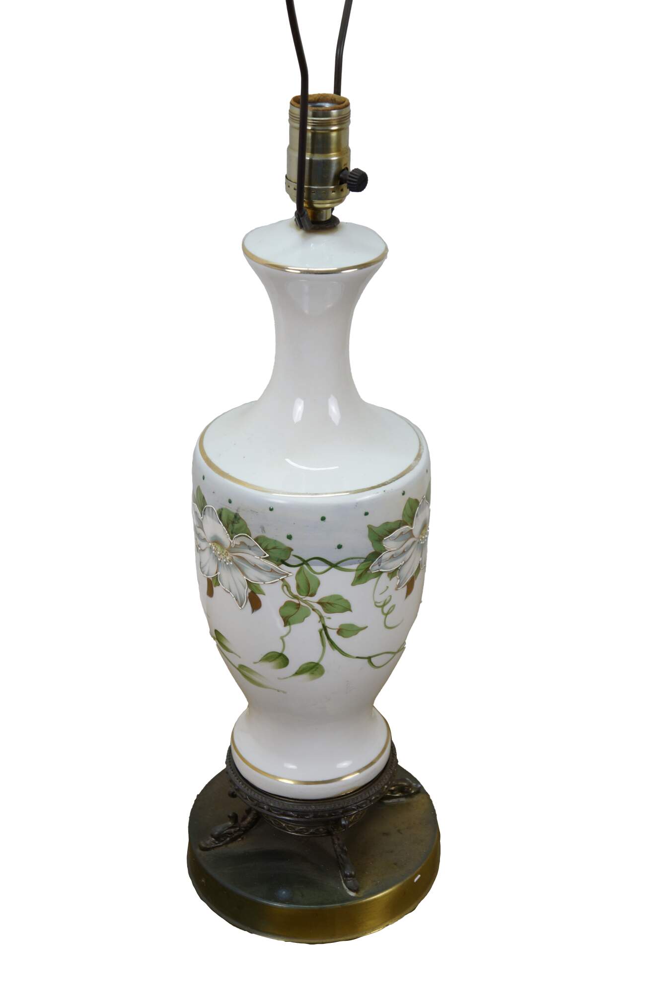 Early to mid 20th century white porcelain vase shaped table lamp, printed with a design of large white flowers and green vines, supported on a round brass base with dolphin / delphin / serpent head shaped feet. Includes harp anf brass finial.
