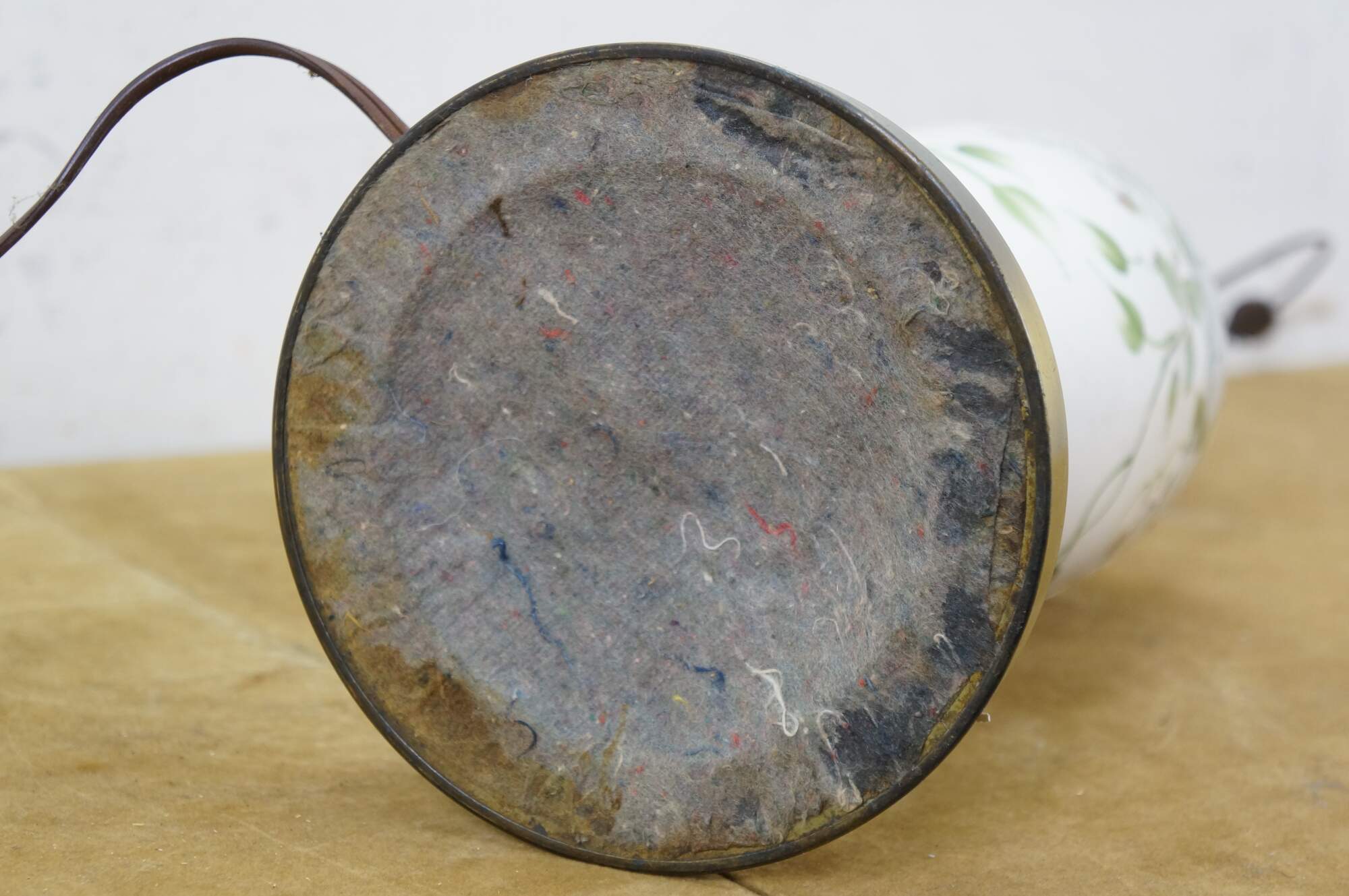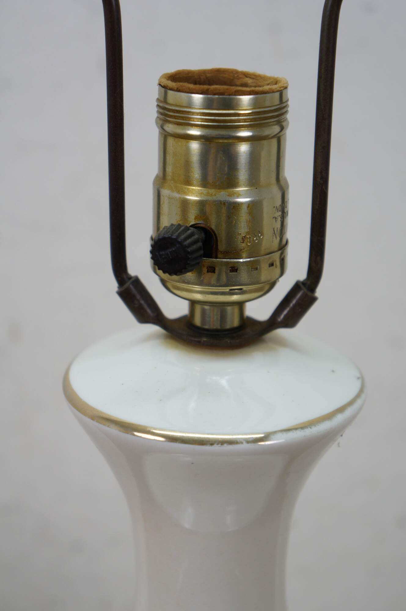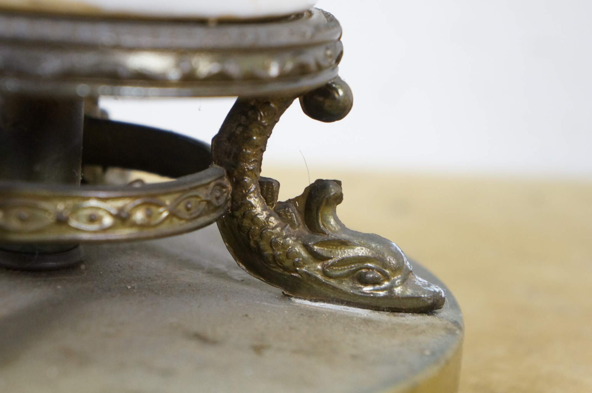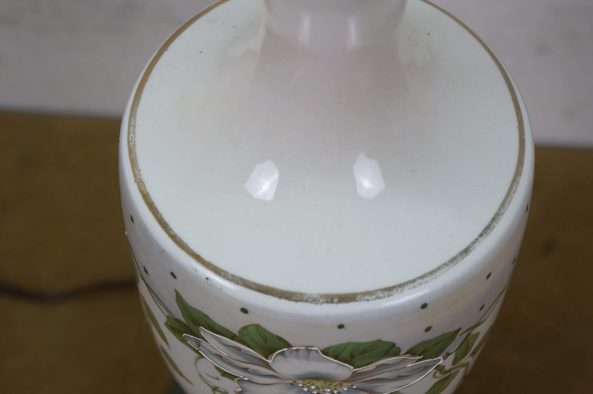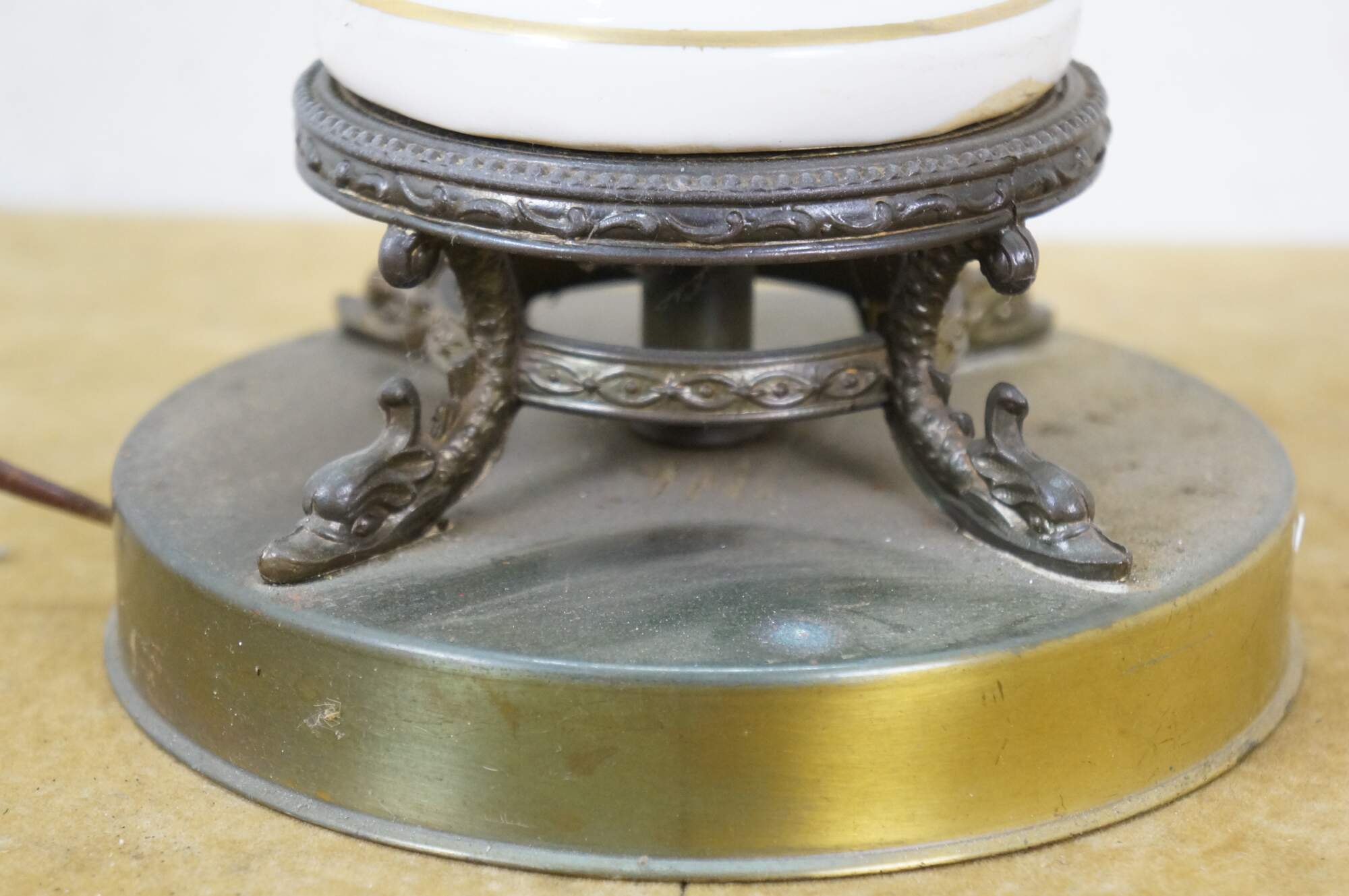 Early to mid 20th century white porcelain vase shaped table lamp, printed with a design of large white flowers and green vines, supported on a round brass base with dolphin / delphin / serpent head shaped feet. Includes harp anf brass finial.