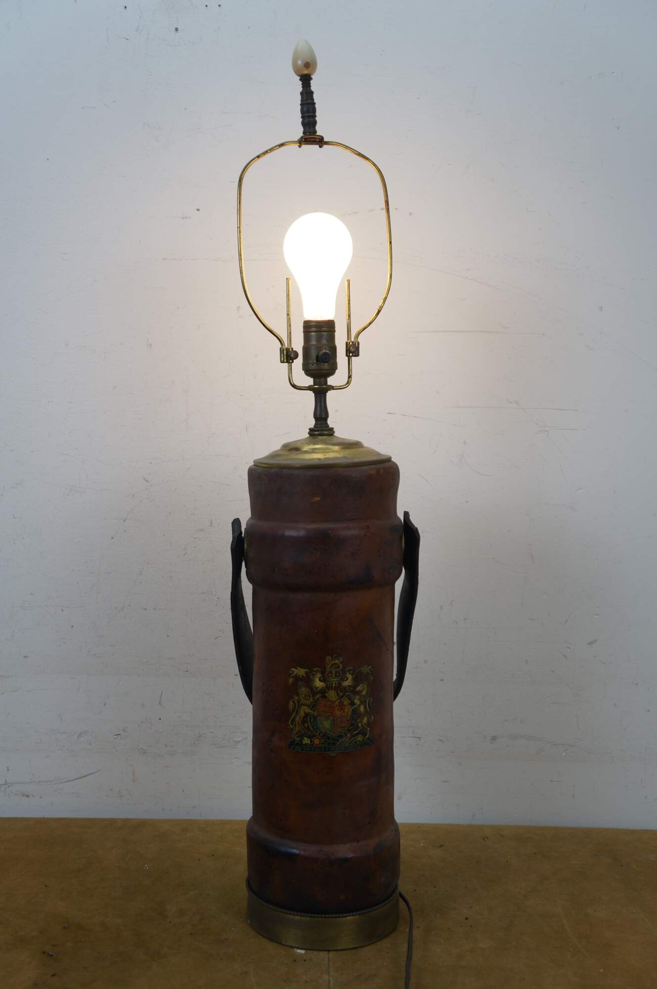 Vintage British Cordite bucket carry case. Made of leather featuring