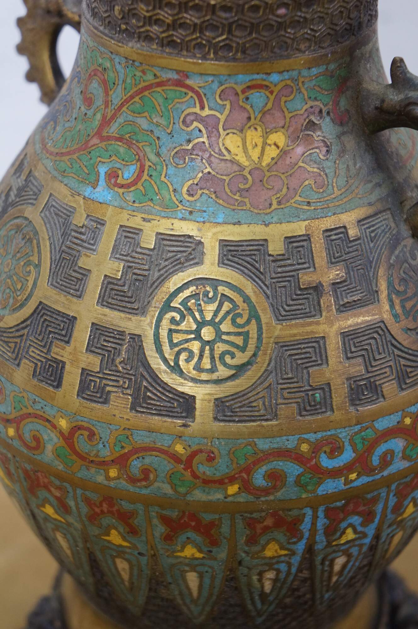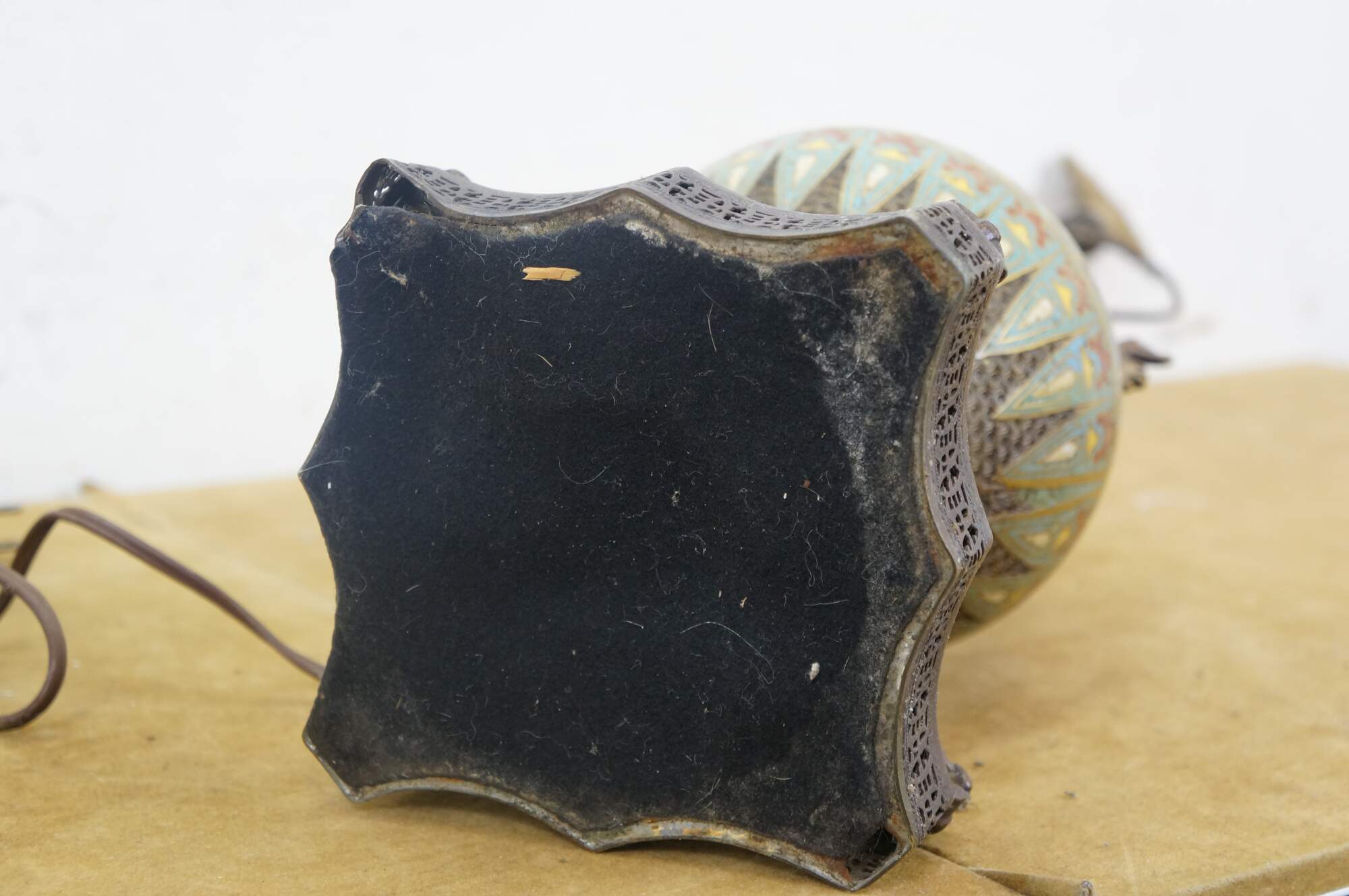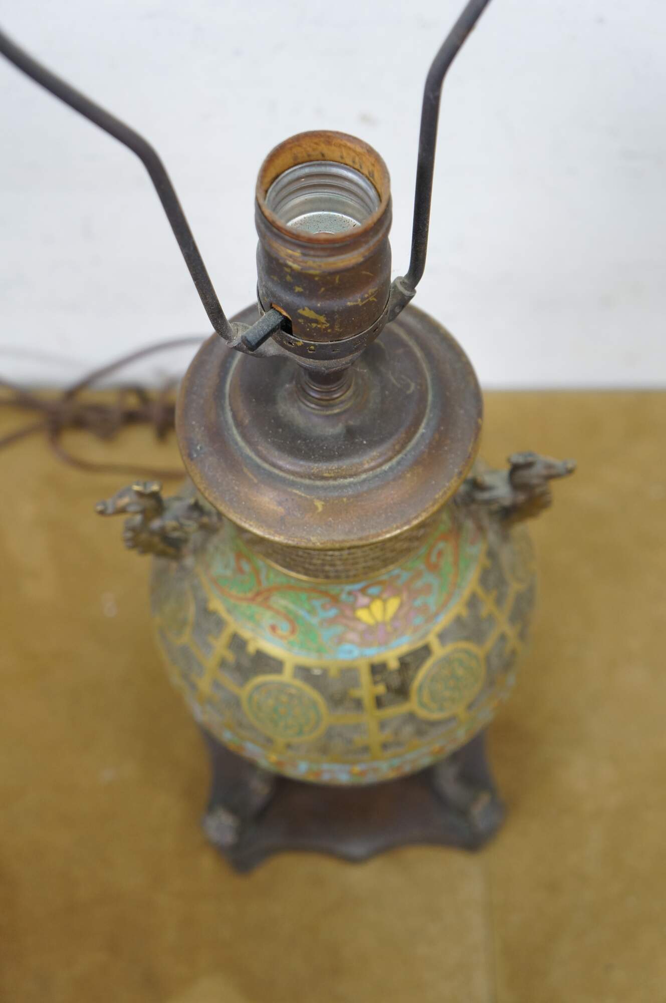 Antique Japanese champleve cloisonne enameled vase or urn, converted to a lamp mounted to a pierced / reticulated base with c scroll supports.